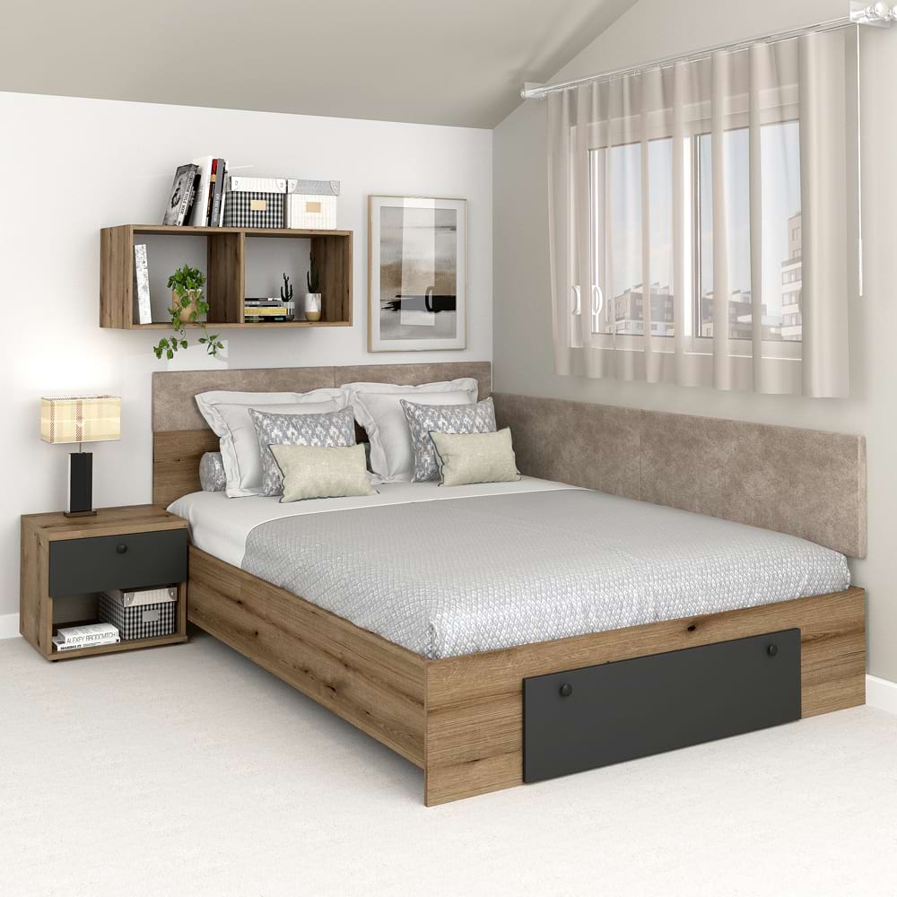 Patul colt AMBRO, 160x200cm cu sertar frontal si suport saltea FORTE inclus, realizat din Stejar si Antracit adauga un plus de estetica si functionalitate oricarei camere.Exclusiv Tamos! Pret de producator, livrare rapida si Gratuita! Caracteristici si avantajeMobilier kit, se livreaza demontat, ambalat in cutii de carton. Kitul contine schita montaj, feronerie, certificat garantie si conformitate.Montajul sertarului se poate face pe orice parte a patului.Suport saltea FORTE inclus. Suportul de saltea este realizat din suport susutinere metalic si elemente de PAL asezate la o distanta de aerisire de 3 cm.Suport de Saltea FORTE:Aerisire Optimizata – Elementele din PAL sunt asezate la o distanta de aerisire de 3 cm, asigurand o ventilare corespunzatoare atat a patului, cat si a saltelei. Aceasta caracteristica este esentiala pentru mentinerea unui mediu sanatos de somn, prevenind acumularea de umiditate si mucegaiRezistenta si Durabilitate la un pret exceptional – suportul de saltea FORTE este compus dintr-un lonjeron metalic robust si elemente din PAL dispuse strategic pentru a oferi o rezistenta superioara. Structura metalica asigura stabilitatea patului, eliminand riscul de deformare in timp, ceea ce se traduce intr-o durata de viata semnificativ imbunatatita.Lipsa Zgomotului – Construcția bine gandita a acestui sistem elimina orice scartait sau sunet deranjant, oferind un somn linistit si confortabil in fiecare noapte. Lonjeronul metalic este solid prins pe structura patului si se sprijina pe pardoseala pe doua picioare reglabile cu talpa PVC. Dimensiuni pat AMBROPat AMBRO 160x200cmDimensiuni interioare: 161x201cmDimensiuni exterioare: 164x205cmInaltime tablie mare: 89cmInaltime cadru pat: 37cmPlaca tapitata H = 36cm MaterialePAL dublu melaminat 16mm Stejar, AntracitCant ABS 1 mm (carcasa) Garantie producator 24 luni Transport GRATUIT in toata tara*NOTA* Imaginile afisate sunt doar pentru scopuri ilustrative. Dimensiunile reale ale produsului pot diferi usor fata de cele prezentate. De asemenea, culorile pot varia in functie de setarile dispozitivului dvs. Va rugam sa verificati specificatiile produsului pentru detalii exacte,*Noptierele, dulapul suspendat, salteaua de pat, lenjeria si celelalte acesorii din imagine nu sunt incluse in pret….
