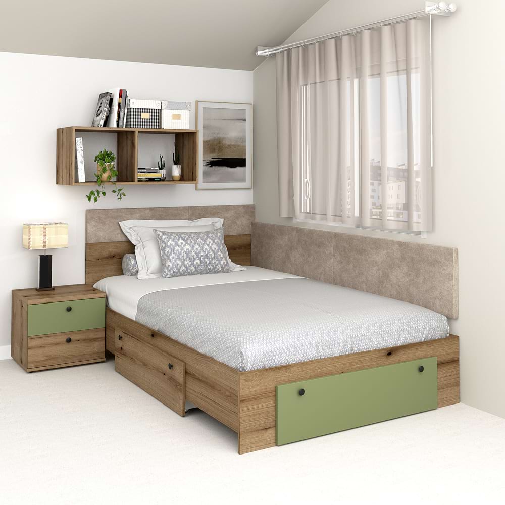Patul colt de o persoana AMBRO, 120x200cm cu 2 sertare si suport saltea FORTE inclus, realizat din Stejar si Pesto adauga un plus de estetica si functionalitate oricarei camere.Exclusiv Tamos! Pret de producator, livrare rapida si Gratuita! Caracteristici si avantajeMobilier kit, se livreaza demontat, ambalat in cutii de carton. Kitul contine schita montaj, feronerie, certificat garantie si conformitateSuport saltea FORTE inclus. Suportul de saltea este realizat din suport susutinere metalic si elemente de PAL asezate la o distanta de aerisire de 3 cm.Suport de Saltea FORTE:Aerisire Optimizata – Elementele din PAL sunt asezate la o distanta de aerisire de 3 cm, asigurand o ventilare corespunzatoare atat a patului, cat si a saltelei. Aceasta caracteristica este esentiala pentru mentinerea unui mediu sanatos de somn, prevenind acumularea de umiditate si mucegaiRezistenta si Durabilitate la un pret exceptional – suportul de saltea FORTE este compus dintr-un lonjeron metalic robust si elemente din PAL dispuse strategic pentru a oferi o rezistenta superioara. Structura metalica asigura stabilitatea patului, eliminand riscul de deformare in timp, ceea ce se traduce intr-o durata de viata semnificativ imbunatatita.Lipsa Zgomotului – Construcția bine gandita a acestui sistem elimina orice scartait sau sunet deranjant, oferind un somn linistit si confortabil in fiecare noapte. Lonjeronul metalic este solid prins pe structura patului si se sprijina pe pardoseala pe doua picioare reglabile cu talpa PVC. Dimensiuni pat AMBROPat AMBRO 120x200cmDimensiuni interioare: 121x201cmDimensiuni exterioare: 124x205cmInaltime tablie mare: 89cmInaltime cadru pat: 37cm MaterialePAL dublu melaminat 16mm Stejar, PestoCant ABS 1 mm (carcasa)Laterala perete tapitata cu piele eco texturata Bej Garantie producator 24 luni Transport GRATUIT in toata tara*NOTA* Imaginile afisate sunt doar pentru scopuri ilustrative. Dimensiunile reale ale produsului pot diferi usor fata de cele prezentate. De asemenea, culorile pot varia in functie de setarile dispozitivului dvs. Va rugam sa verificati specificatiile produsului pentru detalii exacte,*Noptierele, dulapul suspendat, salteaua de pat, lenjeria si celelalte acesorii din imagine nu sunt incluse in pret….