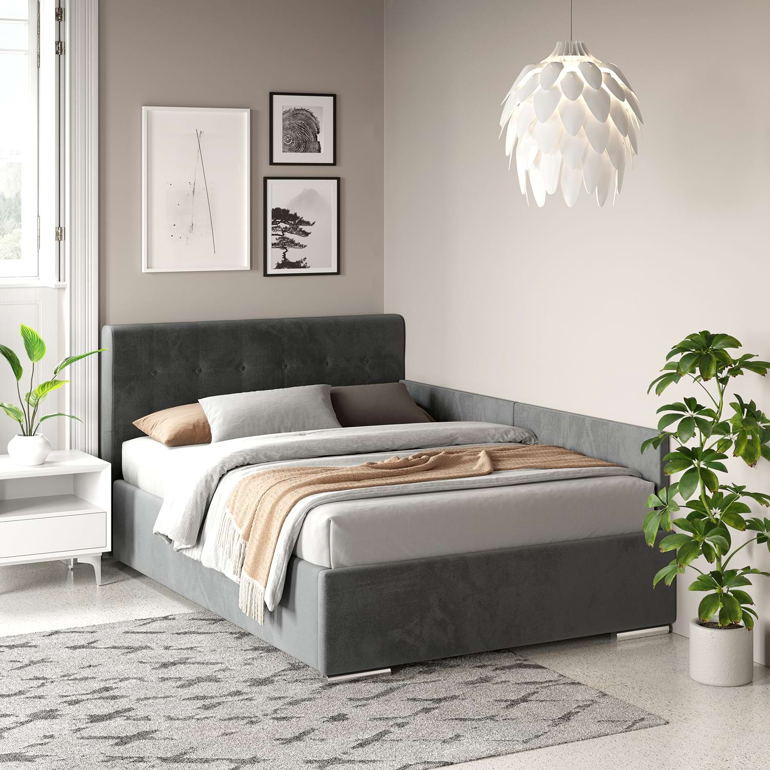 Patul de colt tapitat GEORGIA Clasic, 160×200, cu somiera rabatabila si lada depozitare, husat cu catifea Gri are un design modern si robust. Tablia patului este un element distinctiv, formata din patrate tapitate care adauga un efect vizual interesant si un plus de confort.Patul dispune de o somiera rabatabila, oferind spatiu de depozitare dedesubt. Solutia de colt e asigurata cu Kit laterale tapitate pat – din 2 placi tapitate, cu prindere pe perete (INCLUS) sau cu prindere pe laterala patului cu sisteme metalice (OPTIONAL-Contra cost)Exclusiv TAMOS! Pret de producator , livrare rapida si Gratuita ! Configurabilconfigurezi husa (catifea, stofa)configurezi dimensiune pat – 140cm, 160cm, 180cmconfigurezi complemente – asezare pe coltul camerei, saltele, noptiere, comode, dulapuri AvantajeCONFORT – Combinand armonios rigoarea geometrica a tabliei cu formele arcuite pe care le creaza buretele folosit din belsug, patul Georgia da nastere unui stil personal si cald.Incadrandu-se cu succes in orice stil de amenajare, realizeaza combinatii valoroase cu mobilierul din lemn, furniruri sau placaje.FUNCTIONALITATE – Patul tapitat Georgia Clasic contine o somiera metalica ranfortata, compusa din lamele arcuite din fag, montate pe un cadru metalic foarte solid. Sistemul de ridicare compus din balamale si amortizoare cu gaz vin sa completeze fiabilitatea suportului de saltea. Compartimentul de depozitare generos si complet tapitat iti va organiza si iti va sistematiza spatiul din dormitor.REZISTENTA – Pentru o rezistenta fara cusur, am proiectat pentru patul Georgia Clasic un sistem metalic ce sustine fundurile de pat distantate de sol si rigidizeaza cadrul patului. In plus, o bara de rigidizare metalica dispusa transversal sprijina somiera in starea de repaus si impiedica deformarea lateralelor patului in timp. Sistemul permite o aerisire corecta a saltelei si a lucrurilor ce se depoziteaza in lada patului.Mobilier kit, se livreaza demontat, ambalat in cutii de cartonKitul contine schita montaj, feronerie, certificat garantie si conformitateSomiera metalica cu lamele arcuite din fagPistoane cu gaz (amortizoare)Spatiu depozitare sub somiera cu structura metalica, distanta de pardoseala si suport depozitare tapitat integralKit laterale tapitate pat – din 2 placi tapitate, cu prindere pe perete (INCLUS) sau cu prindere pe laterala patului cu sisteme metalice (OPTIONAL-Contra cost)Picioare cromateCusaturi de tapiterie cu banda de intarire Dimensiuni pat Georgia Clasic 160x200cmDimensiuni interioare: 161x201cmDimensiuni exterioare: 170x217cmInaltime tablie mare: 107cmInaltime cadru pat: 37cmInaltime de la sol: 4cmPlaca tapitata H = 36cm Texturi / culori disponibilecatifea Gri Garantie 24 luni Livrare Gratuita. Manipularea produsului nu este inclusa, produsul se preia de la masina. *NOTA* Imaginile afisate sunt doar pentru scopuri ilustrative. Dimensiunile reale ale produsului pot diferi usor fata de cele prezentate. De asemenea, culorile pot varia in functie de setarile dispozitivului dvs. Va rugam sa verificati specificatiile produsului pentru detalii exacte si sa va asigurati ca este decorul dorit.*Noptiera, salteaua de pat, lenjeria si celelalte acesorii din imagine nu sunt incluse in pret….