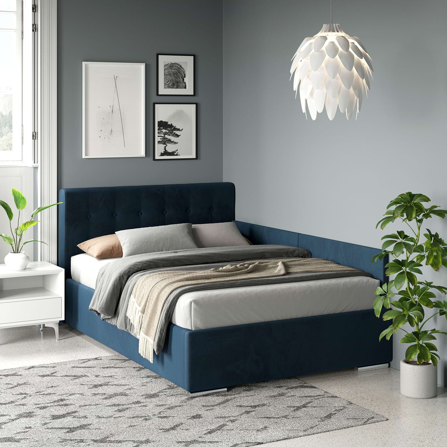 Patul de colt tapitat GEORGIA Clasic, 180×200, H 107 cu somiera rabatabila si lada depozitare, husat cu catifea Albastra are un design modern si robust. Tablia patului este un element distinctiv, formata din patrate tapitate care adauga un efect vizual interesant si un plus de confort.Patul dispune de o somiera rabatabila, oferind spatiu de depozitare dedesubt. Solutia de colt e asigurata cu Kit laterale tapitate pat – din 2 placi tapitate, cu prindere pe perete (INCLUS) sau cu prindere pe laterala patului cu sisteme metalice (OPTIONAL-Contra cost)Exclusiv TAMOS! Pret de producator , livrare rapida si Gratuita ! Configurabilconfigurezi husa (piele ecologica, piele texturata, catifea, stofa)configurezi dimensiune pat – 140cm, 160cm, 180cmconfigurezi complemente – asezare pe coltul camerei, saltele, noptiere, comode, dulapuri AvantajeCONFORT – Combinand armonios rigoarea geometrica a tabliei cu formele arcuite pe care le creaza buretele folosit din belsug, patul Georgia da nastere unui stil personal si cald.Incadrandu-se cu succes in orice stil de amenajare, realizeaza combinatii valoroase cu mobilierul din lemn, furniruri sau placaje.FUNCTIONALITATE – Patul tapitat Georgia Clasic contine o somiera metalica ranfortata, compusa din lamele arcuite din fag, montate pe un cadru metalic foarte solid. Sistemul de ridicare compus din balamale si amortizoare cu gaz vin sa completeze fiabilitatea suportului de saltea. Compartimentul de depozitare generos si complet tapitat iti va organiza si iti va sistematiza spatiul din dormitor.REZISTENTA – Pentru o rezistenta fara cusur, am proiectat pentru patul Georgia Clasic un sistem metalic ce sustine fundurile de pat distantate de sol si rigidizeaza cadrul patului. In plus, o bara de rigidizare metalica dispusa transversal sprijina somiera in starea de repaus si impiedica deformarea lateralelor patului in timp. Sistemul permite o aerisire corecta a saltelei si a lucrurilor ce se depoziteaza in lada patului.Mobilier kit, se livreaza demontat, ambalat in cutii de cartonKitul contine schita montaj, feronerie, certificat garantie si conformitateSomiera metalica cu lamele arcuite din fagPistoane cu gaz (amortizoare)Spatiu depozitare sub somiera cu structura metalica, distanta de pardoseala si suport depozitare tapitat integralKit laterale tapitate pat – din 2 placi tapitate, cu prindere pe perete (INCLUS) sau cu prindere pe laterala patului cu sisteme metalice (OPTIONAL-Contra cost)Picioare cromateCusaturi de tapiterie cu banda de intarire Dimensiuni pat Georgia Clasic 180x200cmDimensiuni interioare: 181x201cmDimensiuni exterioare: 190x217cmInaltime tablie mare: 107cmInaltime cadru pat: 37cmInaltime de la sol: 4cmPlaca tapitata H = 36cm Texturi / culori disponibilecatifea Albastra Garantie 24 luni Livrare Gratuita. Manipularea produsului nu este inclusa, produsul se preia de la masina. *NOTA* Imaginile afisate sunt doar pentru scopuri ilustrative. Dimensiunile reale ale produsului pot diferi usor fata de cele prezentate. De asemenea, culorile pot varia in functie de setarile dispozitivului dvs. Va rugam sa verificati specificatiile produsului pentru detalii exacte si sa va asigurati ca este decorul dorit.*Noptiera, salteaua de pat, lenjeria si celelalte acesorii din imagine nu sunt incluse in pret….