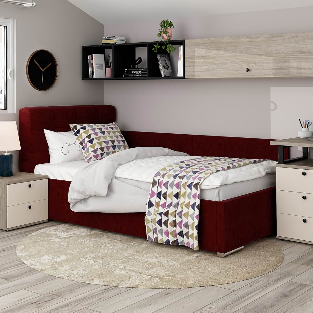 <p>Pat de colt tapitat copii GEORGIA din catifea Rosu Grena, dimensiuni 90x200cm sau 120×200 cm, cu somiera rabatabila si lada de depozitare – raport excelent Calitate / Pret!<br></p><p><span style="color: rgb(36, 64, 97);"></span></p><p>Rezistenta acestui pat nu limiteaza doar la utilizarea de catre copii, patul GEORGIA este o solutie excelenta chiar si pentru adulti.</p><p><b><span style="color: rgb(36, 64, 97);">Fabricat de TAMOS | Livrare Gratuita | Garantie Producator |</span></b></p><p><img src="https://www2.tamos.ro/images/companies/1/Icons%20TAMOS/untitled%20folder/Produs%20configurabil%2050%20opt.png?1663680883771" alt="Pat configurabil" title="Pat configurabil" style="cursor: pointer;"> <span style="color: rgb(36, 64, 97);"><b>Pat configurabil</b></span></p><ul><li>configurezi husa (catifea, piele ecologica, stofa, piele texturata)</li><li>configurezi dimensiuni</li><li>configurezi complemente din acelasi material (noptiere, taburete si lazi depozitare)</li></ul><figure><img src="https://www2.tamos.ro/images/companies/1/Icons%20TAMOS/untitled%20folder/Mobilier%20kit%2050%20opt.png?1663680993744" alt="Avantaje" title="Avantaje" style="cursor: pointer;"> <b><span style="color: rgb(36, 64, 97);">Avantaje</span></b></figure><ul><li>Mobilier kit, se livreaza demontat, ambalat in cutii de carton</li><li>Kitul contine schita montaj, feronerie, certificat garantie si conformitate</li><li>Patul se poate amplasa pe orice colt al camerei</li><li>Kit laterale tapitate pat – din 2 placi tapitate, cu prindere pe perete (<b>INCLUS</b>) sau cu prindere pe laterala patului cu sisteme metalice (OPTIONAL-Contra cost)</li><li>Sistemul de sustinere saltea este compus din somiera metalica cu traverse elastice din lemn stratificat fag.</li><li>Pistoane gaz (amortizoare)</li><li>Lada de depozitare cu sustinere metalica si suport din PAL melaminat Alb</li><li>Cusaturi de tapiterie cu banda de intarire</li><li>Picioare cromate</li></ul><p><img src="https://www2.tamos.ro/images/companies/1/Icons%20TAMOS/untitled%20folder/Dimensiuni%20pat%2050%20opt.png?1663681068882" alt="Dimensiuni" title="Dimensiuni" style="cursor: pointer;"> <b><span style="color: rgb(36, 64, 97);">Dimensiuni</span></b></p><ul><li>90×200 cm – dimensiuni exterioare: Lungime 220cm x latime 100cm x Inaltime 100cm</li><li>120×200 cm – dimensiuni exterioare: Lungime 220cm x latime 130cm x Inaltime 100cm</li></ul><p><img src="https://www2.tamos.ro/images/companies/1/Icons%20TAMOS/untitled%20folder/Materiale%2050%20opt.png?1663681175077" alt="Materiale" title="Materiale" style="cursor: pointer;"> <b><span style="color: rgb(36, 64, 97);">Materiale</span></b></p><ul><li>Catifea Rosu Grena</li><li>Somiera lamele fag cu rama metalica</li><li>Balamale si amortizor cu gaz</li><li>Fund pat pentru depozitare – PAL melaminat Alb 10mm</li><li>Structura metalica depozitare</li></ul><p><img src="https://www2.tamos.ro/images/companies/1/Icons%20TAMOS/untitled%20folder/Garantie%2050%20opt.png?1663681248541" alt="Garantie 24 luni" title="Garantie 24 luni" style="cursor: pointer;"> <b><span style="color: rgb(36, 64, 97);">Garantie Producator 24 luni</span></b></p><figure><img src="https://www2.tamos.ro/images/companies/1/Icons%20TAMOS/untitled%20folder/Livrare%20gratuita%2050%20opt.png?1663681328390" alt="Livrare Gratuita" title="Livrare Gratuita" style="cursor: pointer;"> <b><span style="color: rgb(36, 64, 97);">Livrare Gratuita</span></b></figure><p>*NOTA</p><ul><li>Poza cu caracter informativ. In pretul patului este inclus suportul de saltea ( somiera metalica ).</li><li>Salteaua de pat, noptiera, lenjeria si celelalte accesorii din imagine nu sunt incluse in pret.</li></ul><p><br></p>