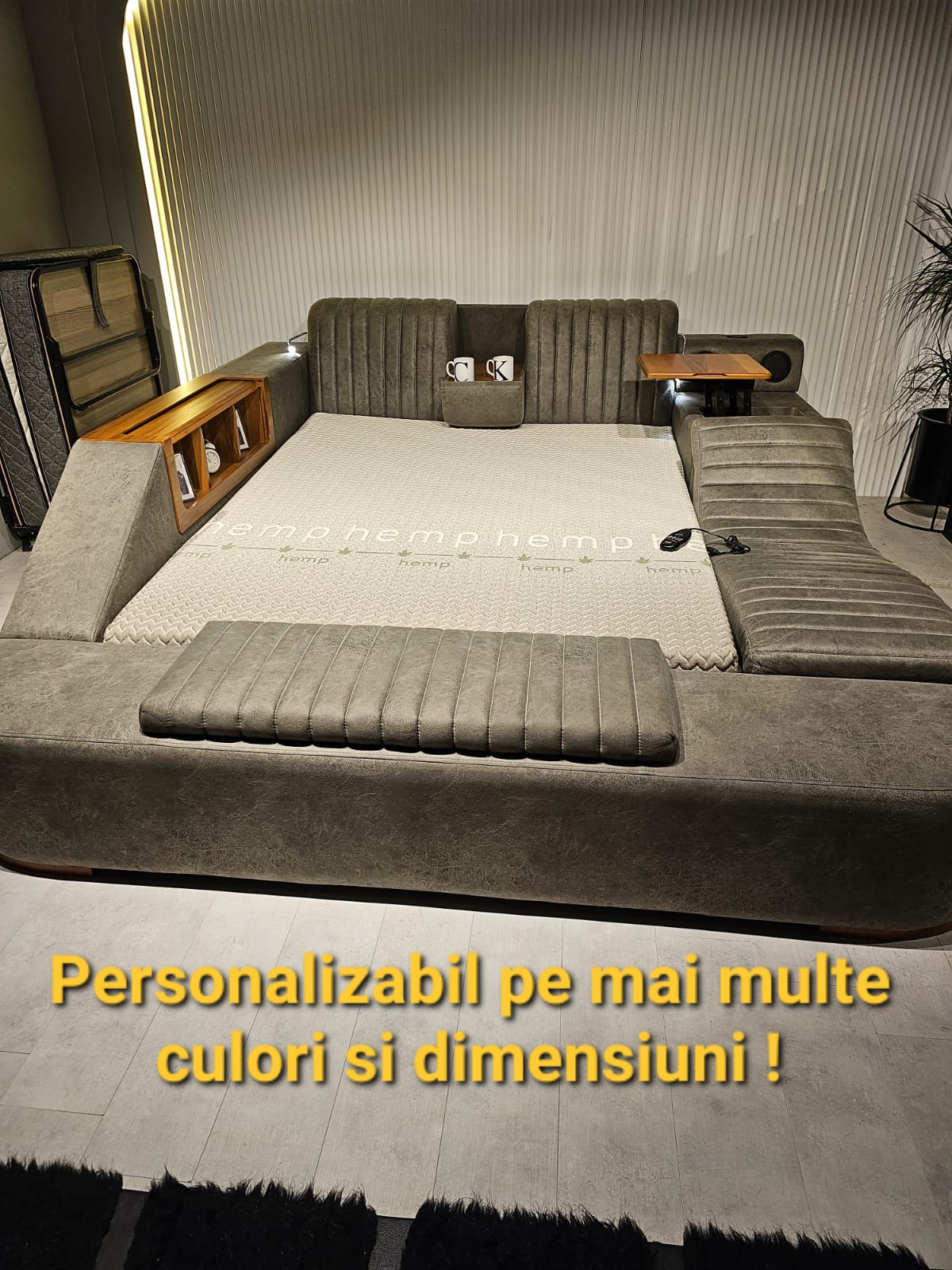 Este o alegere perfecta pentru iubitorii stilului modern, intrucat este spatios, elegant si tapitat integral . Acest pat matrimonial poate oferi oricarui dormitor in care este amplasat un plus de eleganta si rafinament si un spatiu de odihna placut tuturor, el avand urmatoarele functii si accesorii –  functia de masaj cu telecomanda  (lateral partea dreapta…