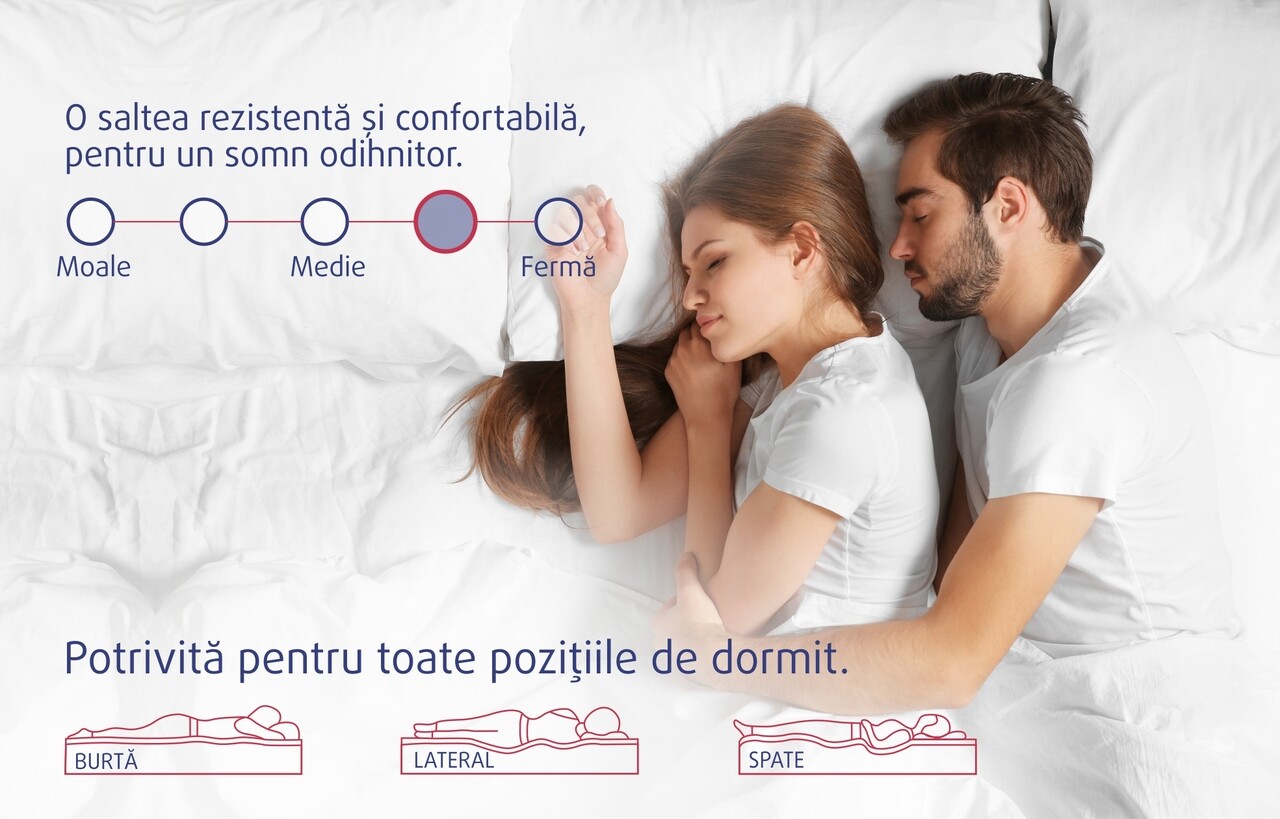 Avand in vedere ca ne petrecem aproape o treime din viata dormind, somnul de calitate este esential pentru bunastarea noastra generala, iar patul potrivit joaca rolul principal in acest sens. Contemporan si elegant in acelasi timp, patul Luxury Stockholm Latex a fost conceput tinand cont de nevoile cat mai variate ale oamenilor cand vine vorba de alegerea patului ideal, oferind astfel combinatia optima intre confort si design. Conceput din materiale de calitate superioara, Stockholm Latex reprezinta mai mult decat un pat, este un sistem cu o structura complexa, format din baza, saltea si topper, solutia completa ce garanteaza un somn de calitate. Baza, conceputa din doua somiere pentru a usura montajul si curatenia, este facuta din lemn masiv, uscat in mediu controlat pentru a crea un cadru stabil cu durabilitate ridicata. Arcurile impachetate individual 7Z Green Pocket® din interiorul somierei asigura o stabilitate crescuta si un confort ortopedic si anatomic excelent. Salteaua vine in completarea bazei cu al doilea strat de arcuri 7Z Green Pocket® care, neavand legaturi intre ele, impiedica propagarea miscarii pe suprafata saltelei pentru a nu deranja partenerul in timpul somnului. In plus, 7Z Green Pocket® permite un suport diferit al partilor corpului in functie de presiunea exercitata de acestea pe suprafata saltelei pentru a asigura o aliniere corecta si sanatoasa a vertebrelor coloanei. Cu proprietati ortopedice, spuma elastica Green Form HD® din compozitie, asigura o pozitie naturala si corecta in timpul somnului, prevenind astfel durerile de spate sau cervicale. Stratul de confort este completat de topper care, gratie stratului de Intelligent Latex HD®, ofera o aerisire superioara si o stabilitate termica crescuta, mentinand racoare in timpul verii si cald in timpul iernii. In plus, datorita elasticitatii sale, latexul este nedeformabil, fiind prin urmare un material extrem de durabil. Confortul termic este imbunatatit de stratul generos de vata de bambus care inveleste stratul de Intelligent Latex HD®. Fibra de bambus este in mod natural prevazuta cu goluri de aer in interior avand prin urmare calitati excelente de reglare termica, mentinand temperatura ideala atat vara cat si iarna. Fibra de bambus poate absorbi si evapora cu 40% mai multa umiditate decat bumbacul, fiind o alegere perfecta pentru persoanele cu probleme de transpiratie in timpul somnului. Mai mult decat atat, fibra de bambus are in mod natural proprietati hipoalergice, fiind ideala pentru persoanele alergice sau cu dermatite. Husa topperului, creata din materiale de calitate superioara, este ultimul element al acestui sistem gandit in cele mai mici detalii pentru a oferi somnul de calitate mult asteptat. Headbordul patului este prevazut cu 2 perne cu inaltime ajustabila asigurand confortul dorit in pozitia sezut in pat, indiferent daca alegi sa citesti o carte sau sa te uiti la filmul preferat.