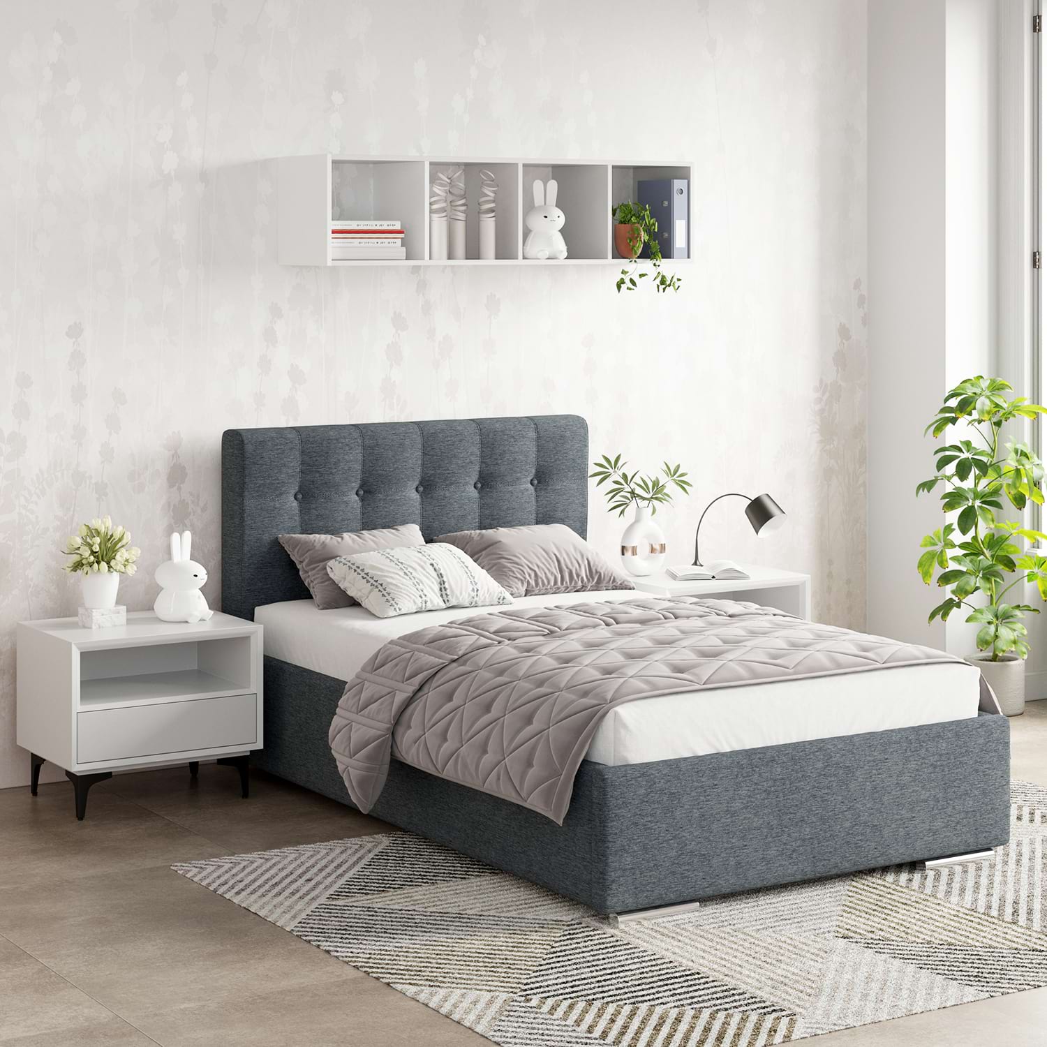 Pat tapitat de o persoana GEORGIA, dimensiuni 120x200cm, H107 cu somiera rabatabila si lada depozitare, husat in stofa Albastru V73 are un design modern si elegant pe un cadru robust si bine proiectat. Tablia patului este un element distinctiv, formata din patrate tapitate care adauga un efect vizual interesant si un plus de confort.Patul dispune de o somiera rabatabila, oferind spatiu de depozitare dedesubt, ceea ce il face nu doar estetic placut, ci si practic. Marginile patului sunt bine definite si finisate, contribuind la aspectul sau sofisticat. Exclusiv TAMOS! Pret de producator , livrare rapida si Gratuita ! Configurabilconfigurezi husa (catifea, stofa)configurezi dimensiune pat – 140cm, 160cm, 180cmconfigurezi complemente – asezare pe coltul camerei, saltele, noptiere, comode, dulapuri AvantajeCONFORT – Combinand armonios rigoarea geometrica a tabliei cu formele arcuite pe care le creaza buretele folosit din belsug, patul Georgia da nastere unui stil personal si cald.Incadrandu-se cu succes in orice stil de amenajare, realizeaza combinatii valoroase cu mobilierul din lemn, furniruri sau placaje.FUNCTIONALITATE – Patul tapitat Georgia Clasic contine o somiera metalica ranfortata, compusa din lamele arcuite din fag, montate pe un cadru metalic foarte solid. Sistemul de ridicare compus din balamale si amortizoare cu gaz vin sa completeze fiabilitatea suportului de saltea. Compartimentul de depozitare generos si complet tapitat iti va organiza si iti va sistematiza spatiul din dormitor.REZISTENTA – Pentru o rezistenta fara cusur, am proiectat pentru patul Georgia Clasic un sistem metalic ce sustine fundurile de pat distantate de sol si rigidizeaza cadrul patului. In plus, o bara de rigidizare metalica dispusa transversal sprijina somiera in starea de repaus si impiedica deformarea lateralelor patului in timp. Sistemul permite o aerisire corecta a saltelei si a lucrurilor ce se depoziteaza in lada patului.Mobilier kit, se livreaza demontat, ambalat in cutii de cartonKitul contine schita montaj, feronerie, certificat garantie si conformitateSomiera metalica cu lamele arcuite din fagPistoane cu gaz (amortizoare)Spatiu depozitare sub somiera cu structura metalica, distanta de pardoseala si suport depozitare tapitat integralPicioare cromateCusaturi de tapiterie cu banda de intarire Dimensiuni pat Georgia Clasic 120x200cmDimensiuni interioare: 121x201cmDimensiuni exterioare: 130x217cmInaltime tablie mare: 107cmInaltime cadru pat: 37cmInaltime de la sol: 4cm Texturi / culori disponibileStofa Albastru V73 Garantie 24 luni Livrare Gratuita. Manipularea produsului nu este inclusa, produsul se preia de la masina. *NOTA* Imaginile afisate sunt doar pentru scopuri ilustrative. Dimensiunile reale ale produsului pot diferi usor fata de cele prezentate. De asemenea, culorile pot varia in functie de setarile dispozitivului dvs. Va rugam sa verificati specificatiile produsului pentru detalii exacte si sa va asigurati ca este decorul dorit.*Noptiera, salteaua de pat, lenjeria si celelalte acesorii din imagine nu sunt incluse in pret….