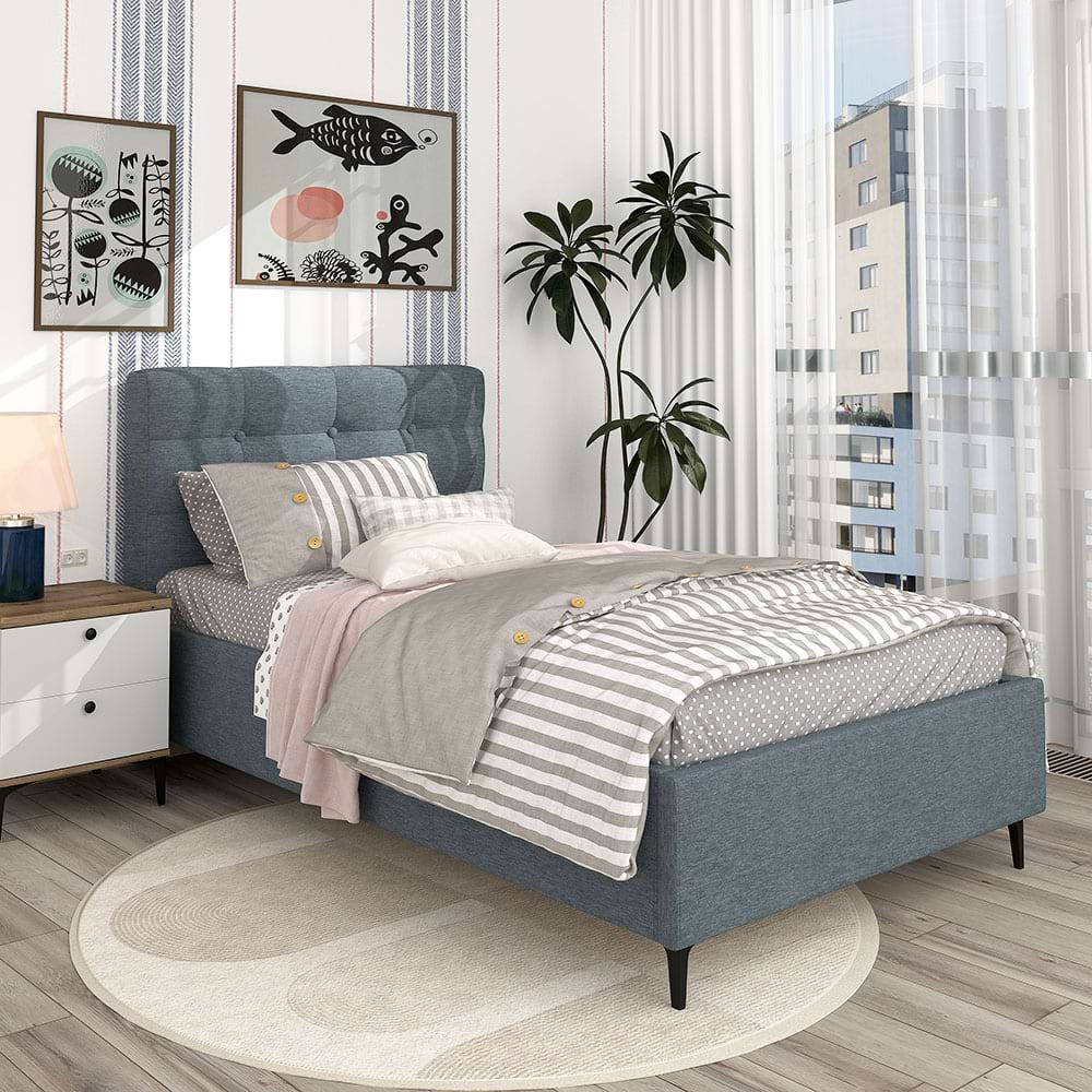 Patul tapitat de copii model GEORGIA Pro 90×200, H116 cm este realizat de TAMOS din Stofa Albastru V73, prezinta un design modern si elegant, perfect pentru camerele de copii sau adolescenți, oferind un aspect placut si confortabil. Structura din metal si elementele lemnoase il fac deosebit de solid, fiind adesea utilizat si de persoane adulte, supraponderale.Caracteristici:Dimensiuni: 90×200 cm, ideal pentru o persoana, oferind suficient spatiu pentru un somn confortabil si odihnitor.Material Tapiterie: Stofa Albastru V73 de inalta calitate, creaza un aspect sofisticat si o senzatie placuta la atingere.Design Modern: Tablia de pat este inalta si tapițata, oferind un suport confortabil pentru citit sau relaxareFunctionalitate: Patul este echipat cu o somiera rabatabila, facilitand accesul la lada de depozitare generoasa, unde poti organiza eficient jucariile, lenjeria sau alte obiecte personale.Constructie Durabila: Realizat din materiale de inalta calitate, patul GEORGIA garanteaza stabilitate si durabilitate, fiind conceput sa reziste in timp.Rezistenta acestui pat nu limiteaza doar la utilizarea de catre copii, patul GEORGIA Pro este o solutie excelenta chiar si pentru adulti.Fabricat de TAMOS | Livrare Gratuita | Garantie Producator | Pat configurabilconfigurezi husa (catifea, piele ecologica, stofa, piele txturata)configurezi dimensiuniconfigurezi complemente din acelasi material (noptiere, taburete si lazi depozitare) AvantajeMobilier kit, se livreaza demontat, ambalat in cutii de cartonKitul contine schita montaj, feronerie, certificat garantie si conformitateSistemul de sustinere saltea este compus din somiera metalica cu traverse elastice din lemn stratificat fag.Pistoane gaz (amortizoare)Lada de depozitare cu sustinere metalica si suport din PAL melaminat AlbCusaturi de tapiterie cu banda de intarirePicioare metalice Dimensiuni90x200 cm – dimensiuni exterioare: Lungime 220cm x latime 100cm x Inaltime 116cm120x200 cm – dimensiuni exterioare: Lungime 220cm x latime 130cm x Inaltime 116cmdistanta de la pardoseala – 13cmtablie mare – inaltime de la sol – 116cmtablie mare – grosime – 16cmlaterale pat – inaltime – 30cmlaterale pat – grosime – 5cminaltimea de inserare a saltelei in rama patului – 6cm MaterialeStofa Albastru V73Structura patului din rame metalice cu adaosuri lemnoaseColtari metalici solizi de fixare a cadrului patuluiSomiera lamele fag cu rama metalicaBalamale si amortizor cu gazFund pat pentru depozitare – PAL melaminat Alb 10mmStructura metalica depozitare Garantie Producator 24 luni Livrare Gratuita. Manipularea produsului nu este inclusa. Produsul se preia de la masina.*NOTA* Imaginile afisate sunt doar pentru scopuri ilustrative. Dimensiunile reale ale produsului pot diferi usor fata de cele prezentate. De asemenea, culorile pot varia in functie de setarile dispozitivului dvs. Va rugam sa verificati specificatiile produsului pentru detalii exacte si sa va asigurati ca este decorul dorit.*Noptiera, salteaua de pat, lenjeria si celelalte acesorii din imagine nu sunt incluse in pret….