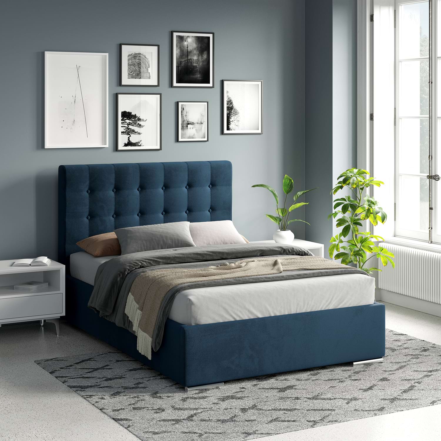 Patul tapitat GEORGIA Clasic, 140×200, H127 cu somiera rabatabila si lada depozitare, husat cu catifea Albastra are un design modern si elegant pe un cadru robust si bine proiectat. Tablia patului este un element distinctiv, formata din patrate tapitate care adauga un efect vizual interesant si un plus de confort.Patul dispune de o somiera rabatabila, oferind spatiu de depozitare dedesubt, ceea ce il face nu doar estetic placut, ci si practic. Marginile patului sunt bine definite si finisate, contribuind la aspectul sau sofisticat. Exclusiv TAMOS! Pret de producator , livrare rapida si Gratuita ! Configurabilconfigurezi husa (catifea, stofa)configurezi dimensiune pat – 140cm, 160cm, 180cmconfigurezi complemente – asezare pe coltul camerei, saltele, noptiere, comode, dulapuri AvantajeCONFORT – Combinand armonios rigoarea geometrica a tabliei cu formele arcuite pe care le creaza buretele folosit din belsug, patul Georgia da nastere unui stil personal si cald.Incadrandu-se cu succes in orice stil de amenajare, realizeaza combinatii valoroase cu mobilierul din lemn, furniruri sau placaje.FUNCTIONALITATE – Patul tapitat Georgia Clasic contine o somiera metalica ranfortata, compusa din lamele arcuite din fag, montate pe un cadru metalic foarte solid. Sistemul de ridicare compus din balamale si amortizoare cu gaz vin sa completeze fiabilitatea suportului de saltea. Compartimentul de depozitare generos si complet tapitat iti va organiza si iti va sistematiza spatiul din dormitor.REZISTENTA – Pentru o rezistenta fara cusur, am proiectat pentru patul Georgia Clasic un sistem metalic ce sustine fundurile de pat distantate de sol si rigidizeaza cadrul patului. In plus, o bara de rigidizare metalica dispusa transversal sprijina somiera in starea de repaus si impiedica deformarea lateralelor patului in timp. Sistemul permite o aerisire corecta a saltelei si a lucrurilor ce se depoziteaza in lada patului.Mobilier kit, se livreaza demontat, ambalat in cutii de cartonKitul contine schita montaj, feronerie, certificat garantie si conformitateSomiera metalica cu lamele arcuite din fagPistoane cu gaz (amortizoare)Spatiu depozitare sub somiera cu structura metalica, distanta de pardoseala si suport depozitare tapitat integralPicioare cromateCusaturi de tapiterie cu banda de intarire Dimensiuni pat Georgia Clasic 140x200cmDimensiuni interioare: 141x201cmDimensiuni exterioare: 151x217cmInaltime tablie mare: 127cmInaltime cadru pat: 37cmInaltime de la sol: 4cm Texturi / culori disponibilecatifea Albastra Garantie 24 luni Livrare Gratuita. Manipularea produsului nu este inclusa, produsul se preia de la masina. *NOTA* Imaginile afisate sunt doar pentru scopuri ilustrative. Dimensiunile reale ale produsului pot diferi usor fata de cele prezentate. De asemenea, culorile pot varia in functie de setarile dispozitivului dvs. Va rugam sa verificati specificatiile produsului pentru detalii exacte si sa va asigurati ca este decorul dorit.*Noptiera, salteaua de pat, lenjeria si celelalte acesorii din imagine nu sunt incluse in pret….