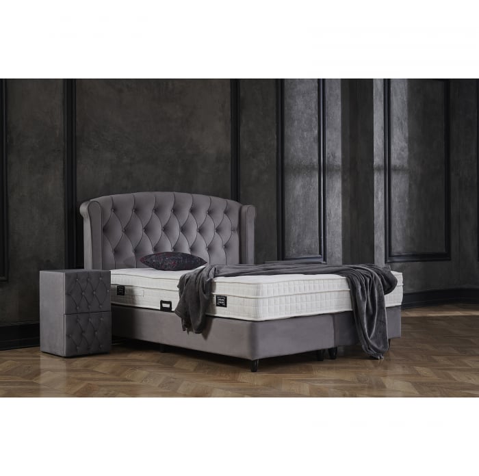 Pat tapitat ROSE 160×200 cm, cu saltea inclusa, somiera rabatabila si spatiu depozitare, stofa gri