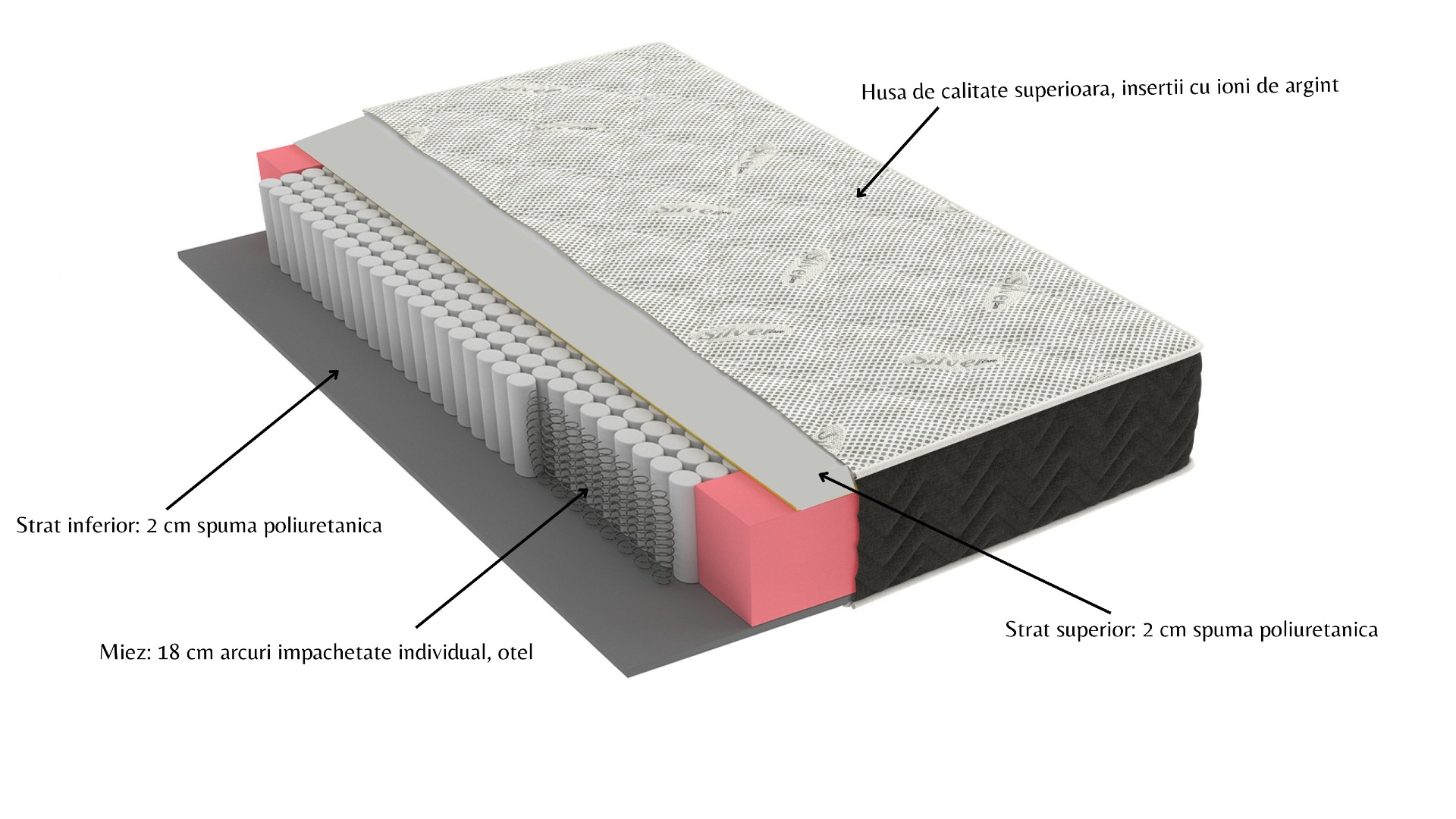 Saltea cu arcuri Pocket Somnart 2Face Confort 140×200, înălțime 22 cm, husă nedetașabilă, mânere, fermitate medie Saltea cu arcuri Pocket Somnart 2Face Confort, husa cu tricot Silver, fermitate medie, inaltime 22 cm, este o saltea de calitate superioară, ce oferă confort și sprijin în timpul somnului. Această saltea este fabricată dintr-un sistem de arcuri pocket, care înseamnă că fiecare arc este învelit individual într-o husă. Acest design oferă o susținere mai bună și o separare a mișcărilor, ceea ce face salteaua să fie perfectă pentru cei care au un partener de somn agitat sau pentru cei care se mișcă mult în timpul nopții. Salteaua are o înălțime de 22 cm, ceea ce înseamnă că oferă un sprijin excelent pentru corpul tău, încurajând o poziție corectă a coloanei vertebrale și eliminând orice puncte de presiune pe corp. Laterale sunt prevăzute cu mânere. Husa saltelei este realizată din tricot Silver, un material moale și confortabil la atingere. De asemenea, este un material anti-alergic și anti-microbian, ceea ce previne dezvoltarea bacteriilor și a acarienilor, protejându-te de alergii și asigurând igienă în timpul somnului. În plus, acest material are proprietăți termoregulatoare, menținându-te răcoros în timpul verii și cald în timpul iernii. Avantaje: Sprijin excelent pentru corp: Datorită înălțimii sale de 22 cm și sistemului de arcuri pocket, salteaua oferă un sprijin excelent pentru corp, încurajând o aliniere corectă a coloanei vertebrale și eliminând punctele de presiune pe corp. Separare a mișcărilor: Datorită designului cu arcuri pocket, fiecare arc este învelit individual într-o husă, ceea ce asigură o separare mai bună a mișcărilor. Acest lucru face ca salteaua să fie ideală pentru cei care au un partener de somn agitat sau care se mișcă mult în timpul nopții. Proprietăți termoregulatoare: Materialul tricot Silver are proprietăți termoregulatoare, menținându-te răcoros în timpul verii și cald în timpul iernii. Fermitate medie. Informatii tehnice: Compozitie husa: Tricot Silver cu proprietăți termoregulatoare, menținându-te răcoros în timpul verii și cald în timpul iernii. Compozitie miez: arcuri pocket, fiecare arc este învelit individual într-o husă + straturi de spumă poliuretanică Greutate recomandata: pentru persoane pana la 110 Kg. In cazul persoanelor a caror greutate depaseste 110 kg va recomandam: Salteaua XXL Memory Plus, pentru persoane supraponderale – pana la 140 Kg Recomandari de utilizare: Aceasta saltea se livreaza rolata. A se desface cu grija folia de protectie, fara a folosi foarfece sau alte obiecte taioase. Toate materialele noi emana miros. Saltelele noi au asa numitul „miros de fabrica” pentru ca au stat sigilate in pachete neaerisite. Acest miros va disparea daca produsul este lasat la aerisit cel putin 24 de ore inainte de utilizare. Lasati salteaua sa revina la forma initiala (timp de asteptare minim 24 ore). Produsele presate isi recapata forma si dimensiunea in cateva zile dupa ce sunt desfacute din pachetul initial. Evitati umezirea saltelei. Salteaua se curata numai cu aspiratorul. Protejati salteaua cu o husa. Aerisiti periodic salteaua.
