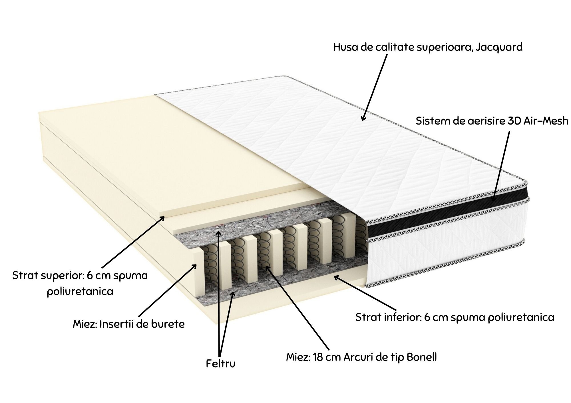 Saltea superortopedica 90×200, inaltime 30 cm, Somnart FERMO, cu arcuri, duritate extra ferma Tip saltea: saltea superortopedica de pat cu arcuri. Arcul Bonnell este utilizat pentru a crea saltele durabile care ofera sustinere. Saltelele ortopedice cu arcuri Bonnell combina caracteristicile unei saltele clasice, bazata pe arcuri, cu cele ale unei saltele moderne, ortopedice, pe baza de spuma. Arcurile tip Bonnell asigura elasticitate si suport uniform ceea ce va face sa va treziti odihniti si fara dureri de spate. Dimensiune: saltea superortopedica 90×200 Compozitie husa: Stofa rezistenta tip Jaquard, compozitie 70% polipropinela + 30% poliester, nedetasabila, model floral. Husa este matlasata cu un strat generos de vata – pentru un confort deosebit si pentru transportul facil al umiditatii si al transpiratiei din zilele toride de vara. Compozitie miez: Miez: arc de tip Bonell din otel carbon 2,2 mm, feltru 1000 gr/mp Strat superior: 6.5 cm spuma poliuretanica, densitate 21 kg/mp Strat inferior: 6.5 cm spuma poliuretanica, densitate 21 kg/mp Rama: 5 cm spuma 100% poliuretan densitate 21 kg/mp, duritate 40 kg/mc Inaltime totala saltea superortopedica: 30 cm (toleranta +/- 1 cm).n Aceasta saltea superortopedica este ideala pentru cadrele foarte inalte (adanci) de pat, astfel incat sa beneficiezi de maximul de confort si la asezarea pe laterala patului. Somnart® – pentru odihna sanatoasa! Produsele noastre se regasesc in casele a milioane de romani. Stim ca increderea aratata de clientii nostri se obtine doar prin calitate fara compromis. De aceea produsele noastre sunt realizate in conditii de calitate, mediu, sanatate si securitate ocupationala, la cele mai ridicate standarde europene. Certificari: OEKO-TEX 100, ISO 9001, ISO 14001, OHSAS 18001 Recomandari de utilizare: Toate materialele noi emana miros.n Saltelele noi au asa numitul „miros de fabrica” pentru ca au stat sigilate in pachete neaerisite.n Acest miros va disparea daca produsul este lasat la aerisit cel putin 24 de ore inainte de utilizare. Evitati umezirea saltelei. Salteaua se curata numai cu aspiratorul. Eticheta Oeko-Tex® indica utilizatorilor finali interesati beneficiile suplimentare ale sigurantei testate pentru imbracamintea prietenoasa cu pielea si alte materiale textile.n In acest fel, eticheta de testare ofera un instrument important de luare a deciziilor atunci când achizitionati produse textile. Increderea in textile – un sinonim international pentru productia de textile responsabil – de la materia prima la produsul finit pe rafturile magazinelor. Protejati salteaua cu o husa. Aerisiti periodic salteaua. Rotiti salteaua la cateva luni – acest lucru va prelungi durata de viata a saltelei. Nota: Aceasta saltea se livreaza roluita. Va rugam sa o desfaceti in termen de cel mult 2 zile de la momentul primirii ei.