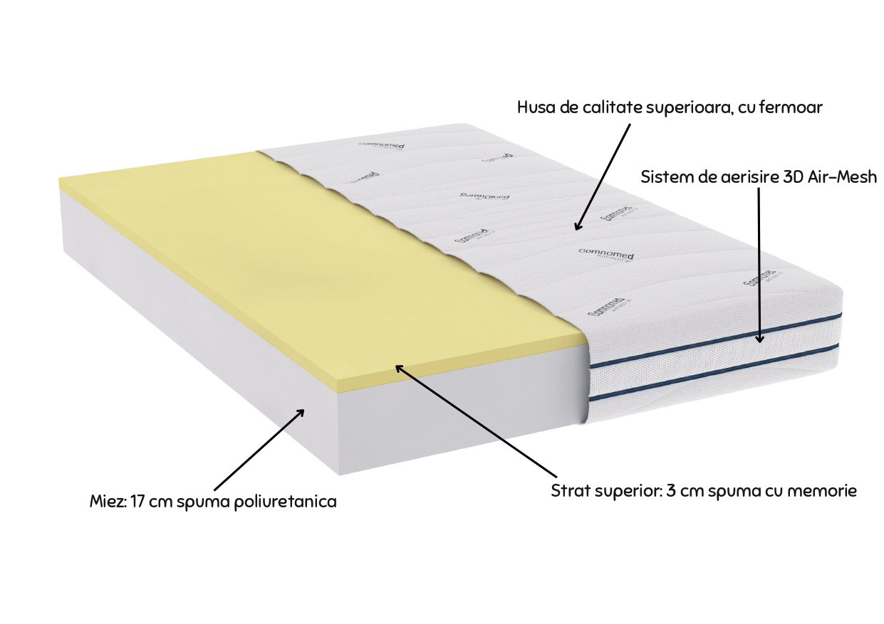 Saltea cu memorie, antiacarieni Somnomed Memory Antiacaria pentru alergici 140x200x20cm, husa detasabila si lavabila cu tratament antiacarian, fermitate medie Alege salteaua cu spuma de memorie Somnomed® Memory Antiacaria cu duritate medie si husa tratata antiacarieni, detasabila si lavabila care protejeaza impotriva alergiilor cauzate de acarieini. Salteaua are stratul de baza format din spuma elastica High Resilience de 17 cm pentru sustinere optima si un strat de 3 cm stratul de spuma cu memorie ce elimina punctele de presiune, asigura relaxarea muschilor si amplifica circulatia sangelui. Husa este matlasata cu un strat generos de vata pentru un plus de confort, si are laterala fabricata cu material special 3D mesh pentru asigurarea ventilatiei necesare in zilele toride de vara. Datorita acestei combinatii, salteaua indeplineste toate criteriile de elasticitate, durabilitate si suport necesare pentru o odihna care te fereste de alergii. Ce avantaje iti ofera Salteaua Somnomed® Memory Antiacaria? 1. Suport si flexibilitate in timpul somnului Baza formata din spuma poliuretanica High Resilience de 17 cm cu fermitate medie ofera un nivel optim de sustinere, fiind in acelasi timp elastica. Prin urmare, coloana vertebrala va primi sprijinul necesar, iar muschii corpului se vor putea relaxa corespunzator. Punctele de presiune sunt eliminate multumita stratului de memory foam de 3 cm care ajuta la amplificarea circulatiei sangvine. 2. Materialul cu tratament anti-acarieni, pentru cei alergici Este demonstrat stiintific ca prezenta acarienilor favorizeaza aparitia alergiilor, lucru extrem de suparator mai ales ca simptomele alergice apar seara inainte de culcare. Astfel tratamentul antiacarieni al husei saltelei impiedica aparitia acarienilor pentru a a sigura o odihna sanatoasa si ferita de alergii. Certificatele Antibacterial Ultra-Fresh sunt disponibile aici: Raport fisa tehnica tratament Antibacterial Ultra-Fresh Benefits + Bluesign somnomed Ultra-Fresh KW-48 somnomed Ultra-Fresh Testing – EU somnomed Cand recomandam Salteaua Somnomed® Memory Antiacaria? Salteaua Somnomed® Memory Antiacaria este ideala: Pentru cei alergici la acarieni Daca preferi o saltea confortabila, cu memorie si fermitate medie Daca iti doresti un somn odihnitor si sanatos Ai nevoie de o saltea inteligenta, ce ofera confort sporit Alte beneficii ale saltelei Somnomed® Memory Antiacaria Suport ortopedic optim pentru o sustinere ideala a corpului Husa matlasata pentru un plus de confort si rezistenta superioara datorita stratului generos de vata Ventilatie aplificata multumita lateralei cu material 3D Husa este confectionata din tricot de inalta calitate si are doua panouri detasabile cu fermoar, lavabile separat la 40 de grade, fiind astfel mai usor de intretinut Este rolata pentru transport comod si pastrarea integritatii saltelei pana la deschidere Informatii tehnice: Compozitie husa: Fete tricot 100% poliester marca Somnomed®, cu tratament certificat antiacaria Compozitie miez: 17 cm spuma elastica din poliuretan „High Resilience” de calitate superioara, densitate 23 Kg/m3 3 cm spuma elastica din poliuretan cu memorie de calitate superioara, densitate 40 Kg/m3 Inaltime totala miez: 20 cm (toleranta ± 1 cm) Va rugam sa masurati cu atentie cadrul patului pentru a va asigura ca ati comandat dimensiunea corecta a saltelei. Recomandari de utilizare: In cazul saltelelor rolate a se desface cu grija folia de protectie, fara a folosi foarfece sau alte obiecte taioase. Toate materialele noi emana miros. Saltelele noi au asa numitul „miros de fabrica” pentru ca au stat sigilate in pachete neaerisite. Acest miros va disparea daca produsul este lasat la aerisit cel putin 24 de ore inainte de utilizare. Lasati salteaua sa revina la forma initiala (timp de asteptare minim 24 ore). Produsele presate isi recapata forma si dimensiunea in cateva zile dupa ce sunt desfacute din pachetul initial. Husa de saltea este lavabila la 40 de grade. Evitati umezirea saltelei. Salteaua se curata numai cu aspiratorul. Protejati salteaua cu o husa / cu o protectie de saltea Aerisiti periodic salteaua. Intoarceti periodic salteaua de pe o parte pe cealalta (o data la cateva luni) Rotiti periodic salteaua (o data la cateva luni) Certificare Oeko-tex Standard 100, pentru absenta substantelor periculoase Eticheta Oeko-Tex® indica utilizatorilor finali interesati beneficiile suplimentare ale sigurantei testate pentru imbracamintea prietenoasa cu pielea si alte materiale textile. in acest fel, eticheta de testare ofera un instrument important de luare a deciziilor atunci cand achizitionati produse textile. increderea in textile – un sinonim international pentru productia de textile responsabil – de la materia prima la produsul finit pe rafturile magazinelor * Nota: Acest produs contine substanta activa Clorura de argint, nr CE232-033-3, Nr CAS 7783-90-6, concentratie in unitati metrice 2% Nota: Aceasta saltea se livreaza roluita. Va rugam sa o desfaceti in termen de cel mult 2 zile de la momentul primirii ei.