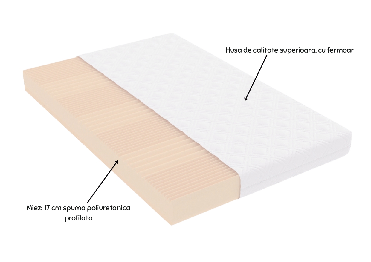 Saltea ortopedica 7 Zone Somnart 180x200x17 cm, husa lavabila si detasabila cu fermoar Stratul de baza din spuma poliuretanica combina cu succes elasticitatea si durabilitatea pentru a asigura suport corect si confort sporit in timpul somnului. Fiind o saltea cu fermitate medie (avand miez de duritate medie), se reduc punctele de presiune cu beneficii pentru circulatie si coloana vertebrala, ajutand la relaxarea muschilor si la o odihna sanatoasa. Materialul husei este realizata dintr-o tesatura de calitate, foarte placuta la atingere si este matlasata pentru un plus de confort. Husa este detasabila si lavabila la 40 de grade. Rolata pentru transport usor. Se poate folosi pe ambele parti pentru o durata de viata indelungata. Panourile husei se pot detasa separat, pentru a facilita spalarea facila a acestora. Informatii tehnice: Husa microfibra, matlasata cu vata de 100 gsm si cu insertie de 15 gsm, pentru un confort suplimentar. Panourile sunt unite cu fermoar alb. Husa este cu fermoar pe 4 laturi, adica se poate detasa facil in vederea intretinerii (a spalarii) Poliuretan densitate 23 kg/mc; duritate 35 (medie) Inaltime saltea: 17 cm (toleranta +/- 1 cm) Rulata pentru transport usor Compozitie husa: Tesatura 100% poliester tip microfibra, peroata si moale la atingere Vata 100% poliester de 100 g/mp Insertie 100% polipropilena de 15 g/mp Panourile husei sunt lavabile la temperatura inalta, fara contractii la spalare. Compozitie Miez: Spuma elastica din poliuretan de calitate superioara 23 kg/mc; duritate 35 Inaltime miez 17 cm (toleranta +/- 1 cm) Garantie: 2 ani Va rugam sa masurati cu atentie cadrul patului pentru a va asigura ca ati comandat dimensiunea corecta a saltelei. Greutate recomandata: pentru persoane pana la 90 Kg. In cazul persoanelor a caror greutate depaseste 90 Kg va recomandam: Salteaua Saltea Somnart XXL Memory Plus (inaltime 25cm) pentru persoane cu greutate – pana la 140 Kg Salteaua Fermimax Aloe Vera – pana la 120 Kg Recomandari de utilizare: Rotiti salteaua o data la cateva luni Intoarceti salteaua de pe o parte pe cealalta odata la cateva luni Protejati si mariti durata de utilizare a saltelei cu o protectie pentru saltea de 180 x 200 cm (aceeasi dimensiune ca salteaua) Va recomandam derolarea saltelei imediat dupa primire, deoarece rolarea poate afecta proprietatile acesteia. A se desface cu grija folia de protectie, fara a folosi foarfece sau alte obiecte taioase. Toate materialele noi emana miros. Saltelele noi au asa numitul „miros de fabrica” pentru ca au stat sigilate in pachete neaerisite. Acest miros va disparea daca produsul este lasat la aerisit cel putin 24 de ore inainte de utilizare. Lasati salteaua sa revina la forma initiala (timp de asteptare minim 24 ore). Produsele presate isi recapata forma si dimensiunea in cateva zile dupa ce sunt desfacute din pachetul initial. Husa de saltea este lavabila la 40 de grade. Evitati umezirea saltelei. Salteaua se curata numai cu aspiratorul. Protejati salteaua cu o husa impermeabila, daca exista riscul unor lichide. Aerisiti periodic salteaua. Certificare Oeko-tex Standard 100, pentru absenta substantelor periculoase Eticheta Oeko-Tex® indica utilizatorilor finali interesati beneficiile suplimentare ale sigurantei testate pentru imbracamintea prietenoasa cu pielea si alte materiale textile. In acest fel, eticheta de testare ofera un instrument important de luare a deciziilor atunci cand achizitionati produse textile. Increderea in textile – un sinonim international pentru productia de textile responsabil – de la materia prima la produsul finit pe rafturile magazinelor.