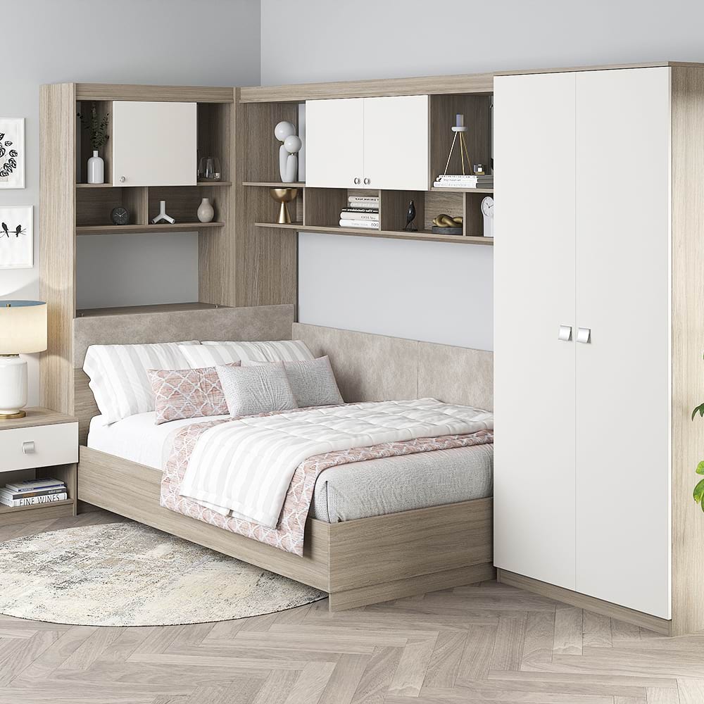 Dormitorul pe colt ALESSIO 3 din Oak si Alb cu elemente tapitate cu stofa Bej este compus din pat de colt cu elemente tapitate, lada depozitare, dulap 2 usi, bara umerase, polite, noptiera 1 setar, pont mare si pont mic.Se poate monta pe orice colt al camerei. Dormitor configurabil! configurezi materialele, decor, PALconfigurezi dimensiune patconfigurezi complemente Pat de colt – 2 dimensiuni 120x200cm 140x200cm contine elemente tapitate pe tablia mare si laterala superioara peretecontine suport pentru saltea realizat din PAL cu spatii de aerisire Dulap cu 2 usi – interior Bara Haine, politedimensiune (Lungime x adancime x inaltime) : 90x52x200cm Noptiera cu sertardimensiune (Lungime x adancime x inaltime) : 50x43x46cmDimensiune totala ansamblu cu dulap pentru pat 120*200cm : 175*330*200cmDimensiune totala ansamblu cu dulap pentru pat 140*200cm : 195*330*200cm Complemente (se pot achizitiona contra cost)Set 4 oglinzi optionalSaltea ortopedica Mobilier kitSe livreaza demontat, ambalat in cutii de cartonKitul contine schita montaj, feronerie, certificat garantie si conformitate MaterialePAL dublu melaminat Oak 16mmPAL dublu melaminat Alb 16mmCant ABS 0,4mmStofa BejFeronerie Italia Garantie producator 24 luni Transport GRATUIT in toata tara.*NOTAPoza cu caracter informativ. In pretul patului este inclus suportul de saltea.Salteaua de pat , lenjeria si celelalte acesorii din imagine NU sunt incluse in pret.Se recomanda o saltea cu inaltimea de maximum 22cm….