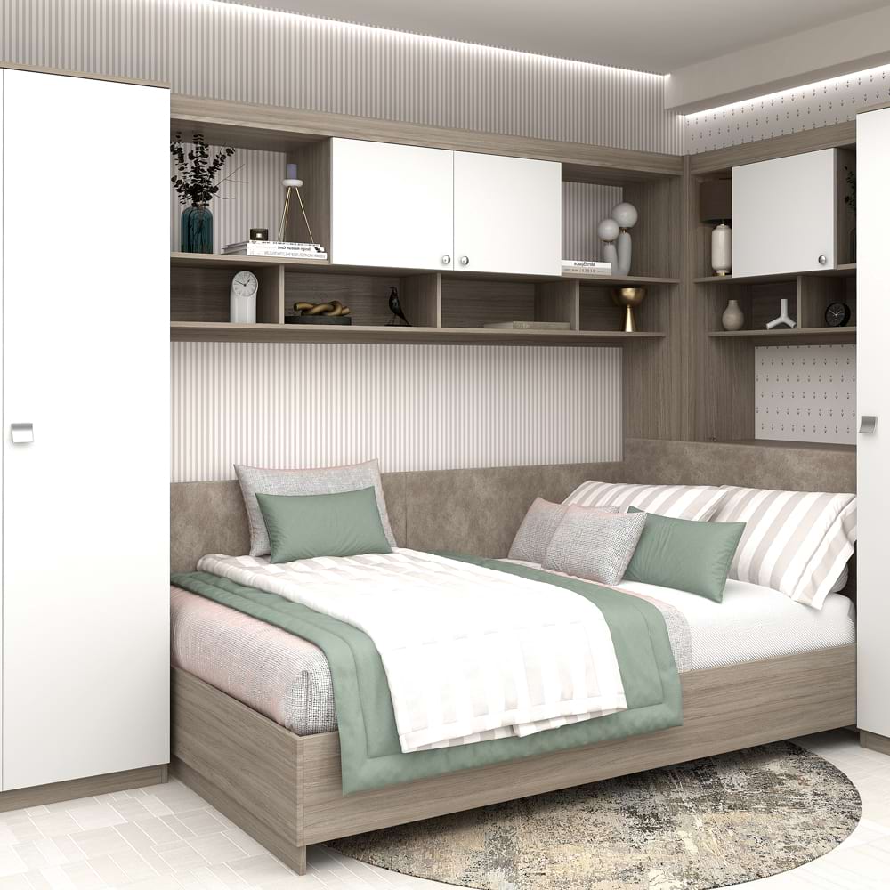 Dormitorul pe colt ALESSIO 4 din Oak si Alb cu elemente tapitate cu stofa bej este compus din pat de colt cu elemente tapitate, lada depozitare, dulap 2 usi, dulap 1 usa, pont mare si pont mic.Se poate monta pe orice colt al camerei! Dormitor configurabil! configurezi materialele, decor, PAL, MDFconfigurezi dimensiune patconfigurezi complemente Pat de colt – 2 dimensiuni 120x200cm 140x200cm contine elemente tapitate pe tablia mare si laterala superioara peretecontine suport pentru saltea realizat din PAL cu spatii de aerisire Dulap cu 2 usi – interior Bara Haine si Politedimensiune (Lungime x adancime x inaltime) : 90x52x200cm Dulap cu 1 usa – interior politedimensiune (Lungime x adancime x inaltime) : 45x52x200cmDimensiune totala ansamblu cu dulap pentru pat 120*200cm : 170*330*200cmDimensiune totala ansamblu cu dulap pentru pat 140*200cm : 190*330*200cm Complemente (se pot achizitiona contra cost)Saltea ortopedica Mobilier kitSe livreaza demontat, ambalat in cutii de cartonKitul contine schita montaj, feronerie, certificat garantie si conformitate MaterialePAL dublu melaminat Oak 16mmPAL dublu melaminat Alb 16mmCant ABS 0,4mmStofa BejFeronerie Italia Garantie producator 24 luni Transport GRATUIT in toata tara.*NOTAPoza cu caracter informativ. In pretul patului este inclus suportul de saltea.Salteaua de pat , lenjeria si celelalte acesorii din imagine NU sunt incluse in pret.Se recomanda o saltea cu inaltimea de maximum 22cm….