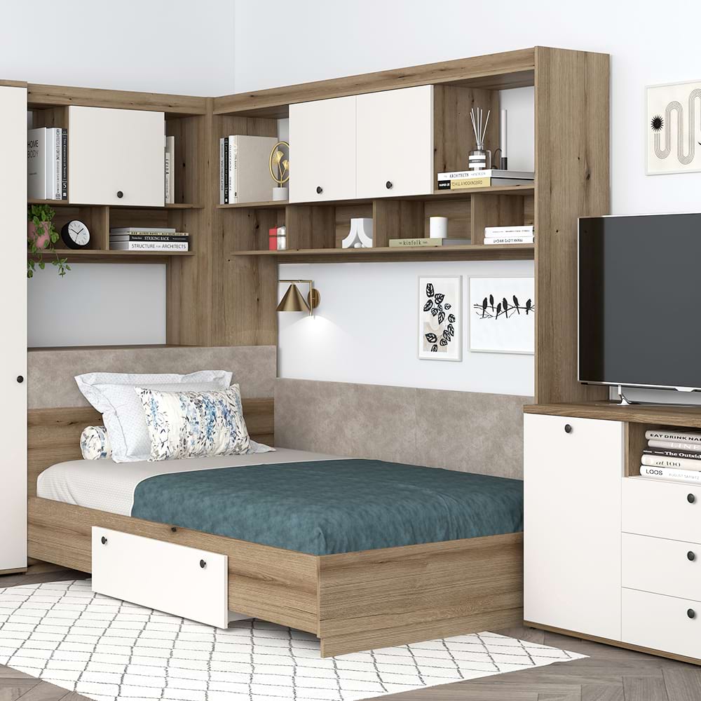 Dormitor colt AMBRO 11, cu comoda, Stejar, Alb