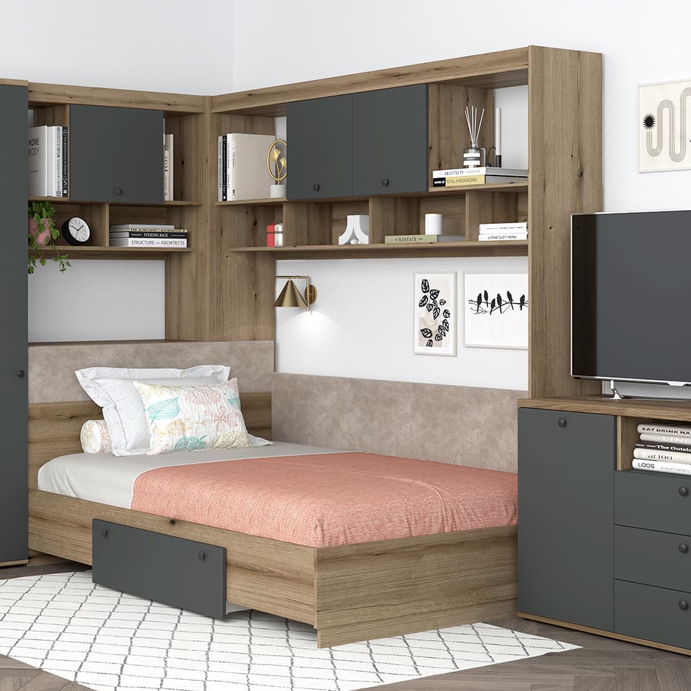 Dormitor colt AMBRO 11, cu comoda, Stejar, Antracit