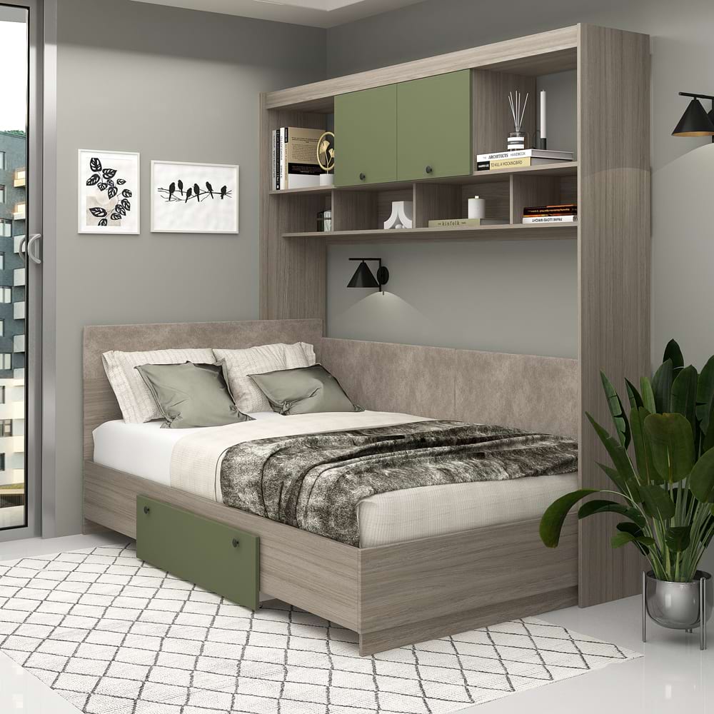 Ansamblul Dormitor Ambro in configuratia AMBRO 6 reprezinta o sinteza perfecta intre design-ul modern si folosirea judicioasa a spatiului. Cu un finisaj bland de stejar (oak) si Pesto, acest set de mobilier ofera o solutie de amenajare pe coltul camerei. Pe lungimea patului, dulapurile suspendate din Oak si Pesto creeaza un contrast placut si ofera spatiu suplimentar pentru a va organiza cartile si decoratiunile. Rafturile deschise sunt ideale pentru a expune articolele preferate sau pentru a pastra la indemana obiectele esentiale.Designul inteligent include un pat confortabil, la care se poate adauga optional un sertar ce ofera spațiu de depozitare generos pentru pilote, paturi sau perne voluminoase. Patul beneficiaza de 2 dimensiuni: 120x200cm si 140x200cm, facandu-l util atat pentru camere de copii si adolescenti ce dorm singuri in camera, dar si pentru un cuplu de adulti. Suportul de saltea FORTE permite utilizarea pe termen lung a patului, fara deterioararea saltelei in timp datorita spatiilor de ventilare intre traverse si a suportilor de sustinere.Elimina problema pardoselilor strambe – ponturile (dulapurile suspendate) au picioruse metalice de reglare, o solutie excelenta atunci cand pardoseala nu este perfect plana. Elimina prinderea dulapurilor suspendate pe perete – dulapurile suspendare necesita doar ancorarea (prinderea de siguranta), nu necesita prinderea de sustinere pe perete.Interschimbabil – ansamblul se poate pozitiona pe orice colt al camerei.TAMOS ofera avantajul unui pret de fabrica, cu livrare rapida si gratuita pe tot teritoriul tarii, garantie de producator! Dormitor configurabilconfigurezi materialele, decor, PALconfigurezi dimensiune patconfigurezi sertar patconfigurezi dimensiuni dulapconfigurezi complemente Mobilier kitmobilier kit, se livreaza demontat, ambalat in cutii de cartonKitul contine schita montaj, feronerie, certificat garantie si conformitate Configuratia AMBRO 7Pat de colt AMBRO cu suport saltea inclus Dulap suspendat biblioteca AMBRO 207x35x200cmOptiuniSertar pat (optiune) Pat matrimonial Dimensiuni interioare pat/dim saltea: 120x200cm sau 140x200cmDimensiuni exterioare pat 127x204cm sau 147x204cm Dulapuri (Lungime x Adancime x Inaltime)Dulap suspendat biblioteca AMBRO 207cm Complementele – din aceeasi colectie PRIMAVERAComode – optionalDulapuri – optionalToalete – optionalTaburete – optionalLazi depozitare – optional MaterialePAL dublu melaminat 16mm, 25mm Oak, PestoCant ABS 0,4mmCant ABS 1mm (fronturi si rama patului) Garantie producator 24 luni Transport GRATUIT in toata tara*Salteaua de pat si accesoriile din imagine nu sunt incluse in pret( Lenjerie , perne , lampi , veioze…)…