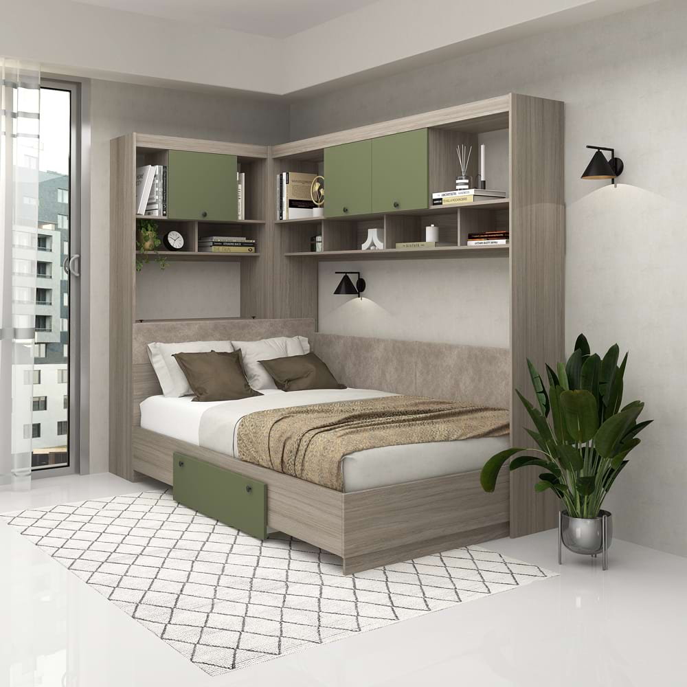Ansamblul Dormitor Ambro in configuratia AMBRO7 reprezinta o sinteza perfecta intre design-ul modern si maximizarea spatiului. Cu un finisaj echilibrat de stejar (oak) si Pesto, acest set adauga o nota de caldura si rafinament oricarei camere. Deasupra capului, dulapurile suspendate cu usi Pesto creeaza un contrast placut si ofera spatiu suplimentar pentru a va organiza cartile si decoratiunile. Rafturile deschise sunt ideale pentru a expune articolele preferate sau pentru a pastra la indemana obiectele esentiale.Designul inteligent include un pat confortabil cu lada depozitare in tablia de la cap, la care se poate adauga optional un sertar ce ofera spațiu de depozitare generos pentru pilote, paturi sau perne voluminoase. Patul beneficiaza de 2 dimensiuni: 120x200cm si 140x200cm, facandu-l util atat pentru camere de copii si adolescenti ce dorm singuri in camera, dar si pentru un cuplu de adulti. Suportul de saltea FORTE permite utilizarea pe termen lung a patului, fara deterioararea saltelei in timp datorita spatiilor de ventilare intre traverse si a suportilor de sustinere.Elimina problema pardoselilor strambe – ponturile (dulapurile suspendate) au picioare metalice de reglare, o solutie excelenta atunci cand pardoseala nu este perfect plana. Elimina prinderea dulapurilor suspendate pe perete – dulapurile suspendare necesita doar ancorarea (prinderea de siguranta), nu necesita prinderea de sustinere pe perete.Interschimbabil – ansamblul se poate pozitiona pe orice colt al camerei.TAMOS ofera avantajul unui pret de fabrica, cu livrare rapida si gratuita pe tot teritoriul tarii, garantie de producator! Dormitor configurabilconfigurezi materialele, decor, PALconfigurezi dimensiune patconfigurezi sertar patconfigurezi dimensiuni dulapconfigurezi complemente Mobilier kitmobilier kit, se livreaza demontat, ambalat in cutii de cartonKitul contine schita montaj, feronerie, certificat garantie si conformitate Configuratia AMBRO 7Pat de colt AMBRO cu suport saltea inclus Dulap suspendat biblioteca AMBRO 207x35x200cmDulap suspendat biblioteca AMBRO 90x35x200cm sau 110x35x200cmLada depozitare tablie pat AMBRO 90x35x90cm sau 110x35x90cmOptiuniSertar pat (optiune)Oglinda set 3 sau 4 (optiune) Pat matrimonial Dimensiuni interioare pat/dim saltea: 120x200cm sau 140x200cmDimensiuni exterioare pat 127x204cm sau 147x204cm Dulapuri (Lungime x Adancime x Inaltime)Dulap suspendat biblioteca AMBRO 207cm Dulap suspendat biblioteca AMBRO 90cm sau 110cm Complementele – din aceeasi colectie PRIMAVERAComode – optionalDulapuri – optionalToalete – optionalTaburete – optionalLazi depozitare – optional MaterialePAL dublu melaminat 16mm, 25mm Oak, PestoCant ABS 0,4mmCant ABS 1mm (fronturi si rama patului) Garantie producator 24 luni Transport GRATUIT in toata tara*Salteaua de pat si accesoriile din imagine nu sunt incluse in pret( Lenjerie , perne , lampi , veioze…)…