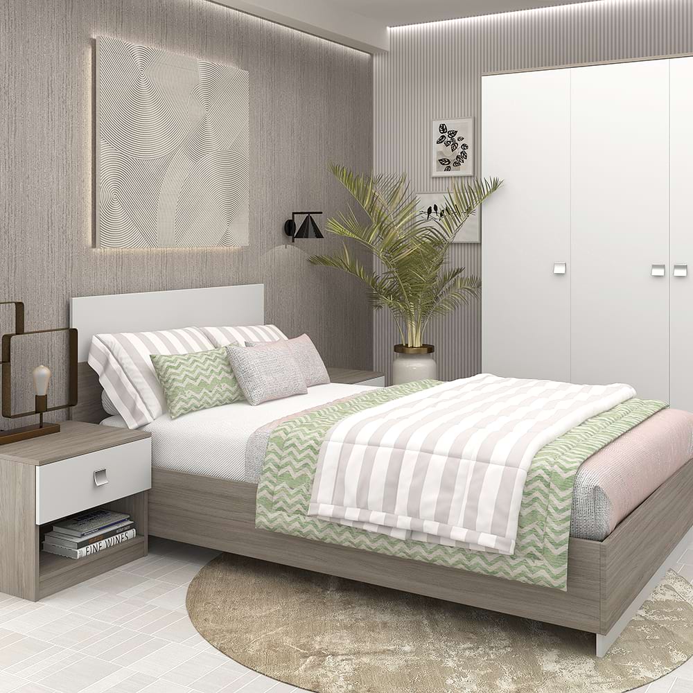 Dormitorul LINEA 4 cu pat disponibil in 3 dimensiuni, dulap de 135cm cu 3 usi si 2noptiere cu sertar in decor Oak si Alb face parte din colectia modulara LINEA.Exclusiv TAMOS! Pret de producator , livrare rapida si Gratuita ! Dormitor configurabilconfigurezi materialele, decor, PALconfigurezi dimensiune patconfigurezi complemente Caracteristici si avantaje Dormitor LINEA 4mobilier kit, se livreaza demontat, ambalat in cutii de cartonKitul contine schita montaj, feronerie, certificat garantie si conformitate Pat matrimonial Dimensiuni interioare pat/dim saltea: 120x200cm sau 140x200cm sau 160x200cm ( patul contine suport pentru saltea realizat din PAL cu spatii de aerisire )Dimensiuni exterioare pat 127x204cm sau 147x204cm sau 167x204cm Noptiere cu un sertarDimensiuni noptiera 50x42x48cm (LxlxH) Dulap haine cu polite si bare de umerase Dulap cu 2 usi, polita, bara haine – 90 x 52 x 200 cm (LxlxH)Dulap cu 1 usa, polite – 45 x 52 x 200 cm (LxlxH) Complementele – se achizitioneaza separat conta costSaltea – optional MaterialePAL dublu melaminat 16mm – OakPAL dublu melaminat 16mm – AlbCant ABS 0,4mm, 1mm Garantie producator 24 luni Transport GRATUIT in toata tara*Salteaua de pat si accesoriile din imagine nu sunt incluse in pret( Lenjerie , perne , lampi , veioze…)…