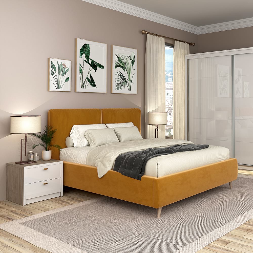 Dormitor MONTELLO 1, Oak, Alb Gloss, pat tapitat catifea Galben Mustar