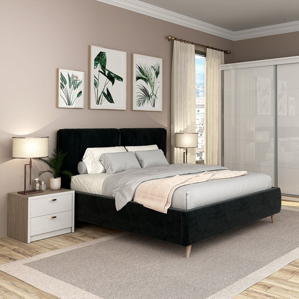 Dormitor MONTELLO 1, Oak, Alb Gloss, pat tapitat catifea Negru
