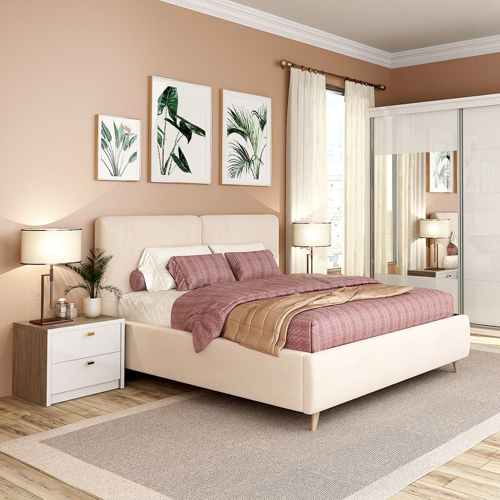 Set dormitor MONTELLO 1, Oak, Alb Gloss, pat tapitat catifea Bej, dulap usi culisante si noptiere incluse