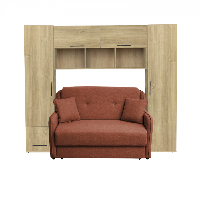 Set dormitor tineret YASMIN M1, 3 corpuri, stejar Belfast, 238x50x200 cm + Canapea GALA extensibila, 2 locuri, caramiziu, 143x98x98 cm