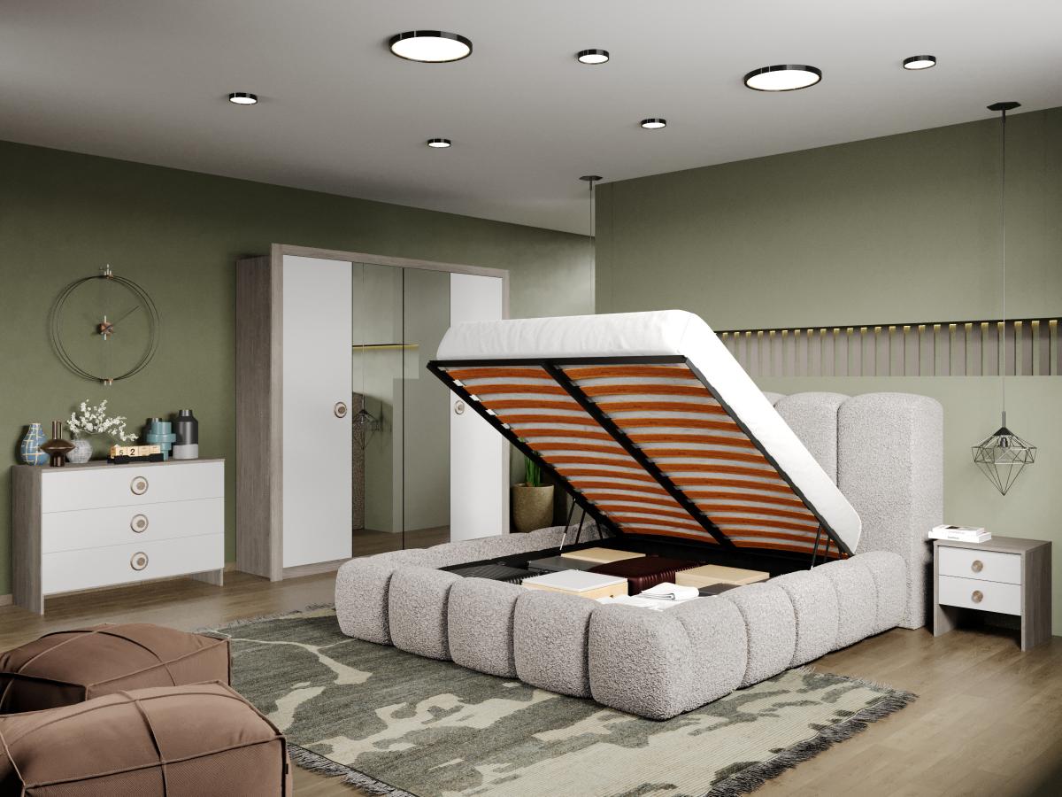 Set Mobila Dormitor Alb Noel tapitat cu oglinda C2 Alege set dormitor Noel cu finisaj Stejar K005 ce imita lemnul si usi disponibile in Alb . Manerele rotunde deosebite nu sunt doar estetice, dar si foarte practice, asigurand o utilizare usoara si confortabila. Dulapul cu patru usi si oglinda integrata ofera spatiu generos pentru haine si accesorii. Oglinda , pe langa utilitatea sa de baza, da senzatia de camera marita si spatioasa. Comoda si noptierele cu sertare sunt perfecte pentru articolele mai mici. Patul tapitat alb Noel, cu somiera rabatabila inclusa, este disponibil in dimensiunile 160 x 200 cm . Corpuri Set Mobila Dormitor Alb Noel tapitat cu oglinda C2 Dulap 4U – L 217.6 x A 52.6 x H 216 cm – Schita Montaj Cu 4 usi pe balamale, oglinda, compartimentat cu 13 polite, doua sertare, o bara de umerase. Pat Tapitat Alb Noel cu somiera rabatabila – L 196 x A 238 x H 122 cm – Schita Montaj Pat Somiera rabatabila este inclusa in pret. Sustine pana la 300kg. Salteaua nu este inclusa in pret. Comoda – L 111 x A 42.2 x H 77.8 cm – Schita Montaj Cu 3 sertare. Set noptiere – L 43 x A 40.6 x H 40.6 cm – Schita Montaj Fiecare cu cate 2 sertare. Livrare Gratuita prin flota proprie Suntem producatori de mobilier Toate corpurile au o garantie de 2 ani Video de prezentare familie Videoclipul de prezentare poate contine mai putine sau mai multe corpuri de mobilier in comparatie cu produsul de pe aceasta pagina. Scopul acestui video este de a detalia aspectul materialelor, accesoriilor cat si a familiei din care face parte. Dimensiuni Pat Tapitat Alb Noel cu somiera rabatabila si lada depozitare Latime: 196 cm Adancime: 238 cm Inaltime capat mare: 122 cm Inaltime capat mic: 41 cm Greutate maxima recomandata: 300kg Pat Tapitat Alb Noel cu somiera rabatabila si lada depozitare mentine linia de design de la Set Mobila Dormitor Alb Noel tapitat cu oglinda C2. Somiera inclusa este realizata dintr-un cadru metalic cu lamele din lemn , aceasta ofera un suport optim pentru saltea. Patul are picioare de 2 cm. Structura cadrului de pat este realizata din PAL de 16 / 18 mm , si din lemn masiv ( Molid). Patul are o somiera rabatabila cu pistoane (sistem gas lift) inclusa si lada de depozitare. Lada are lateralele construite din PAL si are o inaltime de 26 cm. Fundul lazii consta intr-o panza neagra cu scai care face priza intre material si elementele patului. Lada poate fi folosita pentru depozitarea lenjeriei, a pernelor sau altor obiecte personale, astfel, te poti bucura de un dormitor organizat si ordonat. Tapiteria patului este Alba – Rolf 4 , avand o structura moale cu un aspect buclat. Spatarul patului este inalt si confortabil, oferind un suport pentru spate atunci cand stai rezemat. Buretele are 3 cm cu o densitate de 25kg/m3. Tablia este rotunjita, compusa din mai multe panouri verticale curbate, oferind un aer cozy si primitor. Materialul din spatele tabliei patului este diferit de tapiteria din fata. Este o tesatura neagra, cu o textura diferita. Va recomandam sa plasati patul cu tablia la perete, asa cum se poate observa in pozele prezentate. Salteaua nu este inclusa , dimensiunea de saltea compatibila cu acest pat este de 160×200. Din inaltimea saltelei, 6 cm vor intra in cadrul patului . Lada de depozitare Lada este perfecta pentru depozitarea diverselor obiecte, de la haine si lenjerie de pat, pana la jucarii sau alte obiecte personale. Somiera metalica cu lamele din lemn Suportul de saltea este format din 13 lamele de lemn pe linie (13×2) cu spatiu intre ele ce permit ventilarea saltelei. Sistem de rabatare Aceste paturi se deschid si se inchid cu usurinta, datorita amortizoarelor cu gaz care permit ridicarea usoara. Stofa Rolf are o structura moale cu un aspect buclat. Aceasta stofa are un aspect similar cu blana de miel sau cu lana naturala. Este usor de intretinut si placuta la atingere. Stofa are o rezistenta ridicata la arsuri si pete cauzate de tigari. Tip tesatura: Stofa / 100%25 Poliester Densitate: 560 g/m² ± 5%25 Cicluri Martindale/ Rezistenta la abraziune: 30 000 Rezistenta la scamosare: 4-5/5 Rezistenta culorii la lumina: 7/8 Set Mobila Dormitor Alb Noel tapitat cu oglinda C2 O solutie ideala pentru un dormitor matrimonial. Corpurile din Set Mobila Dormitor Alb Noel tapitat cu oglinda C2 sunt realizate din PAL melaminat de 16 mm cu finisaj Stejar K005 ce imita lemnul si Alb , care creeaza un spatiu primitor si un ambient cald. Cantul aplicat este unul de 0,6 ce le permite muchiilor sa fie placute la atingere fiind finisate si atent retusate. Pretul afisat nu include alte accesorii sau obiecte de decor (tablouri, elemente de iluminat, asternuturi, covor etc.) Produsul se livreaza demontat si este insotit de accesorii si instructiuni de asamblare. Dimensiunile sunt exprimate in cm si pot oscila intre ± 20 mm.