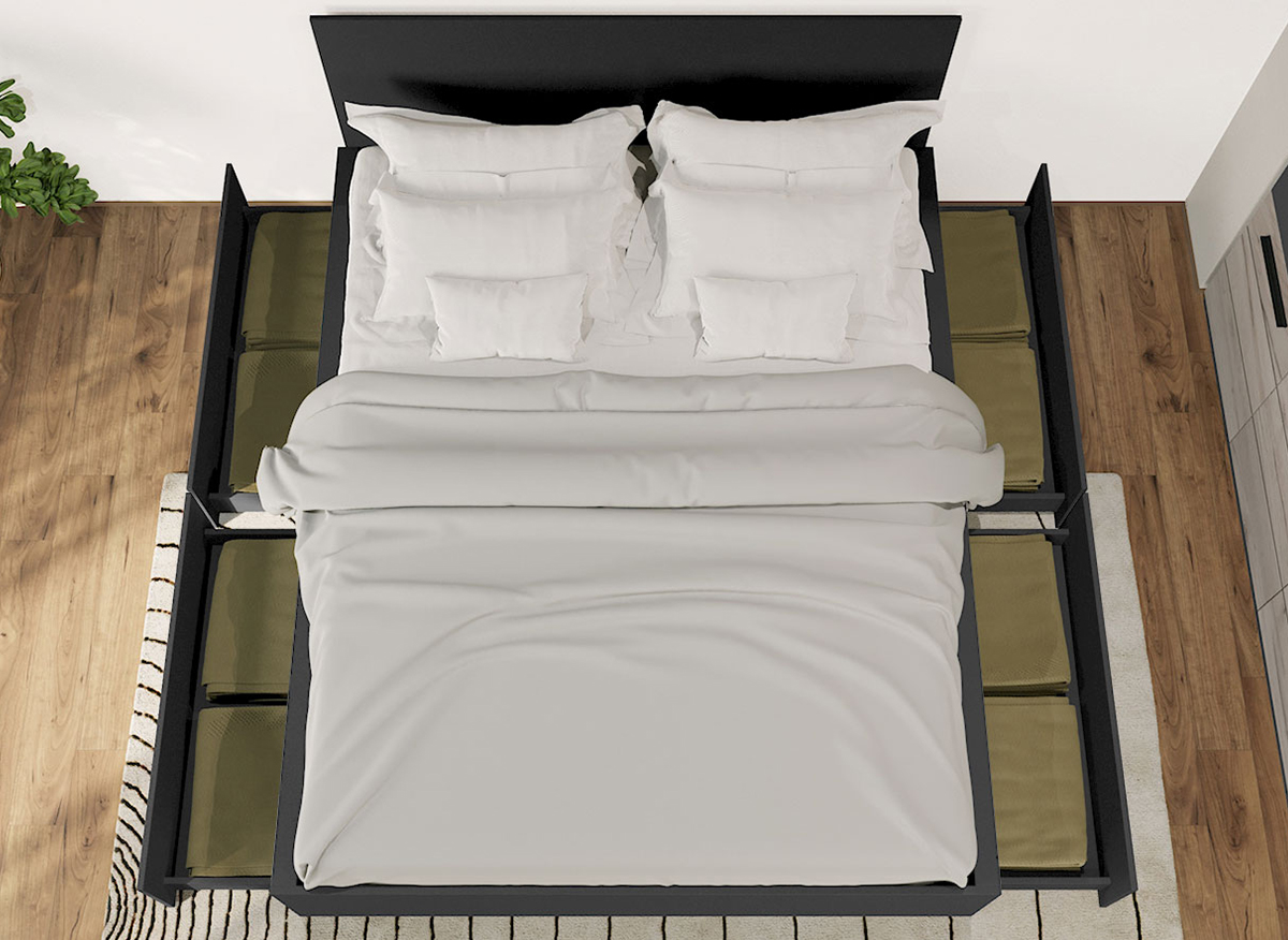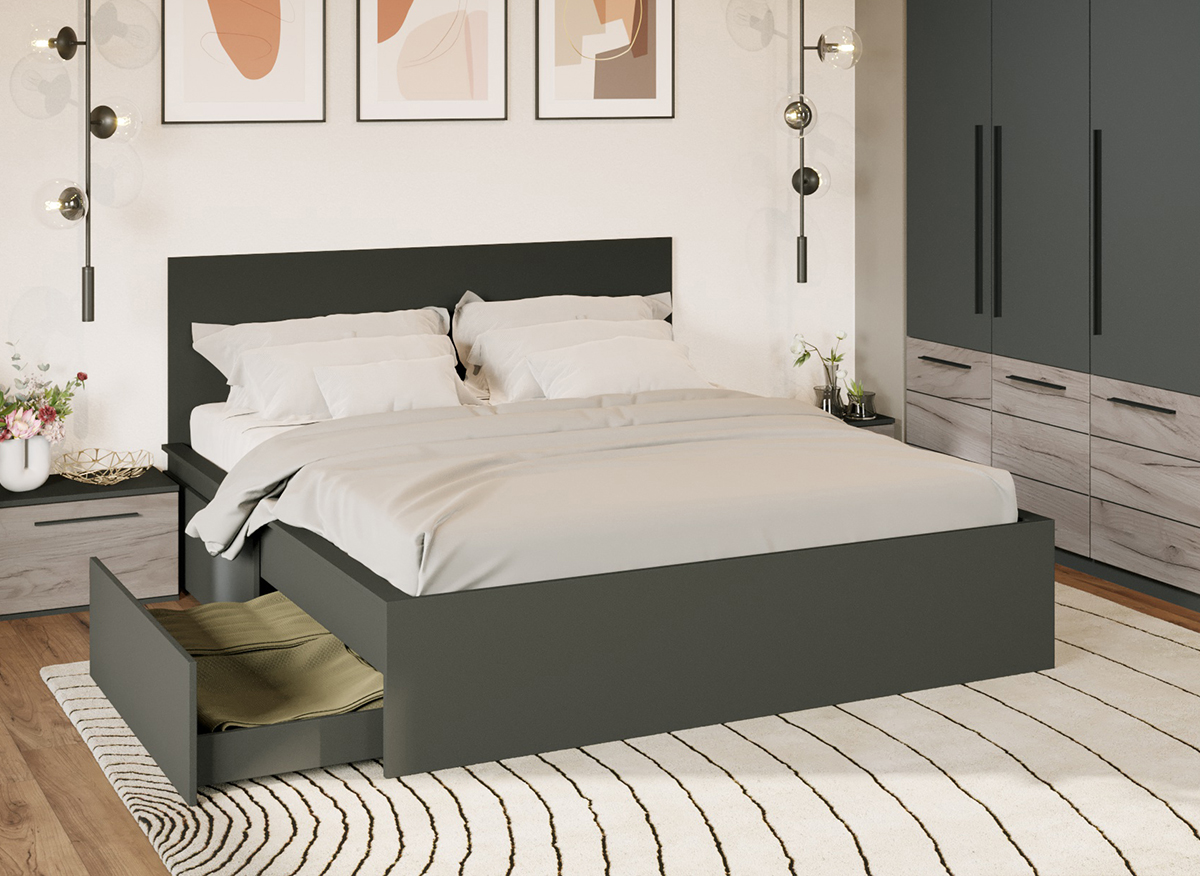 Set Dormitor Gri Noce C13 Set Dormitor Gri Noce C13 este un dormitor matrimonial cu un design inedit. Corpurile acestuia sunt spatioase si indeplinesc atat un rol estetic, cat si unul functional desavarsit. Finisajul gri antracit in combinatie cu stejarul k02 si manerele negre creeaza un ambient modern si relaxant. Dormitorul este compus din: Dulap 1.51m – L 151 x A 53 x H 199cm – Schita Montaj Compartimentat cu 6 polite si bara de umerase. Dulap suprapozabil 3U – L 151 x A 53 x H 49.2 cm – Schita Montaj Compartimentat cu 2 polite. Pat matrimonial – L 151.4, 171.4, 191.4 x A 211 x H 95cm – Schita Montaj Suport de saltea inclus. Sustine pana la 300kg. Set sertare (optional) – L 103 x A 69.4 x H 28.7cm – Schita Montaj Poti alege 2 sau 4 sertare/lazi pentru depozitare Set noptiere – L 46 x A 35 x H 34cm – Schita Montaj Cu usi si spatiu generos. Comoda (optional) – L 67 x A 34 x H 71cm – Schita Montaj Spatiu depozitare acoperit cu 2 usi. Livrare Gratuita prin flota proprie Suntem producatori de mobilier Toate corpurile au o garantie de 2 ani Video de prezentare familie Videoul de prezentare poate contine mai multe corpuri de mobilier sau mai putine in comparatie cu produsul de pe aceasta pagina. Scopul acestui video este de a detalia aspectul materialelor, accesoriilor cat si a familiei din care face parte. Set Dormitor Gri Noce C13 Se pot pune 2 sau 4 sertare de depozitare. Este rezistent cu sustinere in mai multe elemente: puncte de sprijin pe doua axe, 2 linii de sustinere pe lungime/laterale + 1 T central, L-uri metalice pe colturi Dimensiuni Pat Gri Latime: 151.4 cm sau 171.4 cm sau 191.4 cm (la alegere) Adancime: 211 cm Inaltime capat mare: 95 cm Inaltime capat mic: 36.8 cm Spatiu incadrament saltea: 7 cm (cat intra salteaua in cadru) Spatiu de la suport saltea la pardoseala: 30.5 cm Suportul de saltea din pal brut este inclus in pret. Saltea Compatibila 180×200 cm, 160×200 cm sau 140×200 cm in functie de dimensiunea de pat aleasa. Salteaua nu este inclusa! Bifati sus ca doriti. Alege 2 sau 4 lazi pentru depozitare Sporeste utilitatea patului prin lazile de depozitare. Reperul de jos este din pal de 16mm ce ofera o rezistenta sporita. Nu necesita fixarea pe cadrul patului, sunt pe roti si culiseaza sub pat iar frontul sertarului se opreste in laterala patului mascand spatiul de sub pat. Pot fi puse pana la 4 sertare. Dimensiune 1 sertar: 28.7 cm x 103 cm x 69.4 cm. Set Dormitor Gri Noce C13 Face parte din familia de mobila pentru dormitor Noce . Mobileaza un dormitor rapid si usor. O solutie ideala pentru un dormitor matrimonial. Corpurile din Set Dormitor Gri Noce C13 sunt realizate din PAL melaminat cu finisaj gri antracit si stejar k02 , o textura similara lemnului, care creeaza un contrast rafinat si un ambient placut. Cantul aplicat este unul de 0,6 ce le permite muchiilor sa fie placute la atingere fiind finisate si atent retusate. Pretul afisat nu include alte accesorii sau obiecte de decor (tablouri, elemente de iluminat, asternuturi, covor etc.) Produsul se livreaza demontat si este insotit de accesorii si instructiuni de asamblare. Dimensiunile sunt exprimate in cm si pot oscila intre ± 10 mm.