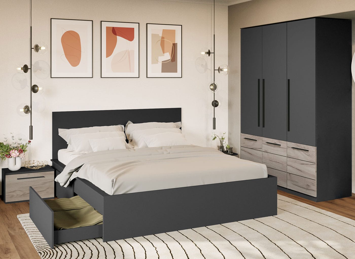 Set Dormitor Gri Noce C7 Un dormitor matrimonial cu un design inedit. Corpurile din Set Dormitor Gri Noce C7 sunt spatioase si indeplinesc atat un rol estetic, cat si unul functional desavarsit. Finisajul gri antracit in combinatie cu stejarul k02 si manerele negre creeaza un ambient modern si relaxant. Dormitorul este compus din: Dulap 1.51m – L 151 x A 53 x H 199cm – Schita Montaj Compartimentat cu 6 polite si bara de umerase. Pat matrimonial – L 151.4, 171.4, 191.4 x A 211 x H 95cm – Schita Montaj Suport de saltea inclus. Sustine pana la 300kg. Set sertare (optional) – L 103 x A 69.4 x H 28.7cm – Schita Montaj Poti alege 2 sau 4 sertare/lazi pentru depozitare Set noptiere – L 46 x A 35 x H 34cm – Schita Montaj Cu usi si spatiu generos. Livrare Gratuita prin flota proprie Suntem producatori de mobilier Toate corpurile au o garantie de 2 ani Video de prezentare familie Videoul de prezentare poate contine mai multe corpuri de mobilier sau mai putine in comparatie cu produsul de pe aceasta pagina. Scopul acestui video este de a detalia aspectul materialelor, accesoriilor cat si a familiei din care face parte. Set Dormitor Gri Noce C7 Se pot pune 2 sau 4 sertare de depozitare. Este rezistent cu sustinere in mai multe elemente: puncte de sprijin pe doua axe, 2 linii de sustinere pe lungime/laterale + 1 T central, L-uri metalice pe colturi Dimensiuni Pat Gri Latime: 151.4 cm sau 171.4 cm sau 191.4 cm (la alegere) Adancime: 211 cm Inaltime capat mare: 95 cm Inaltime capat mic: 36.8 cm Spatiu incadrament saltea: 7 cm (cat intra salteaua in cadru) Spatiu de la suport saltea la pardoseala: 30.5 cm Suportul de saltea din pal brut este inclus in pret. Saltea Compatibila 180×200 cm, 160×200 cm sau 140×200 cm in functie de dimensiunea de pat aleasa. Salteaua nu este inclusa! Bifati sus ca doriti. Alege 2 sau 4 lazi pentru depozitare Sporeste utilitatea patului prin lazile de depozitare. Reperul de jos este din pal de 16mm ce ofera o rezistenta sporita. Nu necesita fixarea pe cadrul patului, sunt pe roti si culiseaza sub pat iar frontul sertarului se opreste in laterala patului mascand spatiul de sub pat. Pot fi puse pana la 4 sertare. Dimensiune 1 sertar: 28.7 cm x 103 cm x 69.4 cm. Set Dormitor Gri Noce C7 Face parte din familia de mobila pentru dormitor Noce . Mobileaza un dormitor rapid si usor. O solutie ideala pentru un dormitor matrimonial. Corpurile din Set Dormitor Gri Noce C7 sunt realizate din PAL melaminat cu finisaj gri antracit si stejar k02 , o textura similara lemnului, care creeaza un contrast rafinat si un ambient placut. Cantul aplicat este unul de 0,6 ce le permite muchiilor sa fie placute la atingere fiind finisate si atent retusate. Pretul afisat nu include alte accesorii sau obiecte de decor (tablouri, elemente de iluminat, asternuturi, covor etc.) Produsul se livreaza demontat si este insotit de accesorii si instructiuni de asamblare. Dimensiunile sunt exprimate in cm si pot oscila intre ± 10 mm.
