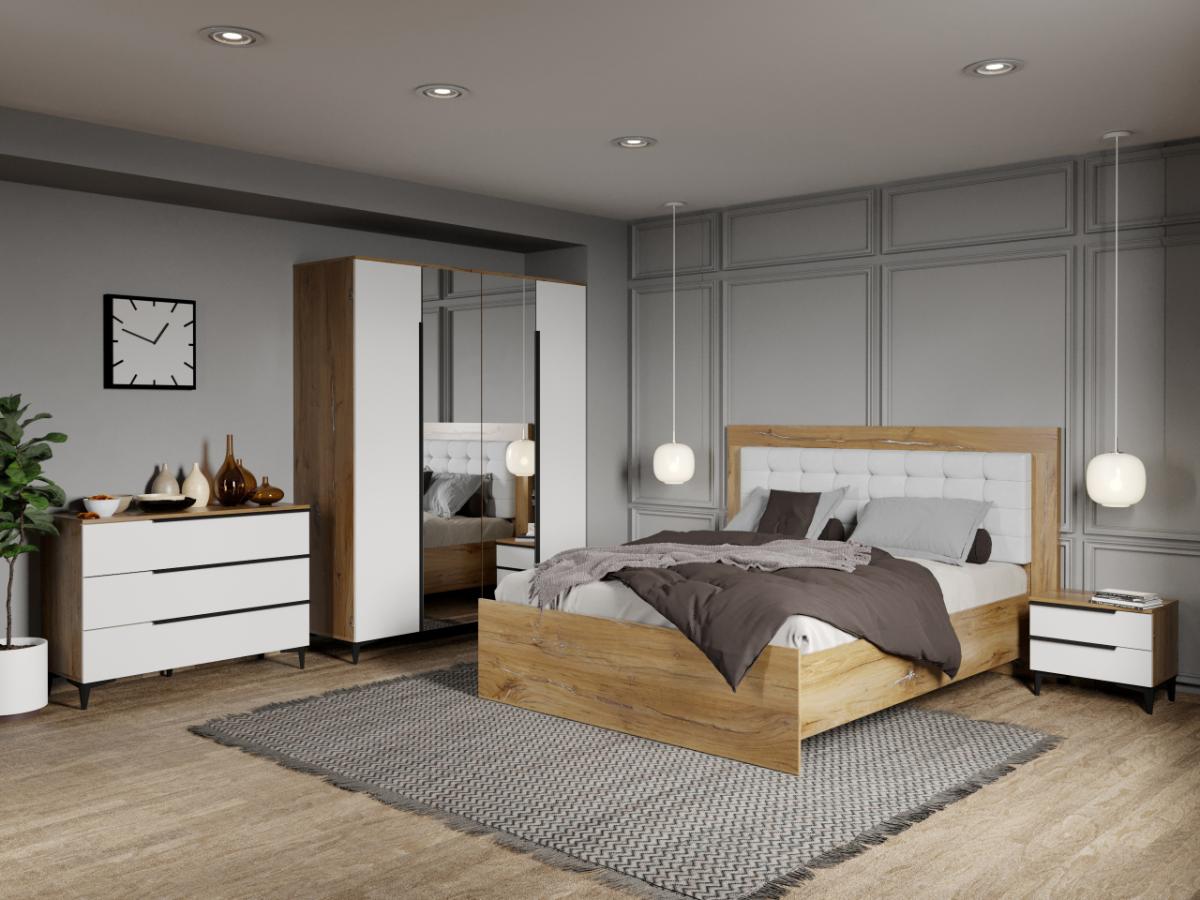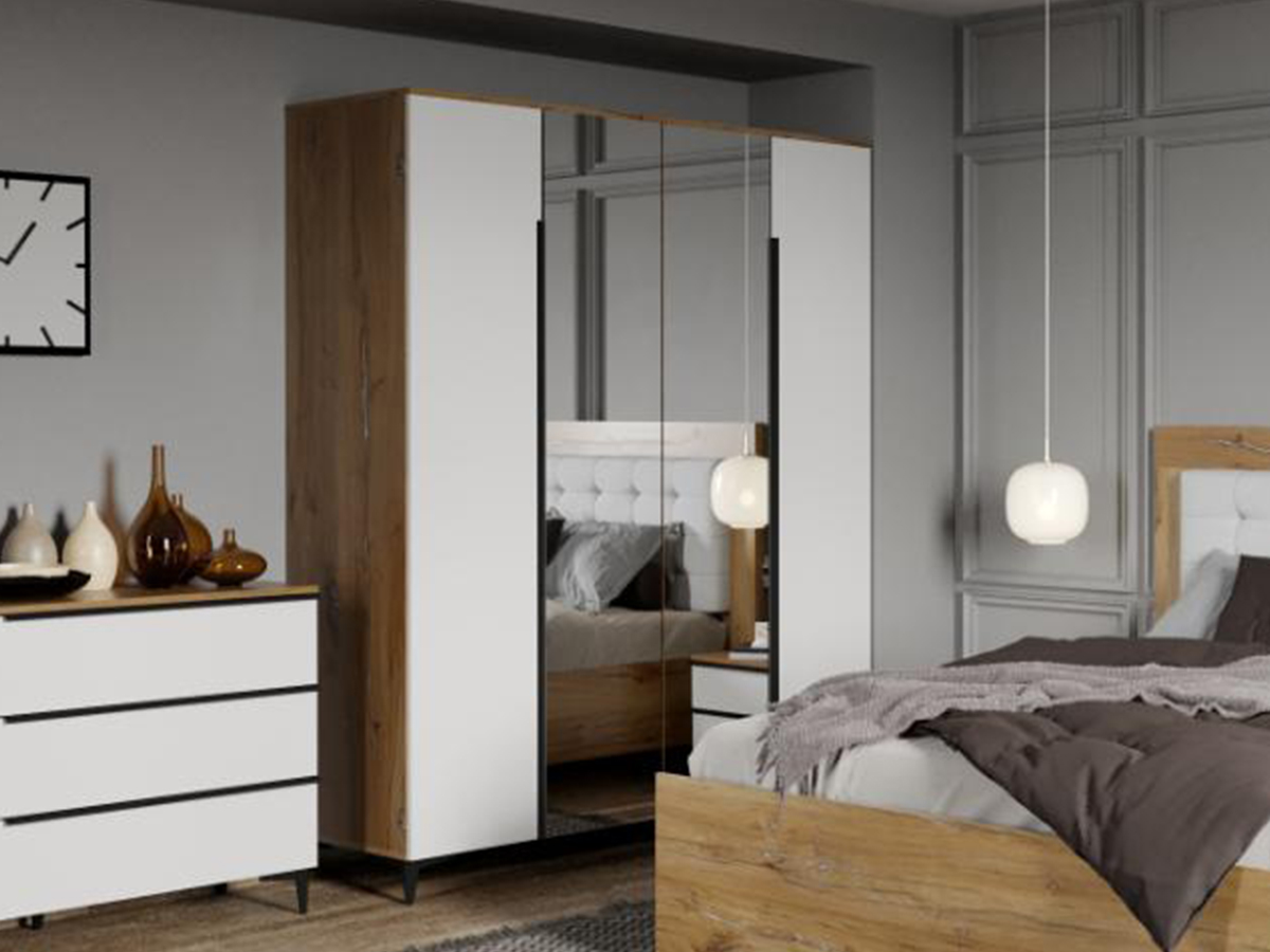 Set Mobila Dormitor Montero cu oglinda Un dormitor matrimonial ce are un aspect modern , imbinand finisajul Flagstaff Oak al carcaselor si Alb al fronturilor cu manerele si picioarele negre , creand un ambient cald si primitor. Dulapul cu 4 usi are dimensiuni generoase. Restul corpurilor de mobilier, comoda si noptierele, ofera la randul lor spatii de depozitare in completarea dulapului, prin sertare . Oglinda, pe langa utilitatea sa de baza, da senzatia de camera marita si spatioasa. Corpuri Set Mobila Dormitor Montero cu oglinda Dulap cu oglinda – L 165 x A 52 x H 204cm – Schita Montaj Compartimentat cu 8 polite si o bara de umerase. Pat Dormitor Beverley Tapitat Alb – L 187,7 sau 167,7 x A 203,2 x H 115,5cm Schita Montaj Pat 140×200  /  Schita Montaj Pat 160×200 Comoda – L 111 x A 40 x H 80cm – Schita Montaj Cu 3 sertare. Set noptiere – L 51 x A 35 x H 44cm – Schita Montaj Fiecare cu cate doua sertare. Corp sertare (optional) – L 80 x A 37 x H 34cm – Schita Montaj Cu doua sertare. Livrare Gratuita prin flota proprie Suntem producatori de mobilier Toate corpurile au o garantie de 2 ani Pat Dormitor Beverley Tapitat Alb Patul matrimonial cu finisajul  Flagstaff Oak,  mentine linia de design al setului de dormitor.  Tapiteria alba din piele artificiala  ofera si un plus de frumusete si eleganta, pe langa confortul fizic. Cantul aplicat pe capatul mare al patului este unul de 32mm. Latime: 187,7 / 167,7 cm Adancime: 203,2 cm Inaltime capat mic: 43,8 cm (fara saltea) Adancime saltea: 9 cm Inaltime capat mare: 115,5 cm Dimensiuni tapiterie: 163,5 x 52 cm / 143,5 x 52 cm Dimensiunile recomandate pt grosimea saltelei sunt 20-22 cm  (spatiul de sub tapiterie este limitat) Suport de saltea din pal brut inclus.   Salteaua nu este inclusa! Bifati sus daca doriti. Saltea Compatibila:  140×200  /  160×200 cm Set Mobila Dormitor Montero cu oglinda O solutie ideala pentru un dormitor matrimonial. Corpurile din Set Mobila Dormitor Montero cu oglinda sunt realizate din PAL melaminat de 16 mm cu finisaj Flagstaff Oak si Alb , care creeaza un spatiu primitor si un ambient cald. Cantul aplicat este unul de 0,6 ce le permite muchiilor sa fie placute la atingere  fiind finisate si atent retusate. Pretul afisat nu include alte accesorii sau obiecte de decor (tablouri, elemente de iluminat, asternuturi, covor etc.) Produsul se livreaza demontat si este insotit de accesorii si instructiuni de asamblare. Dimensiunile sunt exprimate in cm si pot oscila intre ± 10 mm.
