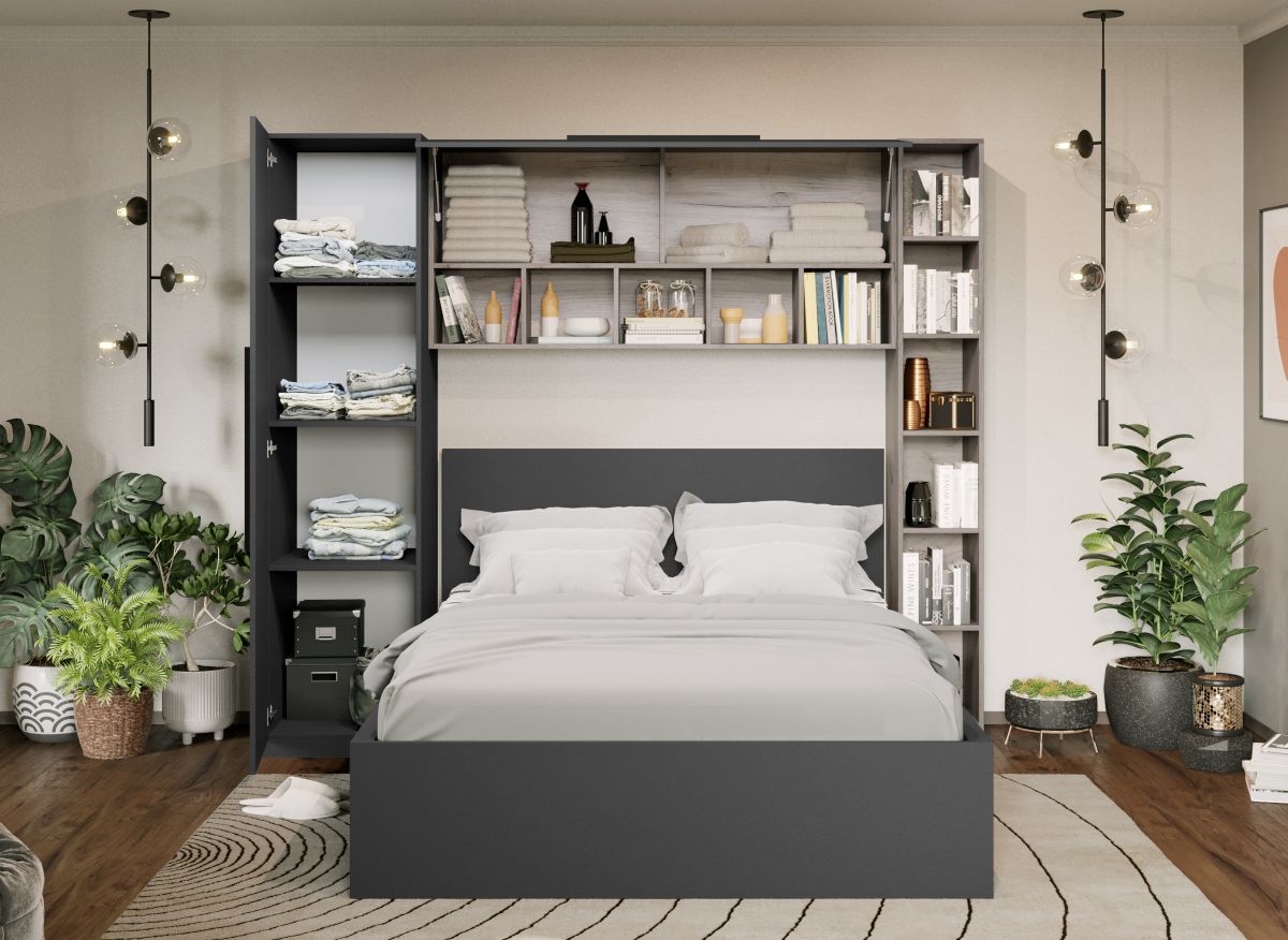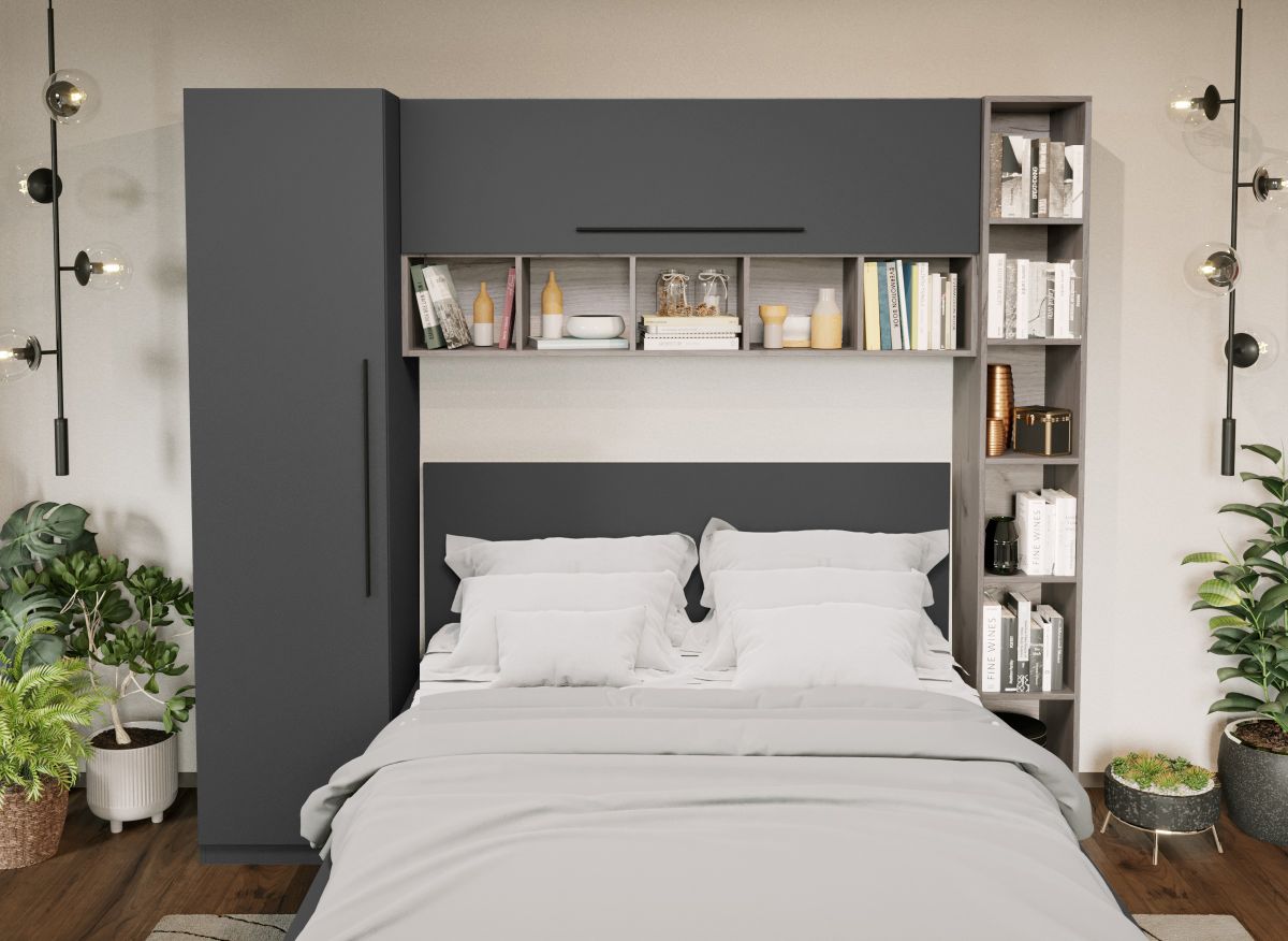 Set Dormitor Noce 2.33m cu pat incadrat Ideal pentru camere mici sau care vor sa economiseasca spatiu. Corpurile din Set Dormitor Noce 2.33m cu pat incadrat sunt spatioase si indeplinesc atat un rol estetic, cat si unul functional desavarsit. Finisajul gri antracit in combinatie cu stejarul k02 si manerele negre creeaza un ambient modern si relaxant. Include pat 140×200, corp suprapozabil suspendat deasupra patului si dulapuri laterale . Dimensiunea peretelui pe care se poate pozitiona este de minim 2.33m . Dormitorul este compus din: Dulap 0.51m – L 51 x A 53 x H 199cm – Schita Montaj Corp Polite 0.28m – L 28 x A 33.6 x H 199cm – Schita Montaj Corp Suprapozabil – L 154 x A 30.4 x H 69 cm – Schita Montaj Compartimentate cu 6 polite inchise, 11 deschise. Pat matrimonial – L 151.4 x A 211 x H 95cm – Schita Montaj Suport de saltea inclus. Sustine pana la 300kg. Set 2 sertare fata (optional) – L 103 x A 69.4 x H 28.7cm – Schita Montaj Poti alege 2 lazi pentru depozitare. Livrare Gratuita prin flota proprie Suntem producatori de mobilier Toate corpurile au o garantie de 2 ani Video de prezentare familie Videoul de prezentare poate contine mai multe corpuri de mobilier sau mai putine in comparatie cu produsul de pe aceasta pagina. Scopul acestui video este de a detalia aspectul materialelor, accesoriilor cat si a familiei din care face parte. Set Dormitor Noce 2.33m cu pat incadrat Se pot pune 2 sertare de depozitare in fata pe stanga si dreapta. Este rezistent cu sustinere in mai multe elemente: puncte de sprijin pe doua axe, 2 linii de sustinere pe lungime/laterale + 1 T central, L-uri metalice pe colturi Dimensiuni Pat Gri Latime: 151.4 cm Adancime: 211 cm Inaltime capat mare: 95 cm Inaltime capat mic: 36.8 cm Spatiu incadrament saltea: 7 cm (cat intra salteaua in cadru) Spatiu de la suport saltea la pardoseala: 30.5 cm Suportul de saltea din pal brut este inclus in pret. Saltea Compatibila 140×200 cm. Salteaua nu este inclusa! Bifati sus ca doriti. Alege 2 lazi pentru depozitare Sporeste utilitatea patului prin lazile de depozitare. Reperul de jos este din pal de 16mm ce ofera o rezistenta sporita. Nu necesita fixarea pe cadrul patului, sunt pe roti si culiseaza sub pat iar frontul sertarului se opreste in laterala patului mascand spatiul de sub pat. Pot fi puse 2 sertare. Dimensiune 1 sertar: 28.7 cm x 103 cm x 69.4 cm. Set Dormitor Noce 2.33m cu pat incadrat Face parte din familia de mobila pentru dormitor Noce . Mobileaza un dormitor rapid si usor. Corpurile din Set Dormitor Noce 2.33m cu pat incadrat sunt realizate din PAL melaminat cu finisaj gri antracit si stejar k02 , o textura similara lemnului, care creeaza un contrast rafinat si un ambient placut. Cantul aplicat este unul de 0,6 ce le permite muchiilor sa fie placute la atingere fiind finisate si atent retusate. Pretul afisat nu include alte accesorii sau obiecte de decor (tablouri, elemente de iluminat, asternuturi, covor etc.) Produsul se livreaza demontat si este insotit de accesorii si instructiuni de asamblare. Dimensiunile sunt exprimate in cm si pot oscila intre ± 10 mm.