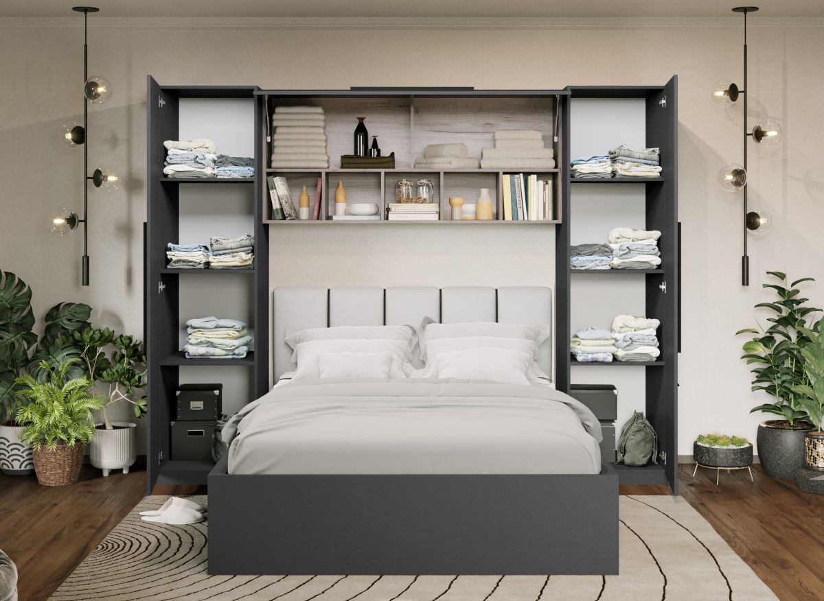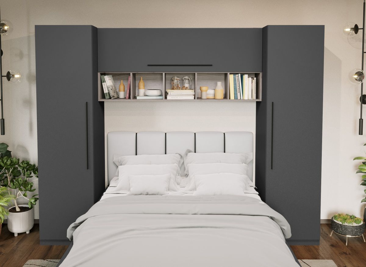 Set Dormitor Noce 2.56m cu pat tapitat Alb incadrat Ideal pentru camere mici sau care vor sa economiseasca spatiu. Corpurile din Set Dormitor Noce 2.56m cu pat tapitat Alb incadrat sunt spatioase si indeplinesc atat un rol estetic, cat si unul functional desavarsit. Finisajul gri antracit in combinatie cu stejarul k02 si manerele negre creeaza un ambient modern si relaxant. Include pat 140×200, corp suprapozabil suspendat deasupra patului si dulapuri laterale . Dimensiunea peretelui pe care se poate pozitiona este de minim 2.56m . Dormitorul este compus din: 2 bucati x Dulap 0.51m – L 51 x A 53 x H 199cm – Schita Montaj Corp Suprapozabil – L 154 x A 30.4 x H 69 cm – Schita Montaj Compartimentate cu 10 polite inchise, 5 deschise. Pat matrimonial Tapitat – L 151.4 x A 211 x H 95cm – Schita Montaj Suport de saltea inclus. Sustine pana la 300kg. Tapiterie Alba din piele ecologica. Set 2 sertare fata (optional) – L 103 x A 69.4 x H 28.7cm – Schita Montaj Poti alege 2 lazi pentru depozitare. Livrare Gratuita prin flota proprie Suntem producatori de mobilier Toate corpurile au o garantie de 2 ani Video de prezentare familie Videoul de prezentare poate contine mai multe corpuri de mobilier sau mai putine in comparatie cu produsul de pe aceasta pagina. Scopul acestui video este de a detalia aspectul materialelor, accesoriilor cat si a familiei din care face parte. Set Dormitor Noce 2.56m cu pat tapitat Alb incadrat Tapiterie Alba cu insertii negre din piele ecologica. Se pot pune 2 sertare de depozitare in fata pe stanga si dreapta. Este rezistent cu sustinere in mai multe elemente: puncte de sprijin pe doua axe, 2 linii de sustinere pe lungime/laterale + 1 T central, L-uri metalice pe colturi Dimensiuni Pat Gri Latime: 151.4 cm Adancime: 211 cm Inaltime capat mare: 95 cm Inaltime capat mic: 36.8 cm Spatiu incadrament saltea: 7 cm (cat intra salteaua in cadru) Spatiu de la suport saltea la pardoseala: 30.5 cm Suportul de saltea din pal brut este inclus in pret. Saltea Compatibila 140×200 cm. Salteaua nu este inclusa! Bifati sus ca doriti. Alege 2 lazi pentru depozitare Sporeste utilitatea patului prin lazile de depozitare. Reperul de jos este din pal de 16mm ce ofera o rezistenta sporita. Nu necesita fixarea pe cadrul patului, sunt pe roti si culiseaza sub pat iar frontul sertarului se opreste in laterala patului mascand spatiul de sub pat. Pot fi puse 2 sertare. Dimensiune 1 sertar: 28.7 cm x 103 cm x 69.4 cm. Set Dormitor Noce 2.56m cu pat tapitat Alb incadrat Face parte din familia de mobila pentru dormitor Noce . Mobileaza un dormitor rapid si usor. Corpurile din Set Dormitor Noce 2.56m cu pat tapitat Alb incadrat sunt realizate din PAL melaminat cu finisaj gri antracit si stejar k02 , o textura similara lemnului, care creeaza un contrast rafinat si un ambient placut. Cantul aplicat este unul de 0,6 ce le permite muchiilor sa fie placute la atingere fiind finisate si atent retusate. Pretul afisat nu include alte accesorii sau obiecte de decor (tablouri, elemente de iluminat, asternuturi, covor etc.) Produsul se livreaza demontat si este insotit de accesorii si instructiuni de asamblare. Dimensiunile sunt exprimate in cm si pot oscila intre ± 10 mm.