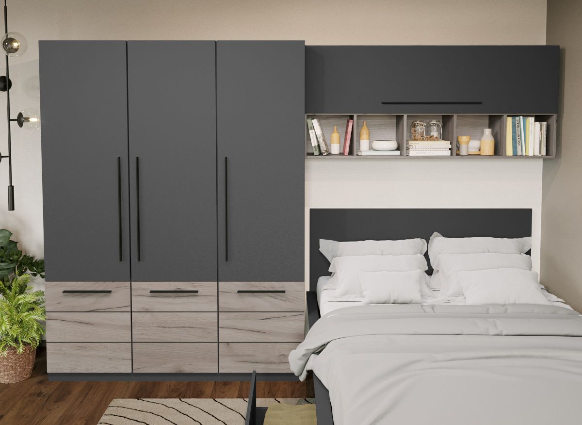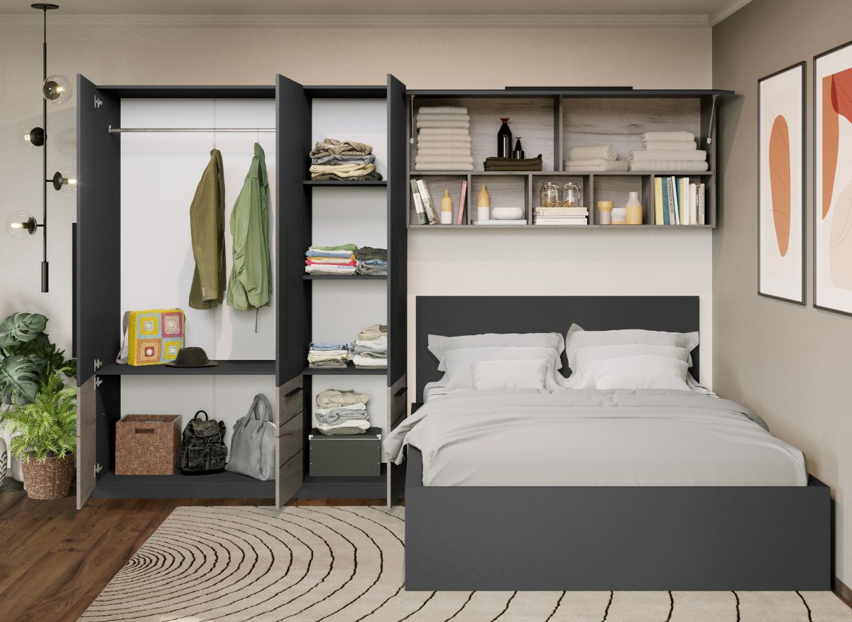 Set Dormitor Noce 3.05m cu pat incadrat Ideal pentru camere mici sau care vor sa economiseasca spatiu. Corpurile din Set Dormitor Noce 3.05m cu pat incadrat sunt spatioase si indeplinesc atat un rol estetic, cat si unul functional desavarsit. Finisajul gri antracit in combinatie cu stejarul k02 si manerele negre creeaza un ambient modern si relaxant. Include pat 140×200, corp suprapozabil suspendat deasupra patului si dulap lateral . Dimensiunea peretelui pe care se poate pozitiona este de minim 3.05m . Dormitorul este compus din: Dulap 1.51m – L 151 x A 53 x H 199cm – Schita Montaj Compartimentat cu 6 polite si bara de umerase. Corp Suprapozabil – L 154 x A 30.4 x H 69 cm – Schita Montaj Compartimentat cu 2 polite inchise si 5 deschise. Pat matrimonial – L 151.4 x A 211 x H 95cm – Schita Montaj Suport de saltea inclus. Sustine pana la 300kg. Set 2 sertare fata (optional) – L 103 x A 69.4 x H 28.7cm – Schita Montaj Poti alege 2 lazi pentru depozitare. Livrare Gratuita prin flota proprie Suntem producatori de mobilier Toate corpurile au o garantie de 2 ani Video de prezentare familie Videoul de prezentare poate contine mai multe corpuri de mobilier sau mai putine in comparatie cu produsul de pe aceasta pagina. Scopul acestui video este de a detalia aspectul materialelor, accesoriilor cat si a familiei din care face parte. Set Dormitor Noce 3.05m cu pat incadrat Se pot pune 2 sertare de depozitare in fata pe stanga si dreapta. Este rezistent cu sustinere in mai multe elemente: puncte de sprijin pe doua axe, 2 linii de sustinere pe lungime/laterale + 1 T central, L-uri metalice pe colturi Dimensiuni Pat Gri Latime: 151.4 cm Adancime: 211 cm Inaltime capat mare: 95 cm Inaltime capat mic: 36.8 cm Spatiu incadrament saltea: 7 cm (cat intra salteaua in cadru) Spatiu de la suport saltea la pardoseala: 30.5 cm Suportul de saltea din pal brut este inclus in pret. Saltea Compatibila 140×200 cm. Salteaua nu este inclusa! Bifati sus ca doriti. Alege 2 lazi pentru depozitare Sporeste utilitatea patului prin lazile de depozitare. Reperul de jos este din pal de 16mm ce ofera o rezistenta sporita. Nu necesita fixarea pe cadrul patului, sunt pe roti si culiseaza sub pat iar frontul sertarului se opreste in laterala patului mascand spatiul de sub pat. Pot fi puse 2 sertare. Dimensiune 1 sertar: 28.7 cm x 103 cm x 69.4 cm. Set Dormitor Noce 3.05m cu pat incadrat Face parte din familia de mobila pentru dormitor Noce . Mobileaza un dormitor rapid si usor. Corpurile din Set Dormitor Noce 3.05m cu pat incadrat sunt realizate din PAL melaminat cu finisaj gri antracit si stejar k02 , o textura similara lemnului, care creeaza un contrast rafinat si un ambient placut. Cantul aplicat este unul de 0,6 ce le permite muchiilor sa fie placute la atingere fiind finisate si atent retusate. Pretul afisat nu include alte accesorii sau obiecte de decor (tablouri, elemente de iluminat, asternuturi, covor etc.) Produsul se livreaza demontat si este insotit de accesorii si instructiuni de asamblare. Dimensiunile sunt exprimate in cm si pot oscila intre ± 10 mm.