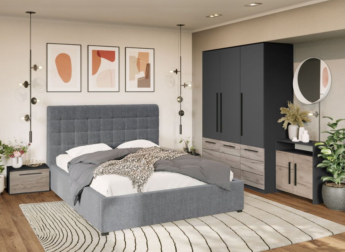 Set Mobila Dormitor Noce T4 cu Pat Tapitat este un dormitor matrimonial cu un design inedit. Corpurile acestuia sunt spatioase si indeplinesc atat un rol estetic, cat si unul functional desavarsit. Finisajul gri antracit in combinatie cu stejarul k02 si manerele negre creeaza un ambient modern si relaxant. Dormitorul este compus din: Dulap 1.51m – L 151 x A 53 x H 199cm – Schita Montaj Compartimentat cu 6 polite si bara de umerase. Pat tapitat matrimonial fix – L 152/172/192 x A 215.5 x H 114 cm – Schita Pat Suport de saltea inclus. Sustine pana la 300kg. Set noptiere – L 46 x A 35 x H 34cm – Schita Montaj Cu usi si spatiu generos. Comoda (optional) – L 67 x A 34 x H 71cm – Schita Montaj Spatiu depozitare acoperit cu 2 usi. Livrare Gratuita prin flota proprie Suntem producatori de mobilier Toate corpurile au o garantie de 2 ani Video de prezentare familie Videoul de prezentare poate contine mai multe corpuri de mobilier sau mai putine in comparatie cu produsul de pe aceasta pagina. Scopul acestui video este de a detalia aspectul materialelor, accesoriilor cat si a familiei din care face parte. Pat Tapitat Rivo cu somiera fixa Acest Pat tapitat Rivo cu somiera fixa se remarca prin designul sau placut si armonios, avand un spatar cu margini rotunjite. Suportul inclus este realizat din lemn stratificat cu lamele din lemn , ce ofera un suport optim pentru saltea. Patul are picioruse de 3 cm, care permit aerului sa circule, astfel se ventileaza salteaua si spatiul din cadrul patului. Tapiteria este din stofa gri, completand perfect corpurile din Set Mobila Dormitor Noce T4 cu Pat Tapitat. Dimensiuni Pat Rivo Latime: 152 / 172 / 192 cm Adancime: 215.5 cm Inaltime capat mare: 114 cm Inaltime tablie: 77.5 cm Inaltime capat mic: 36.5 cm Spatiu incadrament saltea: 6 cm (cat intra salteaua in cadru) Greutate maxima recomandata: 300kg Patul are somiera fixa inclusa, nu se percep costuri suplimentare. Saltea Compatibila 140×200 cm, 160×200 cm sau 180×200 cm in functie de dimensiunea de pat aleasa. Salteaua nu este inclusa! Bifati sus ca doriti. Materialul din spatele tabliei este diferit de tapiteria din fata. Este o tesatura neagra, cu o textura diferita. Set Mobila Dormitor Noce T4 cu Pat Tapitat Face parte din familia de mobila pentru dormitor Noce . Mobileaza un dormitor rapid si usor. O solutie ideala pentru un dormitor matrimonial. Corpurile din Set Mobila Dormitor Noce T4 cu Pat Tapitat sunt realizate din PAL melaminat cu finisaj gri antracit si stejar k02 , o textura similara lemnului, care creeaza un contrast rafinat si un ambient placut. Cantul aplicat este unul de 0,6 ce le permite muchiilor sa fie placute la atingere fiind finisate si atent retusate. Pretul afisat nu include alte accesorii sau obiecte de decor (tablouri, elemente de iluminat, asternuturi, covor etc.) Produsul se livreaza demontat si este insotit de accesorii si instructiuni de asamblare. Dimensiunile sunt exprimate in cm si pot oscila intre ± 10 mm.