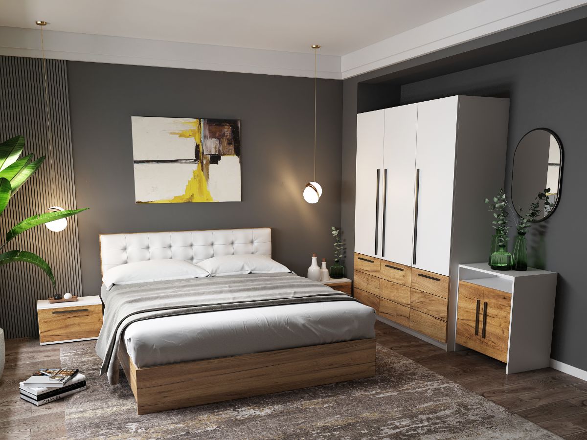 Set Mobila Dormitor Timea 5 piese Tapitat Alb Set Mobila Dormitor Timea 5 piese Tapitat Alb face parte din familia Timea care a aparut in urma emisiunii Visuri la Cheie de pe PRO TV in care Mobila Laguna a fost partener in 2019. Dulapul / Dressingul din acest set a primit un numar mare de solicitari din partea telespectatorilor si de aici a pornit crearea unui dormitor complet cu dressing modular ce poate ajunge chiar si pana la 5m. Vedeti poza dulapului din cadrul emisiunii – Click aici . Corpuri Set Mobila Dormitor Timea 5 piese Tapitat Alb Dulap 1.51m cu usi – L 151 x A 53 x H 199cm – Schita Montaj Compartimentat cu 6 polite si bara umerase. Pat matrimonial Tapitat – L 146, 166, 186 x A 203.2 x H 92cm – Schita Montaj Suport de saltea inclus. Sustine pana la 300kg. Set noptiere – L 46 x A 35 x H 34cm – Schita Montaj Cu usa si spatiu generos. Comoda – L 67 x A 40.5 x H 71.7cm – Schita Montaj Spatiu depozitare deschis si doua usi. Livrare Gratuita prin flota proprie Suntem producatori de mobilier Toate corpurile au o garantie de 2 ani Video de prezentare familie Videoul de prezentare poate contine mai multe corpuri de mobilier sau mai putine in comparatie cu produsul de pe aceasta pagina. Scopul acestui video este de a detalia aspectul materialelor, accesoriilor cat si a familiei din care face parte. Pat Set Mobila Dormitor Timea 5 piese Tapitat Alb Tapiteria poate fi alba sau wenge, la alegere. Patul matrimonial de 140, 160 sau 180×200 cm mentine linia de design al setului de dormitor. Este rezistent cu sustinere in: repere de sustinere multiple 4 linii de sustinere pe latime si 3 pe lungime L-uri metalice pe colturi Latime: 203.2 cm Adancime: 186 cm sau 166 cm sau 146 cm (la alegere) Înălțime capat mare: 92 cm Înălțime capat mic: 34 cm Suport de saltea din pal brut inclus. Saltea Compatibila 180×200 cm sau 160×200 cm sau 140×200 cm Salteaua nu este inclusa! Bifati sus ca doriti. Set Mobila Dormitor Timea 5 piese Tapitat Alb Face parte din familia de mobila pentru dormitor Timea . O solutie ideala pentru un dormitor matrimonial. Corpurile din Set Mobila Dormitor Timea 5 piese Tapitat Alb sunt realizate din PAL melaminat cu finisaj Alb si Stejar Auriu care creeaza un spatiu rafinat si un ambient placut. Cantul aplicat este unul de 0,6 ce le permite muchiilor sa fie placute la atingere fiind finisate si atent retusate. Pretul afisat nu include alte accesorii sau obiecte de decor (tablouri, elemente de iluminat, asternuturi, covor etc.) Produsul se livreaza demontat si este insotit de accesorii si instructiuni de asamblare. Dimensiunile sunt exprimate in cm si pot oscila intre ± 10 mm.