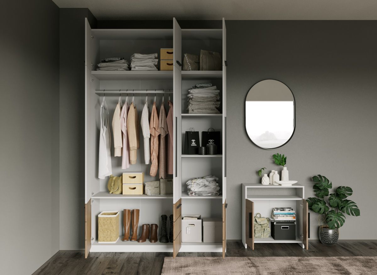 Set Mobila Dormitor Timea D3 Set Mobila Dormitor Timea D3 este un dormitor matrimonial cu un design inedit. Corpurile acestuia sunt spatioase si indeplinesc atat un rol estetic, cat si unul functional desavarsit. Finisajele Alb si Stejar Auriu creeaza un spatiu luminos si un ambient cald. Manerele negre denota un stil elegant, fiind un detaliu subtil care schimba intreg aspectul mobilierului. Dormitorul este compus din: Dulap 1.51m – L 151 x A 53 x H 199cm – Schita Montaj Compartimentat cu 6 polite si bara de umerase. Dulap suprapozabil 3U – L 151 x A 53 x H 49.2 cm – Schita Montaj Compartimentat cu 2 polite. Pat tapitat matrimonial rabatabil – L 152/172/192 x A 215.5 x H 114 cm – Schita Pat Suport de saltea inclus. Sustine pana la 300kg. Set noptiere – L 46 x A 35 x H 34cm – Schita Montaj Cu usi si spatiu generos. Comoda (optional) – L 67 x A 40.5 x H 71.7cm – Schita Montaj Spatiu depozitare acoperit cu 2 usi. Livrare Gratuita prin flota proprie Suntem producatori de mobilier Toate corpurile au o garantie de 2 ani Video de prezentare familie Videoul de prezentare poate contine mai multe corpuri de mobilier sau mai putine in comparatie cu produsul de pe aceasta pagina. Scopul acestui video este de a detalia aspectul materialelor, accesoriilor cat si a familiei din care face parte. Pat Tapitat Adam cu somiera rabatabila si lada depozitare Acest Pat tapitat Adam cu somiera rabatabila si lada de depozitare se remarca prin designul sau modern si elegant, avand un spatar distinctiv cu linii verticale. Patul are somiera rabatabila cu pistoane (sistem gas lift) inclusa, realizata dintr-un cadru metalic, cu lamele din lemn. Lada este din pal, captusita cu o panza neagra si are o inaltime de 26 cm . Patul are picioruse de 3 cm , care permit aerului sa circule. Tapiteria este din stofa bej, completand perfect corpurile din Set Mobila Dormitor Timea D3. Dimensiuni Pat Adam Latime: 152 / 172 / 192 cm Adancime: 215.5 cm Inaltime capat mare: 114 cm Inaltime capat mic: 36.5 cm Spatiu incadrament saltea: 6 cm (cat intra salteaua in cadru) Greutate maxima recomandata: 300kg Patul are somiera rabatabila cu pistoane (sistem gas lift) inclusa, nu se percep costuri suplimentare. Saltea Compatibila 140×200 cm, 160×200 cm sau 180×200 cm in functie de dimensiunea de pat aleasa. Salteaua nu este inclusa! Bifati sus ca doriti. Materialul din spatele tabliei este diferit de tapiteria din fata. Este o tesatura neagra, cu o textura diferita. Set Mobila Dormitor Timea D3 Face parte din familia de mobila pentru dormitor Timea . Mobileaza un dormitor rapid si usor. O solutie ideala pentru un dormitor matrimonial. Corpurile din Set Mobila Dormitor Timea D3 sunt realizate din PAL melaminat cu finisaj alb si stejar k03 , o textura similara lemnului, care creeaza un spatiu luminos si un ambient cald. Cantul aplicat este unul de 0,6 ce le permite muchiilor sa fie placute la atingere fiind finisate si atent retusate. Pretul afisat nu include alte accesorii sau obiecte de decor (tablouri, elemente de iluminat, asternuturi, covor etc.) Produsul se livreaza demontat si este insotit de accesorii si instructiuni de asamblare. Dimensiunile sunt exprimate in cm si pot oscila intre ± 10 mm.