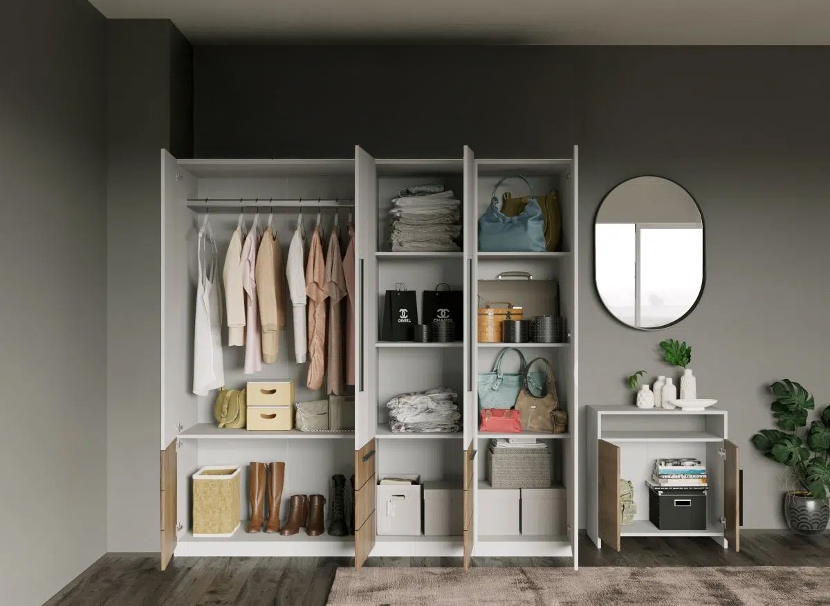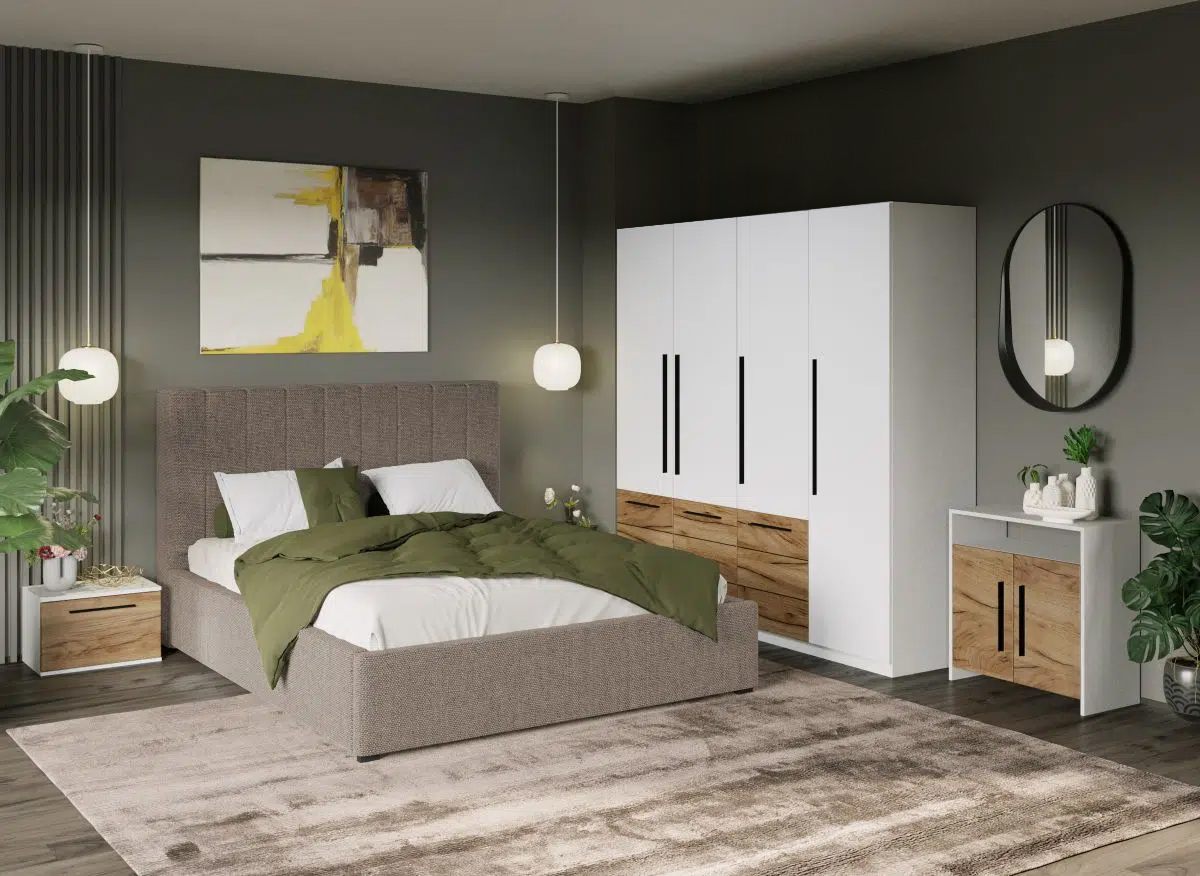 Set Mobila Dormitor Timea T5 cu Pat Tapitat este un dormitor matrimonial cu un design inedit. Corpurile acestuia sunt spatioase si indeplinesc atat un rol estetic, cat si unul functional desavarsit. Finisajele Alb si Stejar Auriu creeaza un spatiu luminos si un ambient cald. Manerele negre denota un stil elegant, fiind un detaliu subtil care schimba intreg aspectul mobilierului. Dormitorul este compus din: Dulap 1.51m – L 151 x A 53 x H 199cm – Schita Montaj Compartimentat cu 6 polite si bara de umerase. Dulap 0.51m – L 51 x A 53 x H 199cm – Schita Montaj Compartimentat cu 4 etajere. Pat tapitat matrimonial fix – L 152/172/192 x A 215.5 x H 114 cm – Schita Pat Suport de saltea inclus. Sustine pana la 300kg. Set noptiere – L 46 x A 35 x H 34cm – Schita Montaj Cu usi si spatiu generos. Comoda (optional) – L 67 x A 40.5 x H 71.7cm – Schita Montaj Spatiu depozitare acoperit cu 2 usi. Livrare Gratuita prin flota proprie Suntem producatori de mobilier Toate corpurile au o garantie de 2 ani Video de prezentare familie Videoul de prezentare poate contine mai multe corpuri de mobilier sau mai putine in comparatie cu produsul de pe aceasta pagina. Scopul acestui video este de a detalia aspectul materialelor, accesoriilor cat si a familiei din care face parte. Pat Tapitat Adam cu somiera fixa Acest Pat tapitat Adam cu somiera fixa se remarca prin designul sau modern si elegant, avand un spatar distinctiv cu linii verticale. Suportul inclus este realizat din lemn stratificat cu lamele din lemn , ce ofera un suport optim pentru saltea. Patul are picioruse de 3 cm, care permit aerului sa circule, astfel se ventileaza salteaua si spatiul din cadrul patului. Tapiteria este din stofa bej, completand perfect corpurile din Set Mobila Dormitor Timea T5 cu Pat Tapitat. Dimensiuni Pat Adam Latime: 152 / 172 / 192 cm Adancime: 215.5 cm Inaltime capat mare: 114 cm Inaltime capat mic: 36.5 cm Spatiu incadrament saltea: 6 cm (cat intra salteaua in cadru) Greutate maxima recomandata: 300kg Patul are somiera fixa inclusa, nu se percep costuri suplimentare. Saltea Compatibila 140×200 cm, 160×200 cm sau 180×200 cm in functie de dimensiunea de pat aleasa. Salteaua nu este inclusa! Bifati sus ca doriti. Materialul din spatele tabliei este diferi t de tapiteria din fata. Este o tesatura neagra, cu o textura diferita. Set Mobila Dormitor Timea T5 cu Pat Tapitat Face parte din familia de mobila pentru dormitor Timea . Mobileaza un dormitor rapid si usor. O solutie ideala pentru un dormitor matrimonial. Corpurile Set Mobila Dormitor Timea T5 cu Pat Tapitatsunt realizate din PAL melaminat cu finisaj alb si stejar k03 , o textura similara lemnului, care creeaza un spatiu luminos si un ambient cald. Cantul aplicat este unul de 0,6 ce le permite muchiilor sa fie placute la atingere fiind finisate si atent retusate. Pretul afisat nu include alte accesorii sau obiecte de decor (tablouri, elemente de iluminat, asternuturi, covor etc.) Produsul se livreaza demontat si este insotit de accesorii si instructiuni de asamblare. Dimensiunile sunt exprimate in cm si pot oscila intre ± 10 mm.