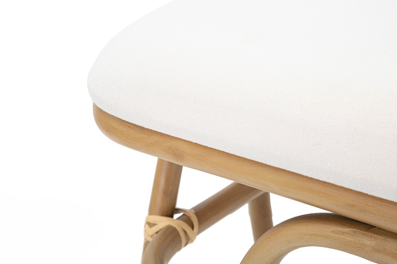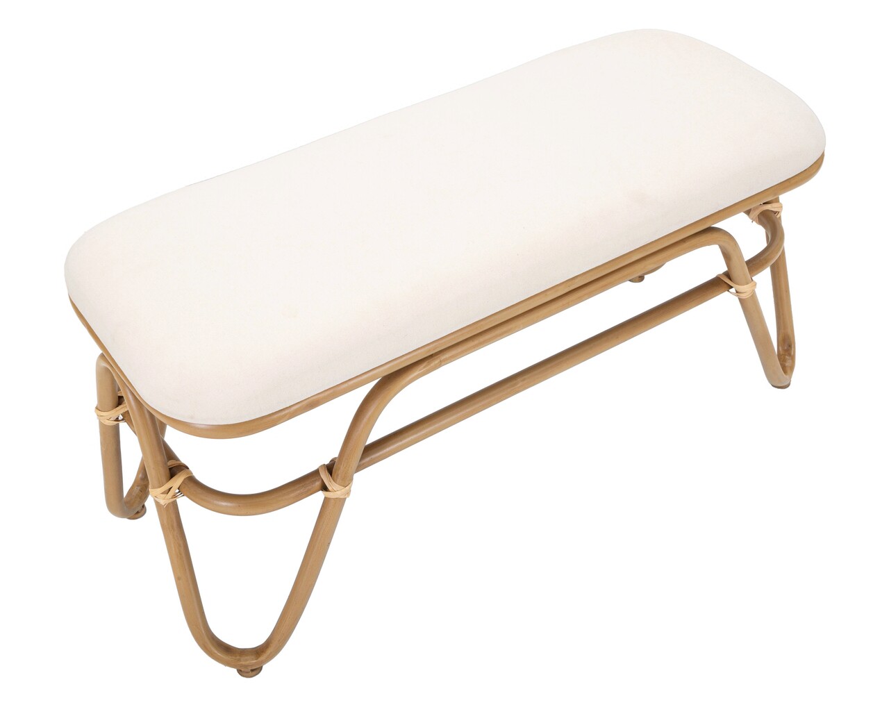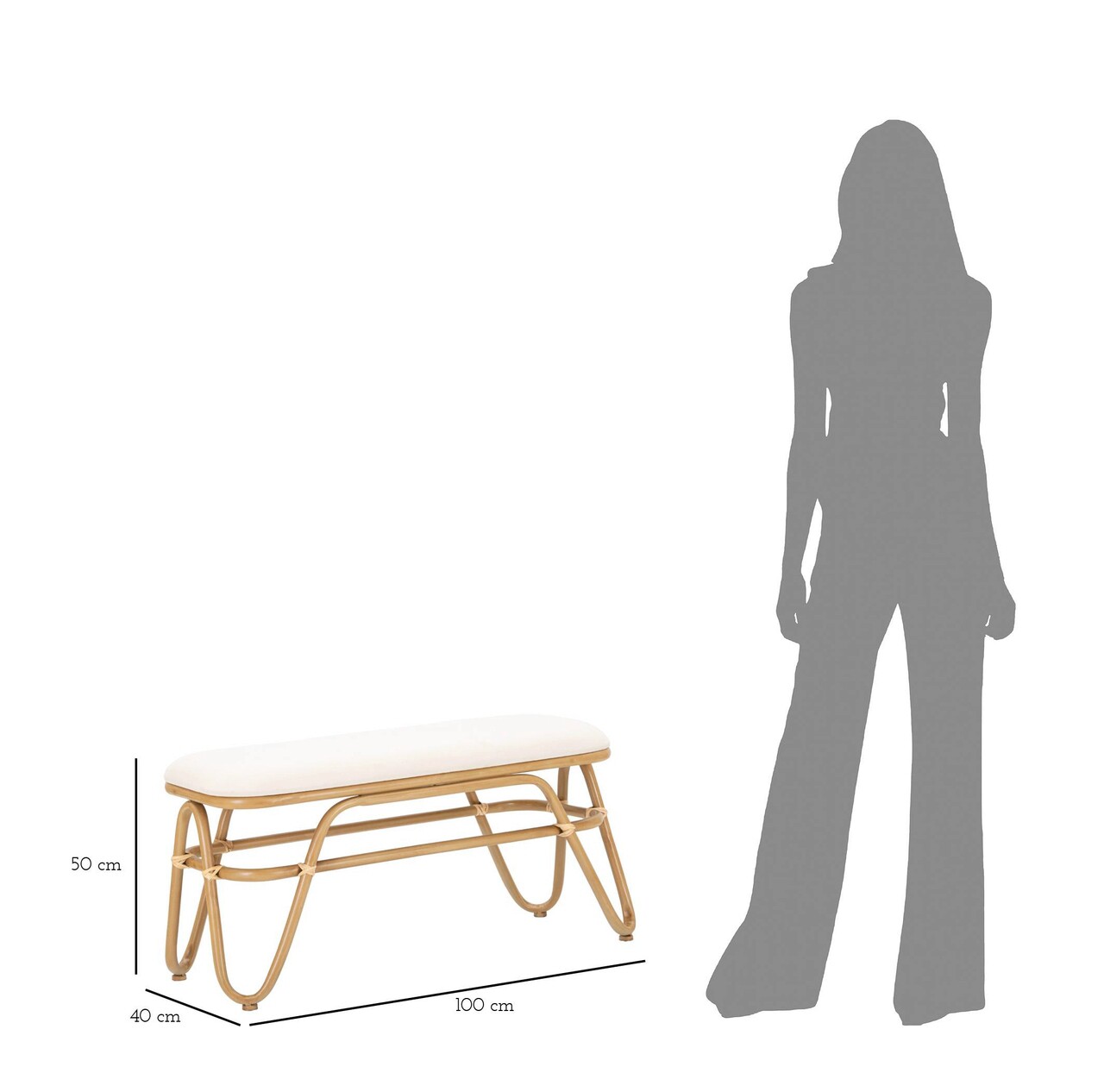 <p>Bancheta dreptunghiulara din metal cu finisaje din ratan si sezut tapitat in tesatura alba, cu un design simplu si linii rotunjite.<br />Compozitie material: fier, plastic, poliester, umplutura burete.</p>