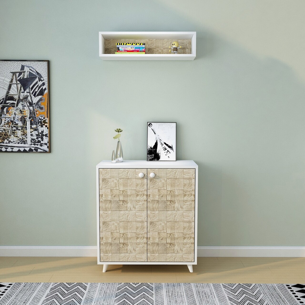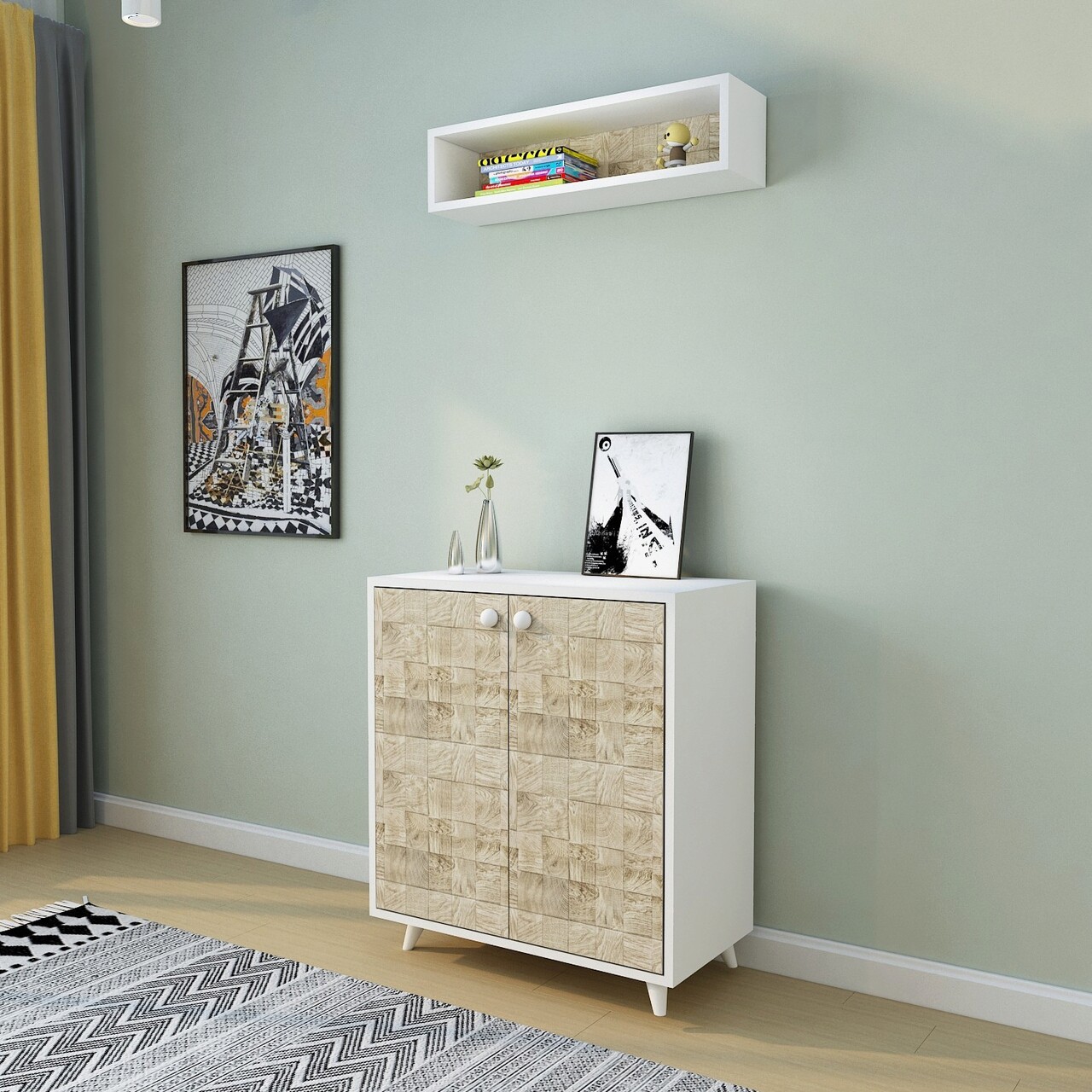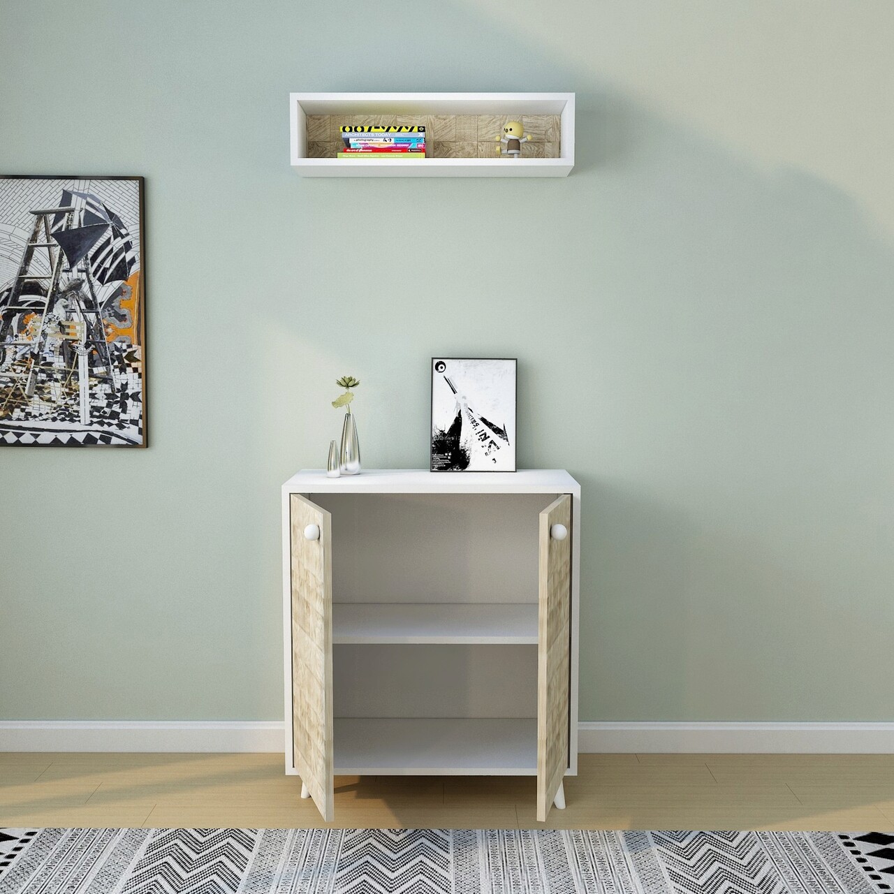 Mezoni-Cuier de perete, Lacivert, Hasır, 80x80x40 cm, Stejar / Alb