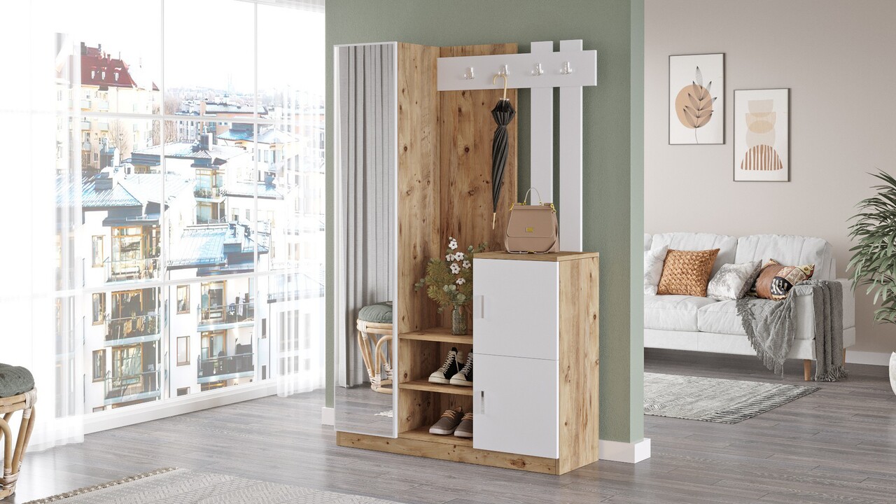 Mezoni-Dulap cu pantofar, cuier si oglinda DD7-AW, Locelso, 113.6×37.5×179.7 cm, PAL, natural/alb