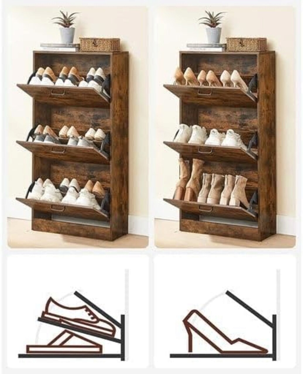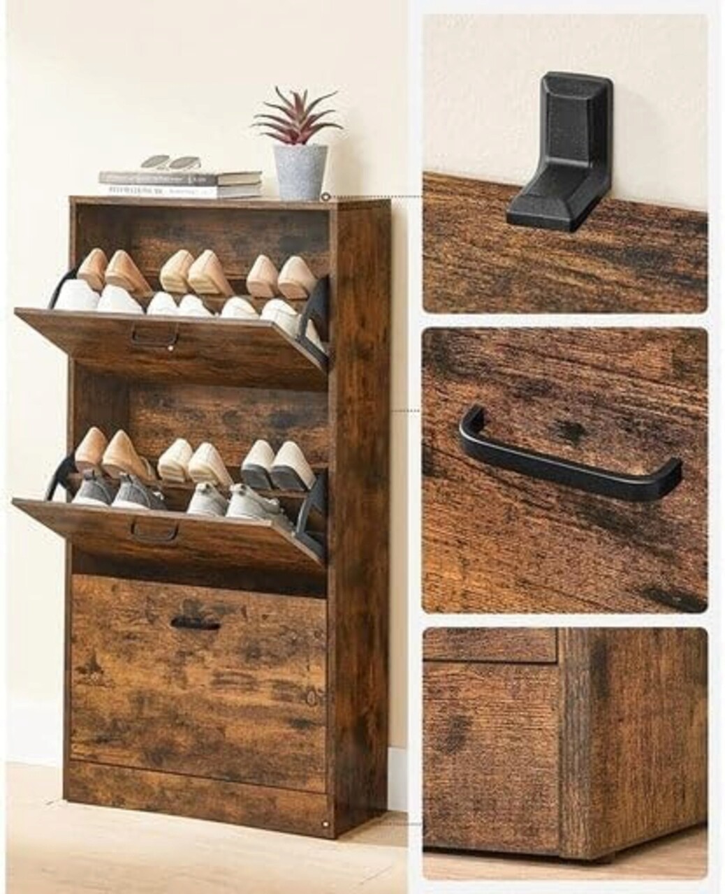 <p>Permite depozitarea a 18 perechi de pantofi de dama sau 12 perechi de pantofi de barbati; cu compartimente detasabile, foarte usor de indepartat, pentru pantofii cu toc sau botinele dva.<br />Suprafata rezistenta la zgarieturi a dulapului pentru hol, usor de intretinut, poate fi pur si simplu curatata cu o carpa umeda.<br />Pentru a va asigura ca dulapul pentru pantofi ramane stabil chiar si atunci cand este complet incarcat, este inclusa o protectie anti-inclinare.<br />Toate piesele sunt numerotate, astfel incat sa nu existe nicio posibilitate de confuzie; instructiunile detaliate si ilustrate va ghideaza pas cu pas pana la noul dvs. pantofar. Un surub de rezerva este furnizat in cazul in care aveti nevoie de el mai tarziu.<br />Greutate maxima suportata/raft: 10 kg.</p>