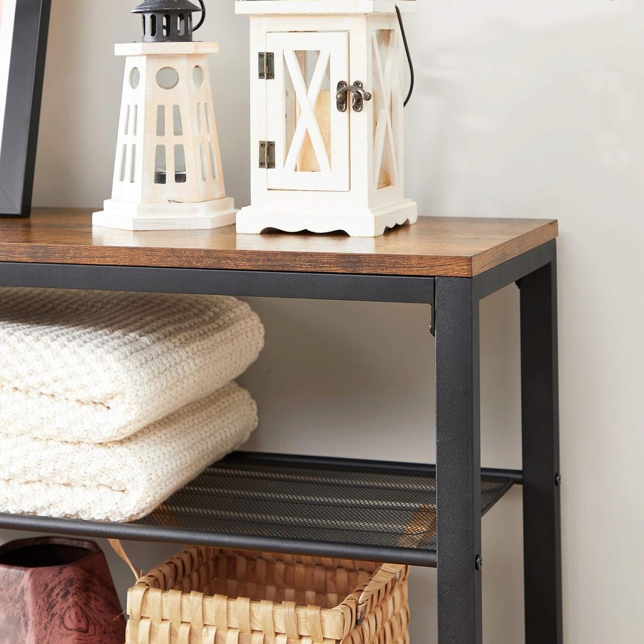 <p>Intrarea este cartea de vizita a casei dvs. Cu un blat maro rustic, rafturi dense din plasa metalica si cadru negru mat, acest raft pentru pantofi in stil industrial va adauga cu siguranta stil holului casei si va va lasa oaspetii cu o prima impresie buna.<br /><br />Caracteristici:<br />- Compozitie material: PAL, otel<br />- Dimensiuni produs: 100 x 30 x 110 cm<br />- Greutate maxima suportata pentru blat: 10 kg<br />- Greutate maxima suportata pentru rafturile din plasa metalica: 5 kg<br />- Instructiuni de asamblare in engleza, germana, franceza, spaniola si italiana</p>