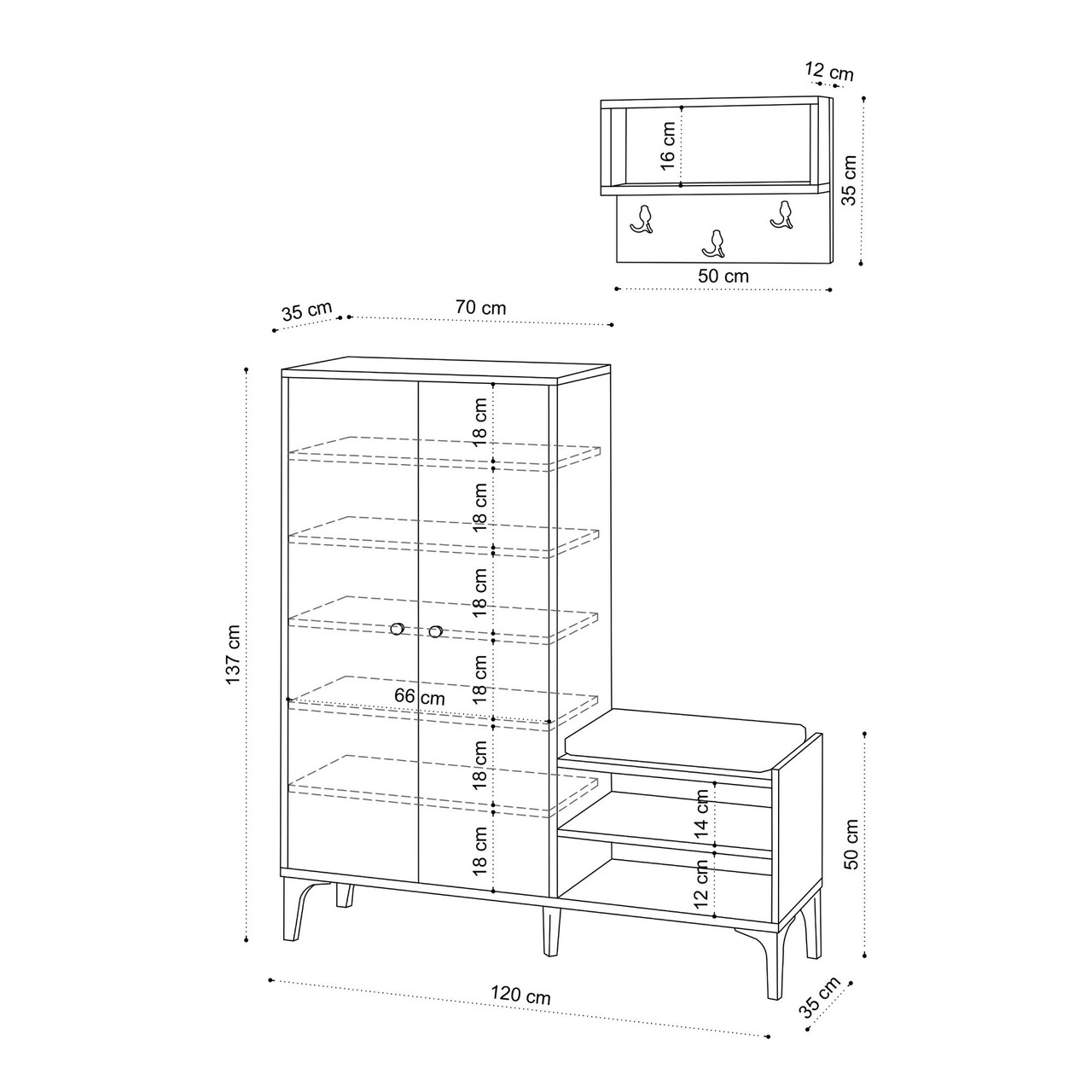<p>Setul este format din pantofar: 120 x 35 x 137 cm (Lxlxh) si cuier 50 x 12 x 35 cm (Lxlxh).<br />Compozitie material: pal melaminat, picioare din plastic.<br />Produsul se poate fixa in perete.</p>
