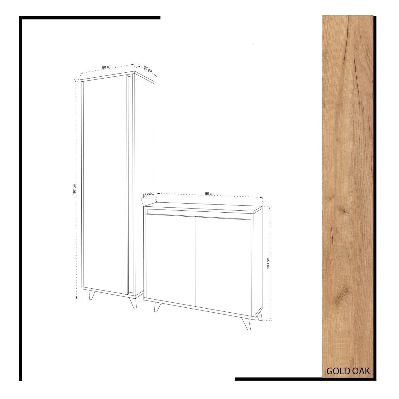 <p>Setul este format din pantofar: 80 x 35 x 100 cm (Lxlxh) si dulap 50 x 35 x 192 cm (Lxlxh).<br />Compozitie material: pal melaminat.<br />Grosime: 1.8 cm.<br />Produsele se pot fixa in perete.</p>