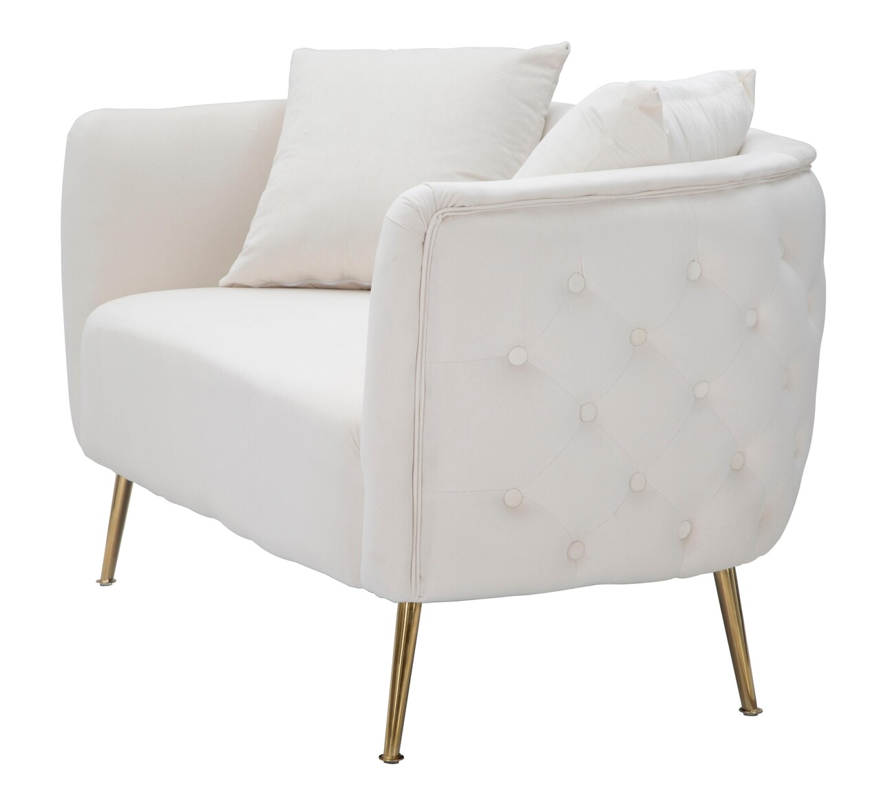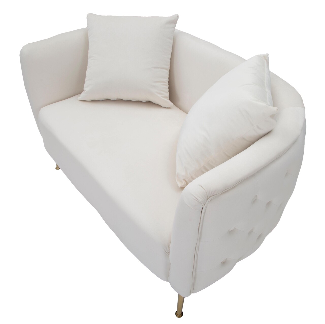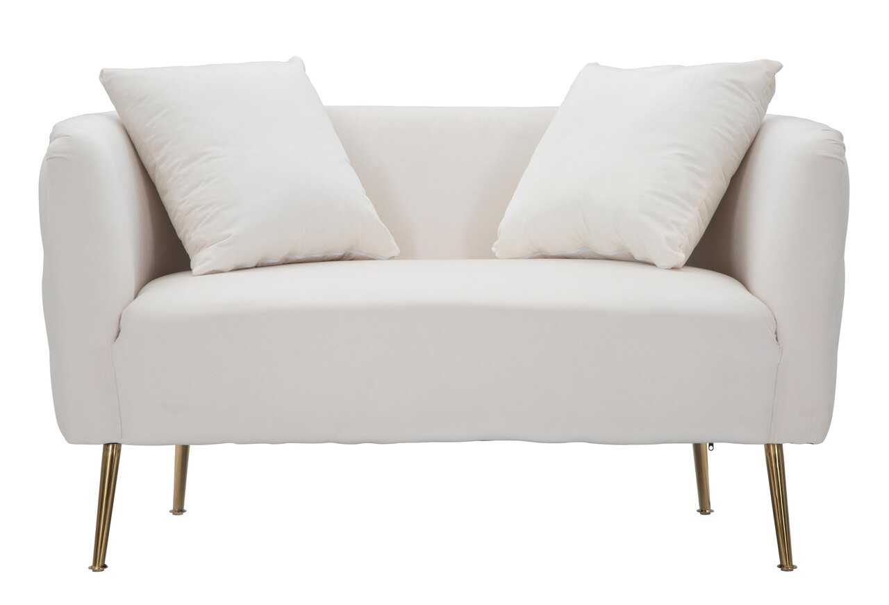 Canapea cu 2 locuri, din tesatura captusita, cu cotiere confortabile. Culoarea tesaturii impreuna cu eleganta picioarelor aurii adauga o nota de clasa oricarei incaperi. Este accesorizata cu 2 perne decorative.Compozitie material: placaj, metal, tapiterie din catifea, umplutura din bureteInaltime picioare: 20 cmDimensiuni perna: 42 x 42 x 18 cmInaltime sezut: 43 cm