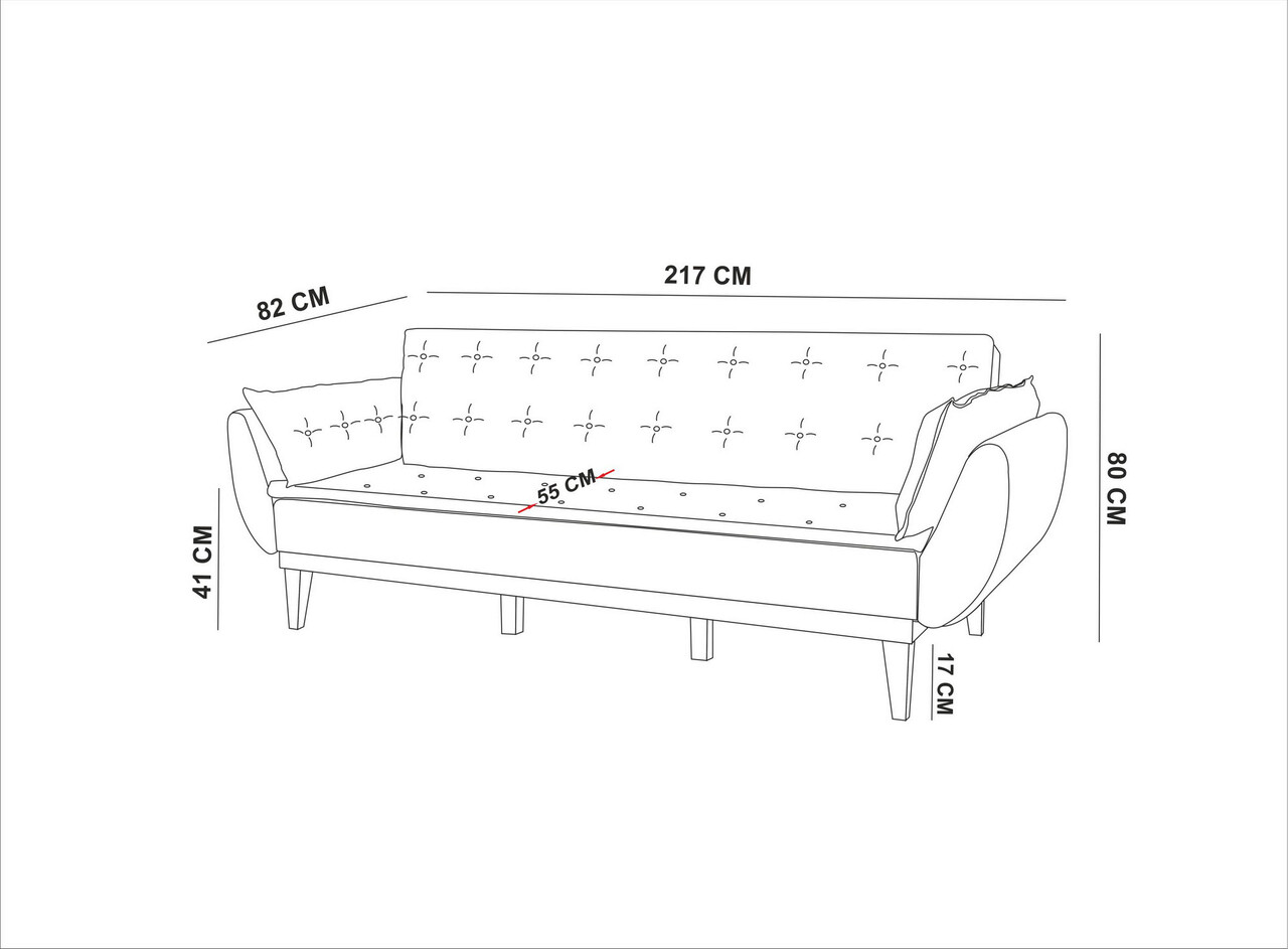 Tesatura: InPicioare din lemn (17 cm)Spuma 28 DNSAdancime: 82 cmAdâncimea scaunului: 55 cmInaltime sezut: 41 cmDimensiunea patului: Latime: 184 cm Adancime: 107 cmExtensibil