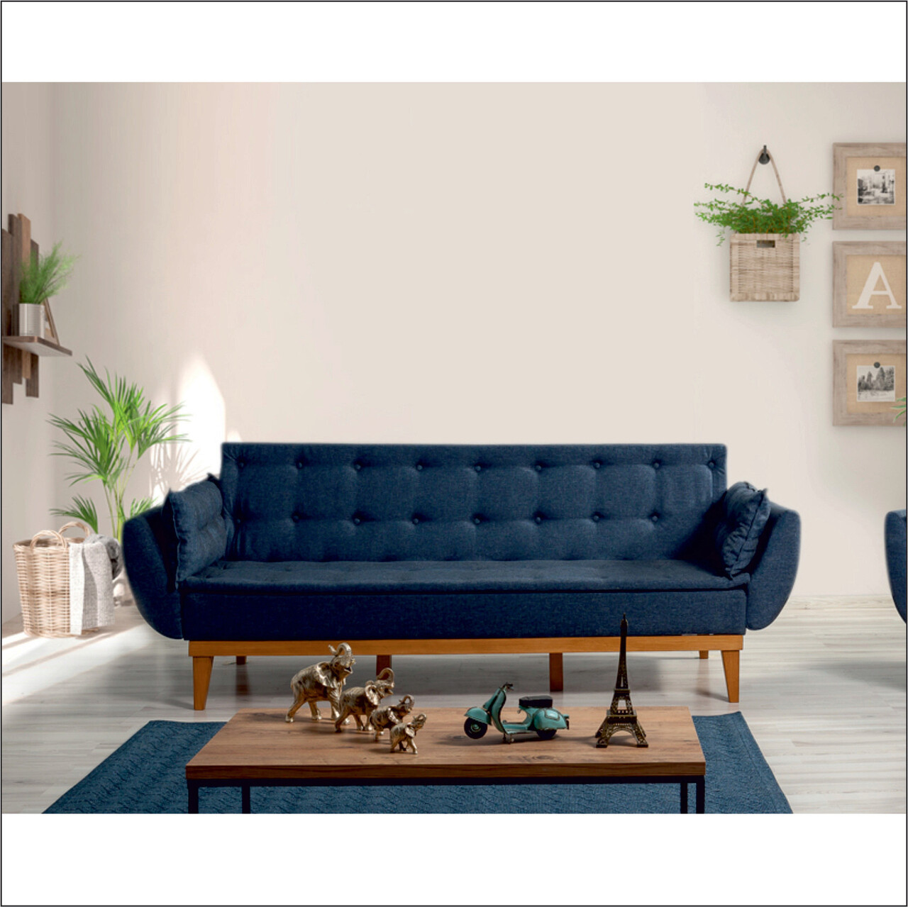 Canapea extensibila cu 3 locuri, Unique Design, 867UNQ1331, Lemn de carpen, Albastru inchis