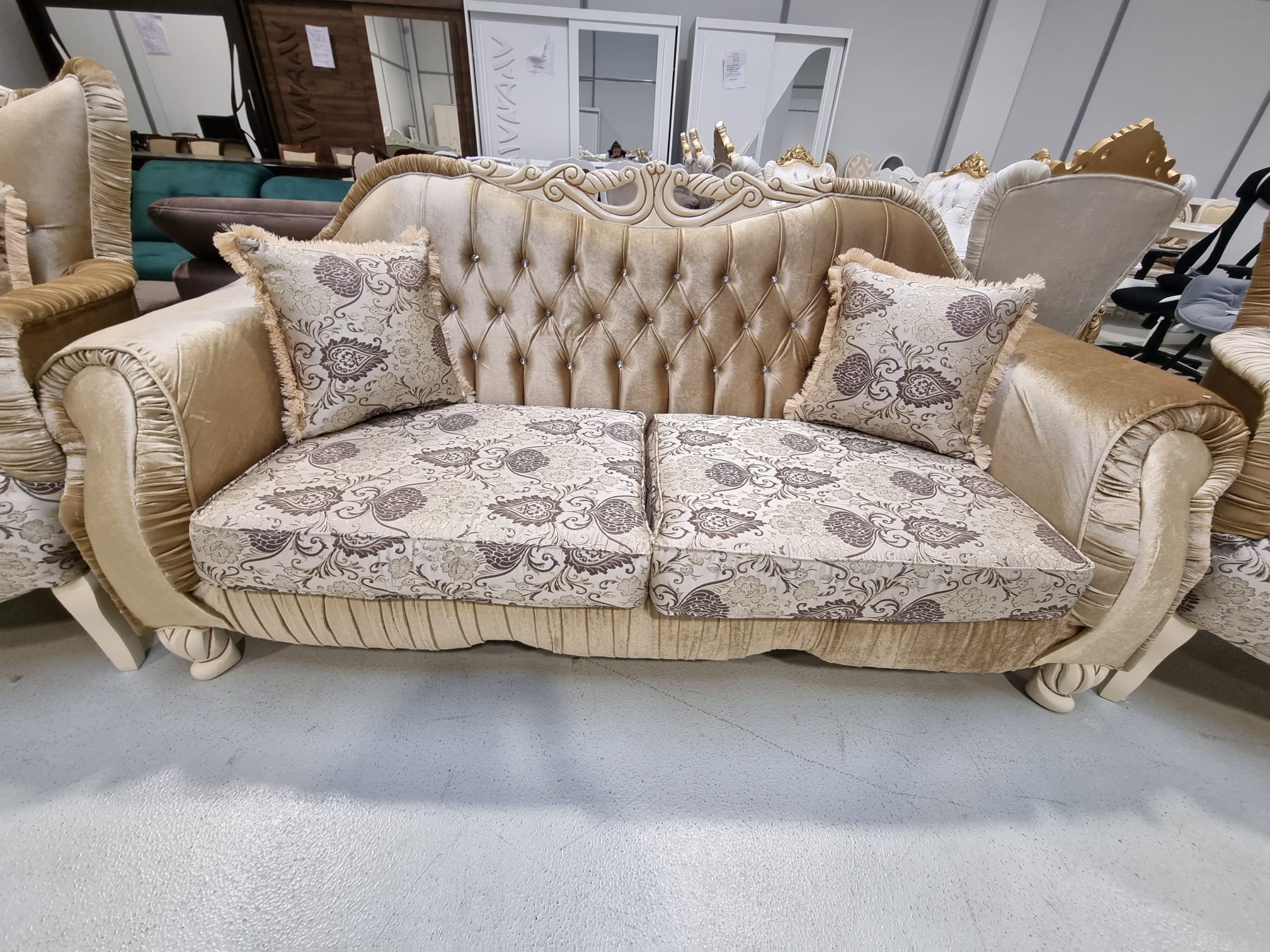 Transport Gratuit in orice Localitate Telefon 0748995511 Canapea fixa 3 locuri Dimensiune lungime 215 cm adancime 90 inaltime 100 cm Modelul de pe materialul catifea de calitate superioară din care este realizata canapeaua se regăsește și pe pernele decorative care reflectă o imagine de mare impact. Structura rezistentă îi este asigurată din materialele folosite, lemn…
