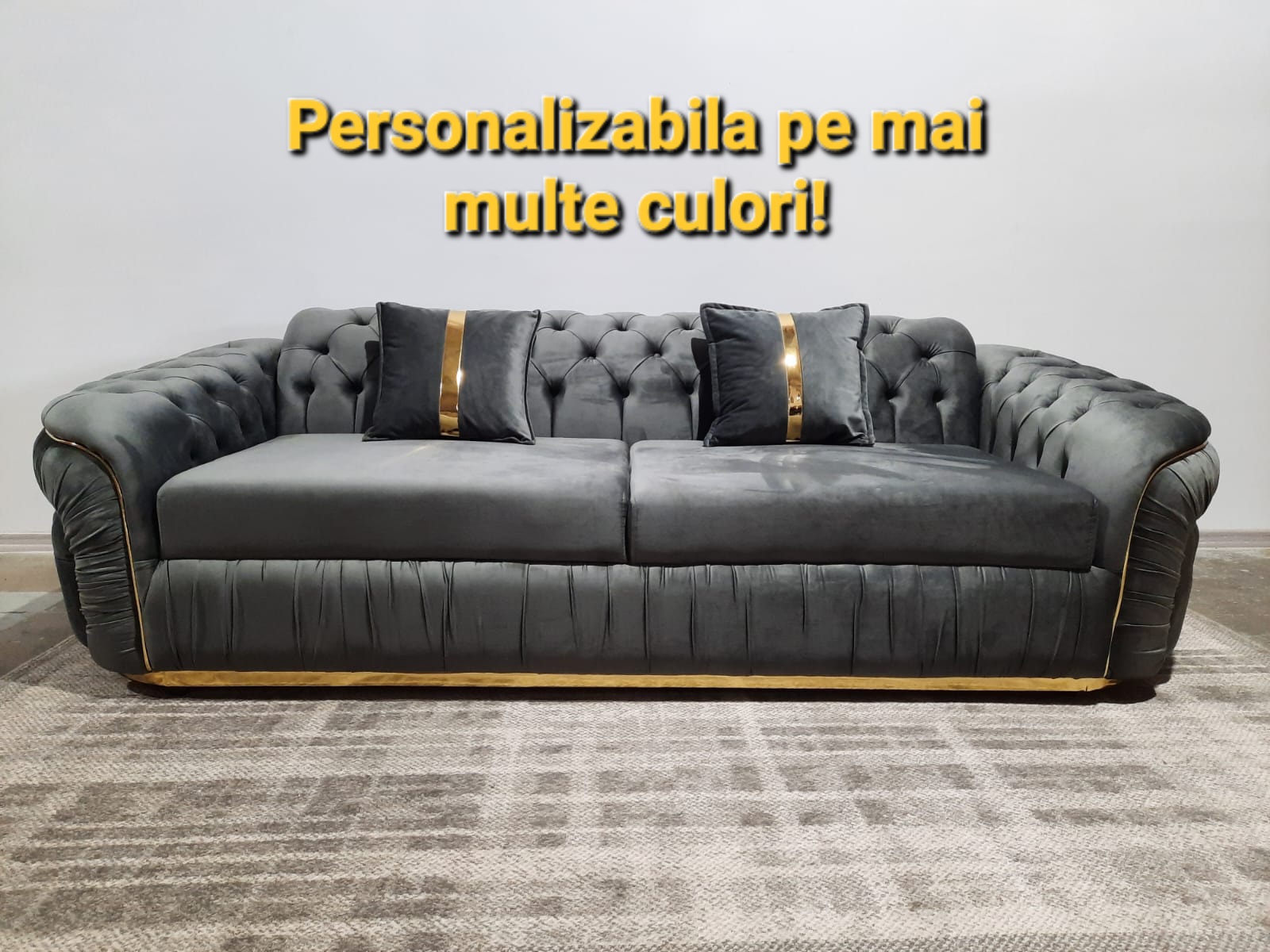 Finisajele șic într-un stil glamour fac ca piesa de mobilier să se potrivească practic în orice stil. Tapițeria aspectuoasa și moale la atingere fac canapeaua confortabila si garantează condițiile perfecte pentru relaxare. Material: Catifea Dimensiuni: 235 cm x 100 cm x 75 cm dimensiunea totala Adancime sezut – 185 cm x 60 cm Inaltime sezut…