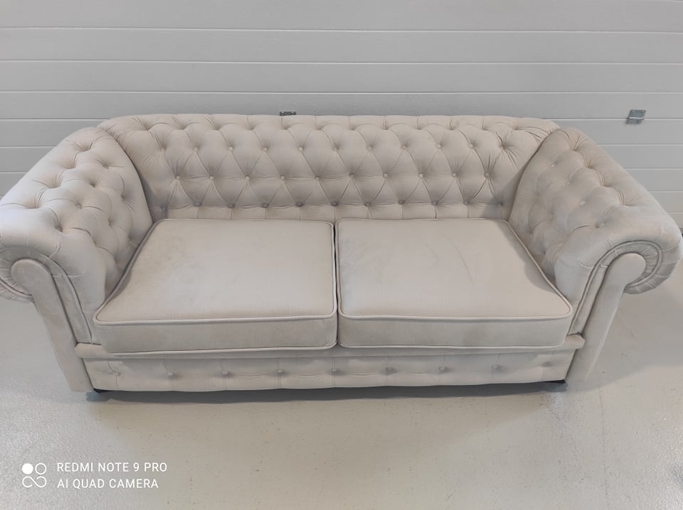 Canapea extensibila, material catifea, culoare crem. Dimensiuni- lungime 205cm, adancime totala 100cm, inaltime 74cm, inaltimea sezutului fata de sol 43cm, suprafata de dormit 195/130cm,
